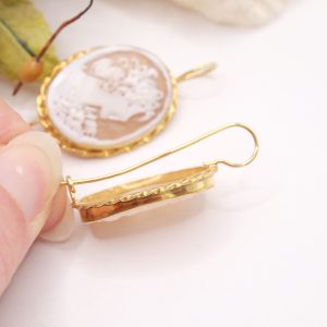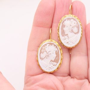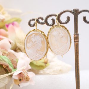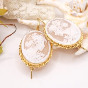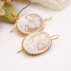 Orecchini con veri cammei in conchiglia sardonica, incisi a mano dai maestri orafi di Torre del Greco a motivo di Donna con cornice a torchon