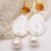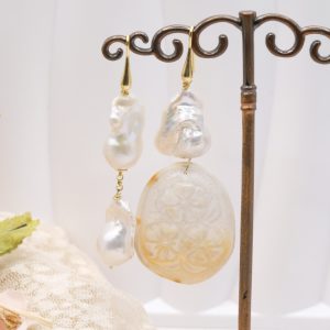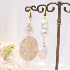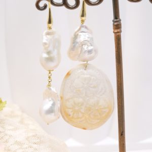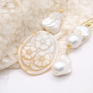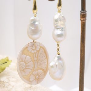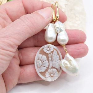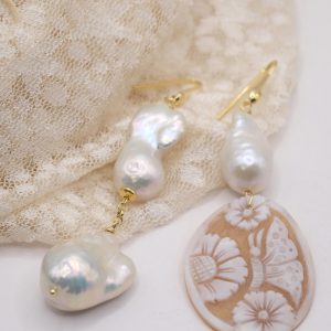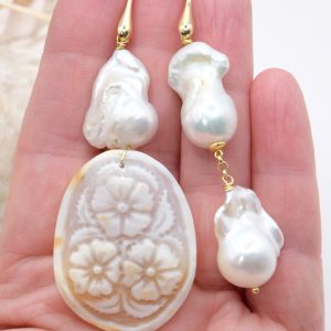 Orecchini “diversi”, uno con con vero cammeo in conchiglia, inciso a mano dai maestri artigiani di Torre del Greco a motivo di fiori con una perla, l’altro monta 2 perle naturali barocche