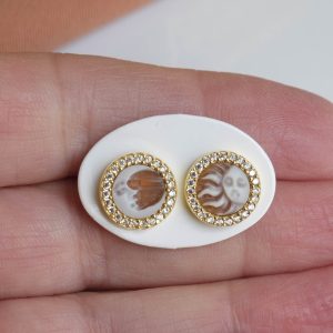 Orecchini con veri cammei in conchiglia sardonica, incisi a mano dai maestri orafi di Torre del Greco a motivo di Sole e Luna, e brillanti zirconi.