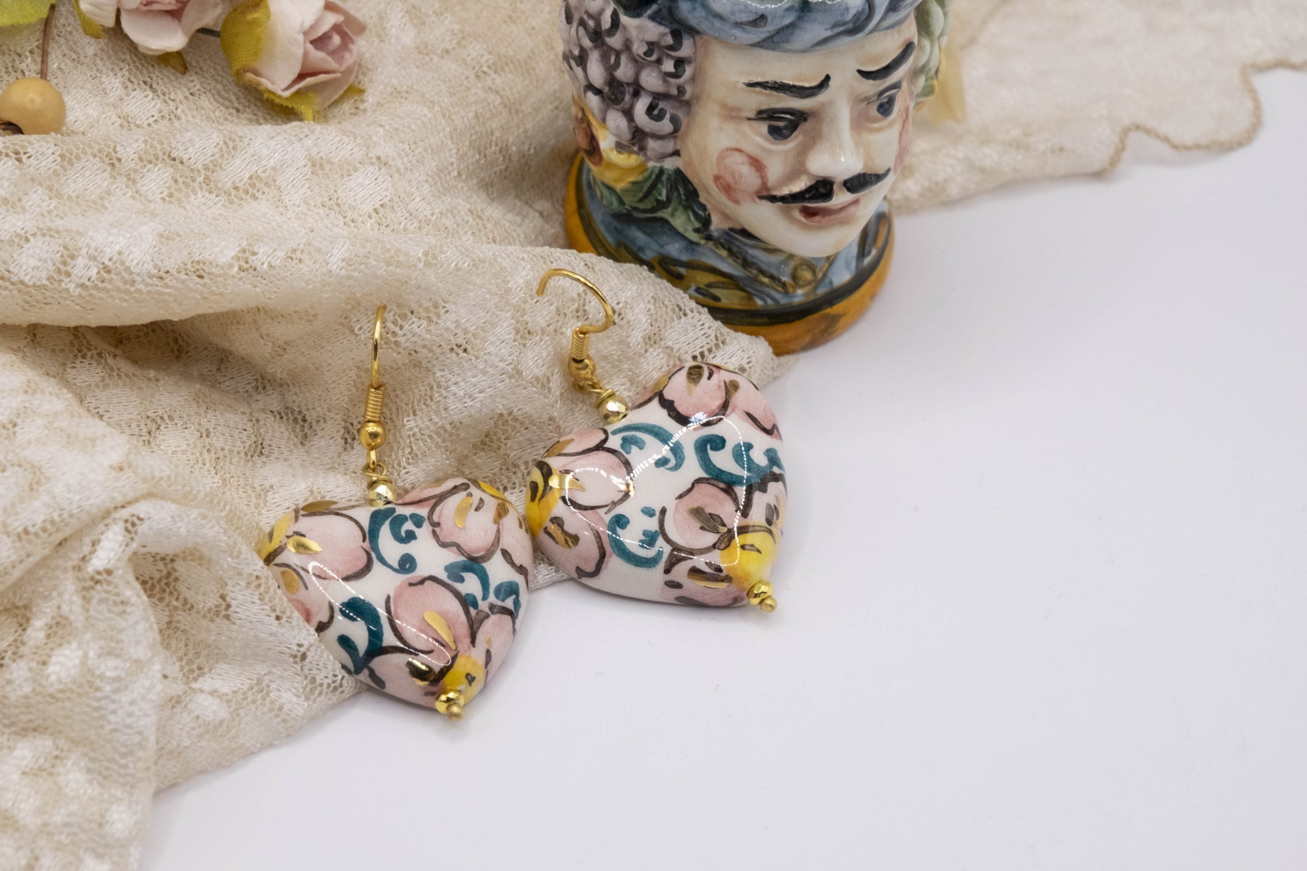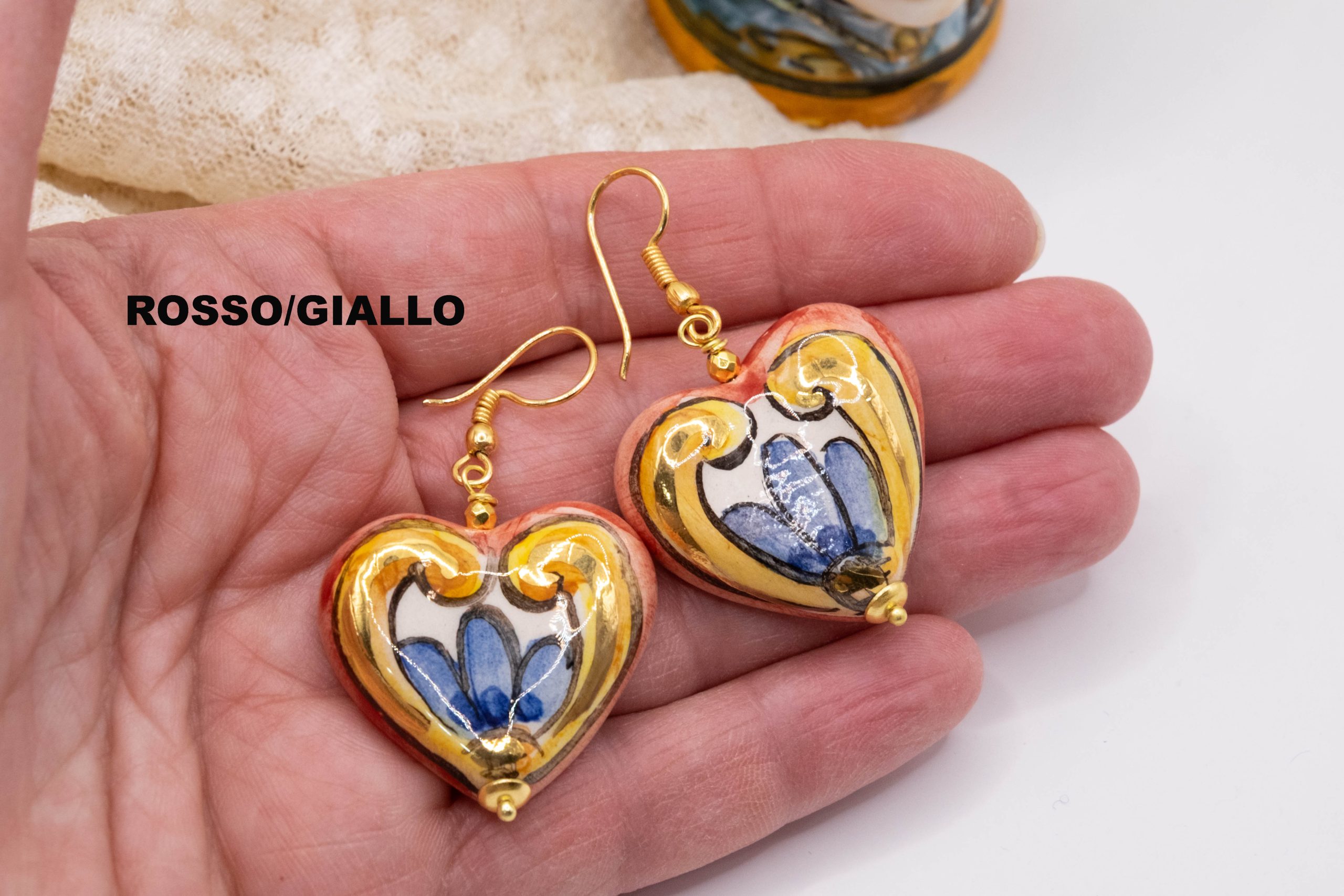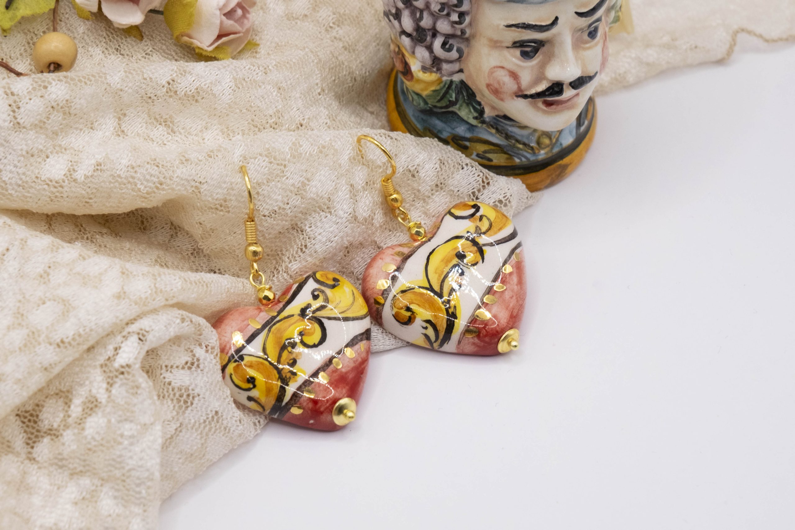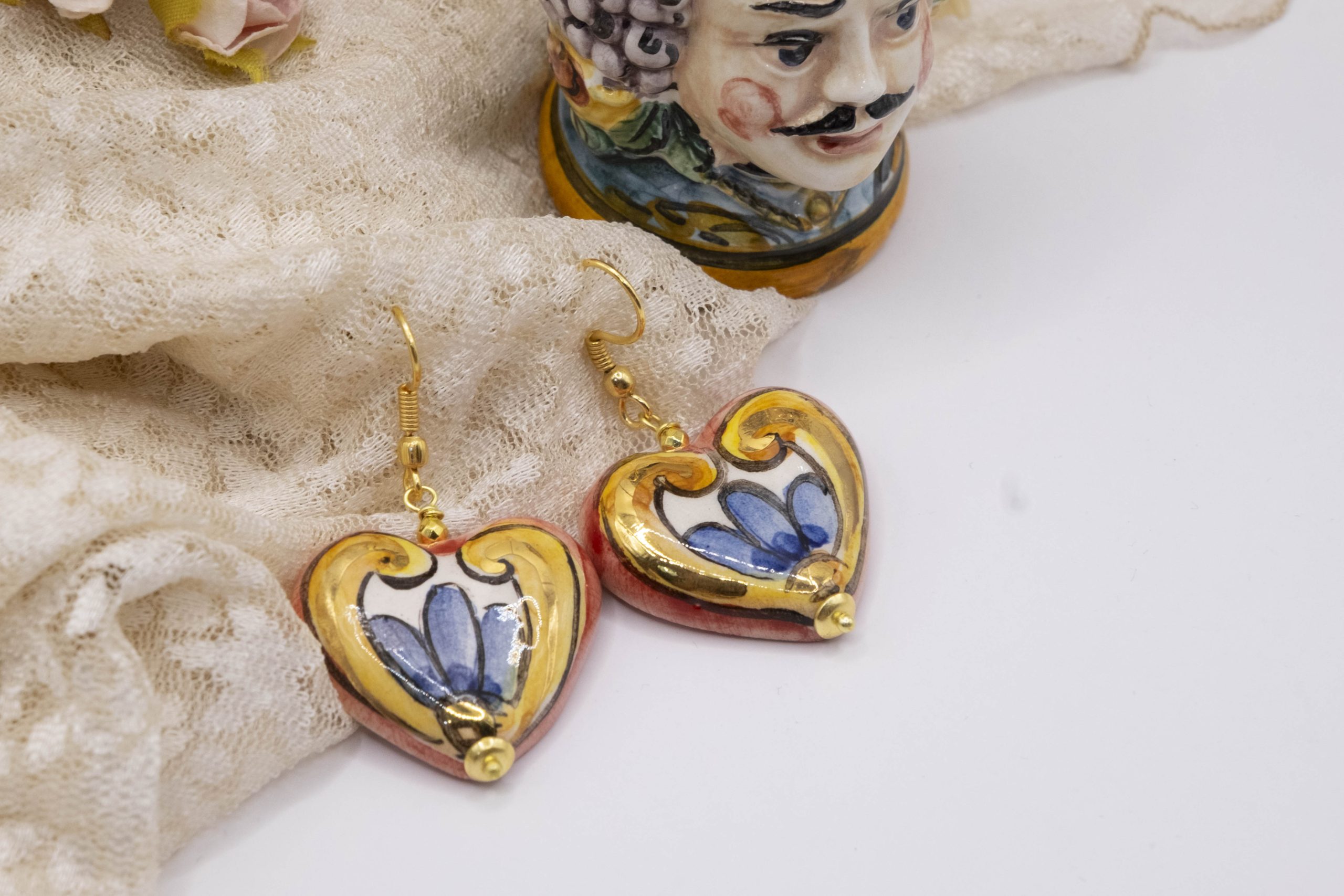 Orecchini Siciliani a Cuore in ceramica di Caltagirone, dipinti a mano con dettagli in oro zecchino