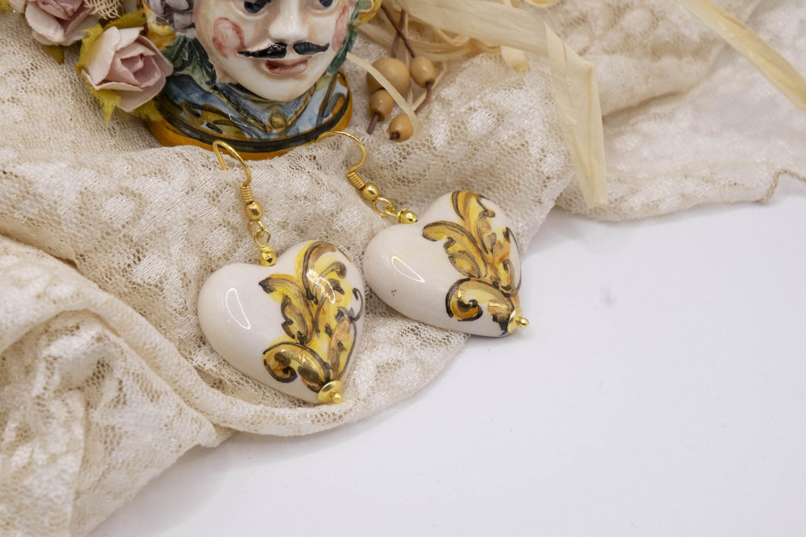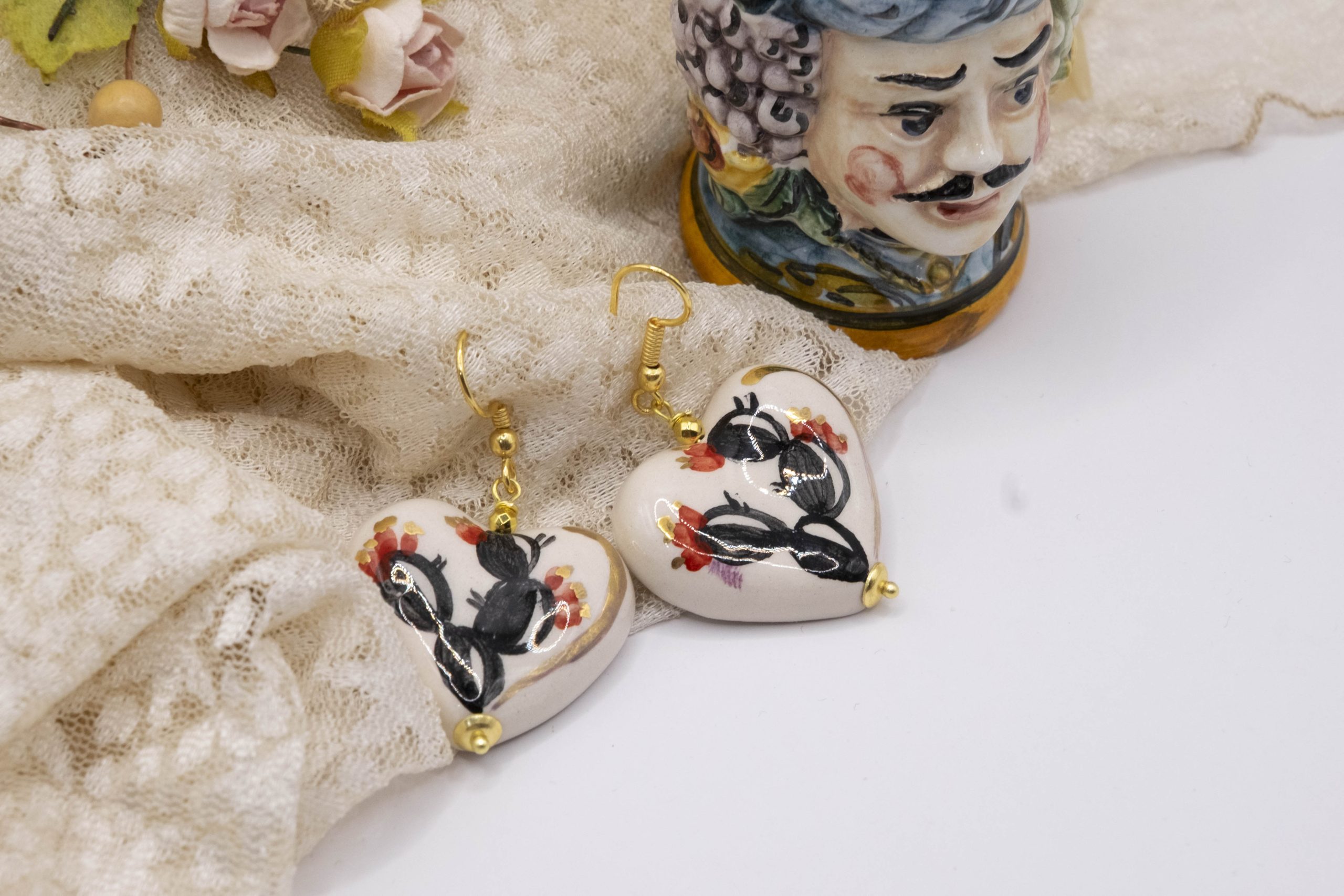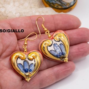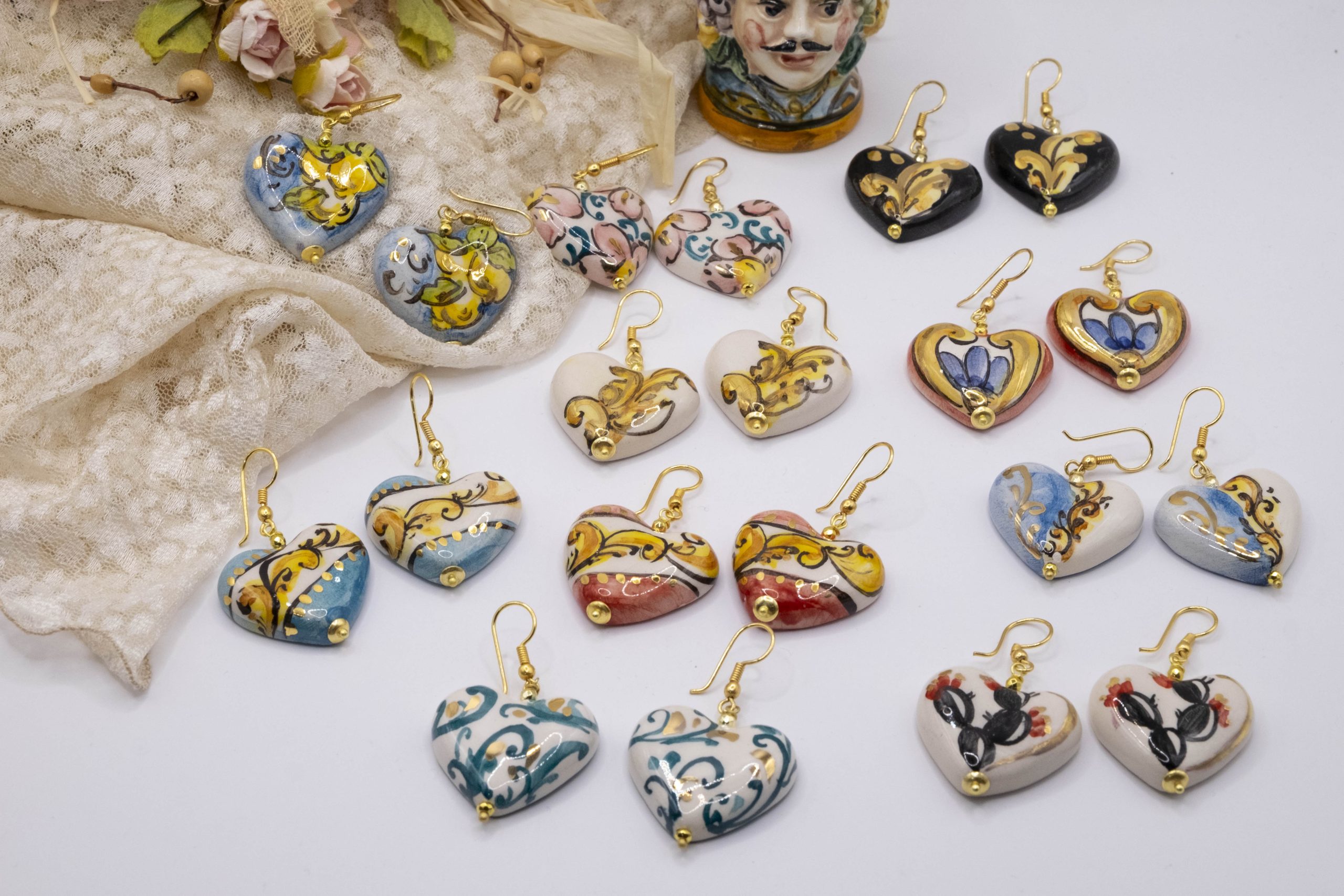 Orecchini Siciliani a Cuore in ceramica di Caltagirone, dipinti a mano con dettagli in oro zecchino