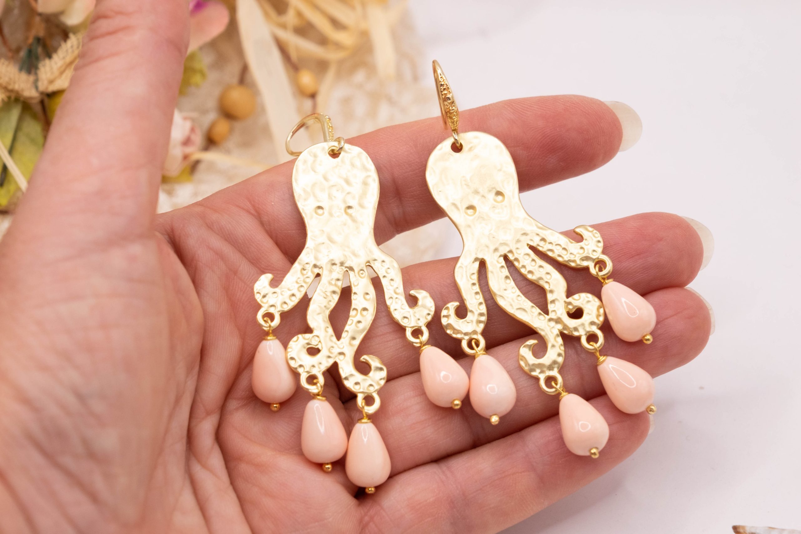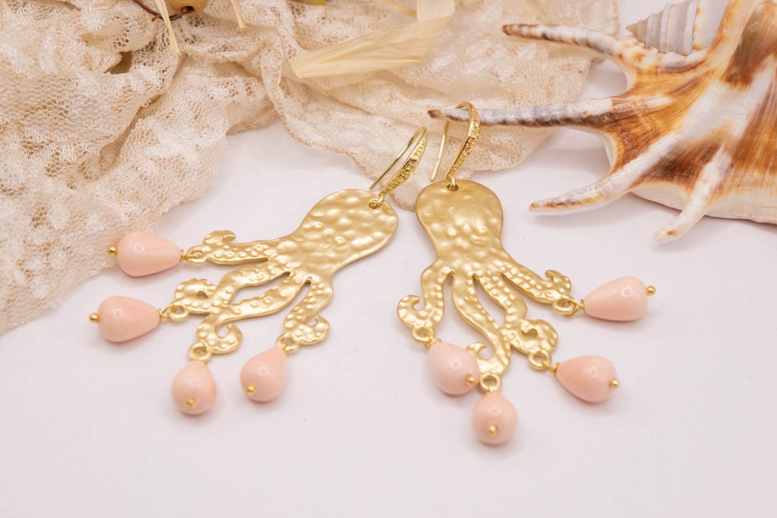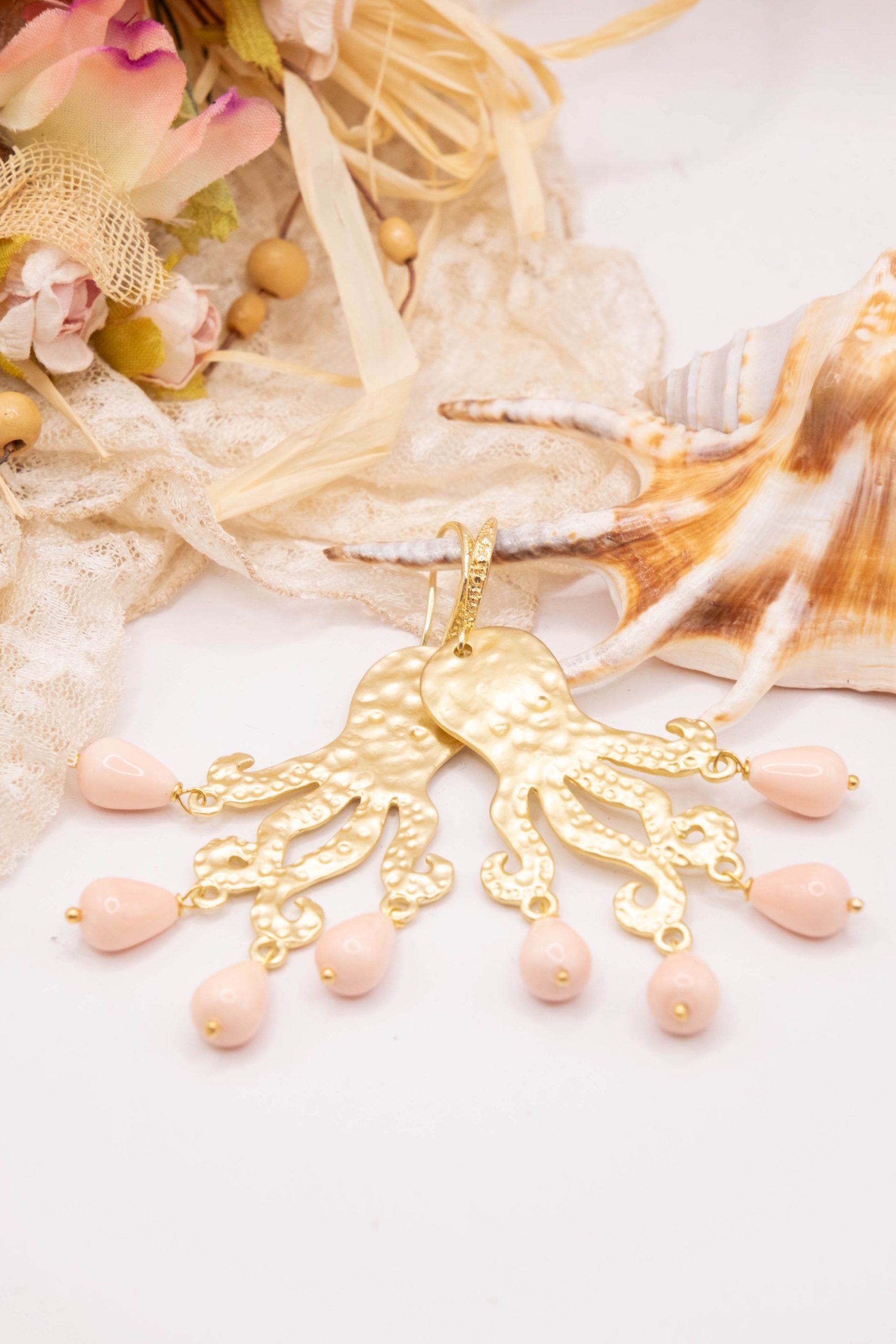 Orecchini con Polpo ottone perle rosa