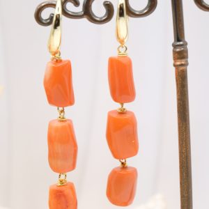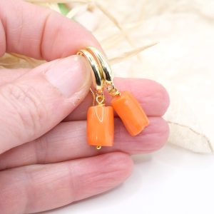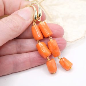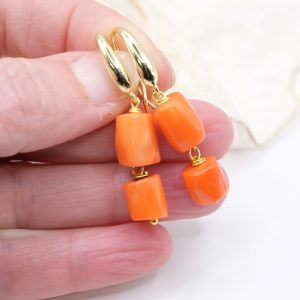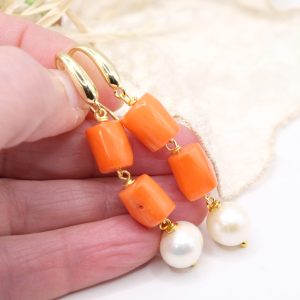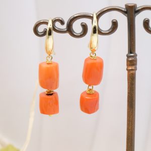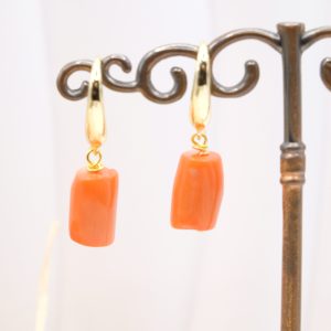 Orecchini dal design molto accattivante, con di barilotti in corallo Bamboo arancio/salmone disponibili in 4 versioni con o senza perle