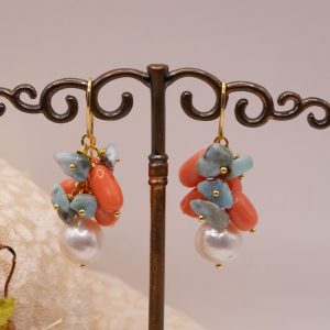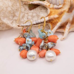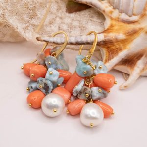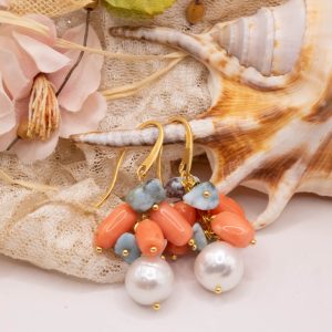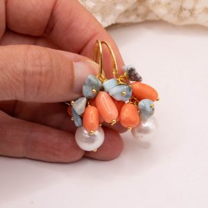 Orecchini dal design molto accattivante, con grappolo di barilotti in corallo Bamboo rosa salmone, larimar e perle naturali luminose