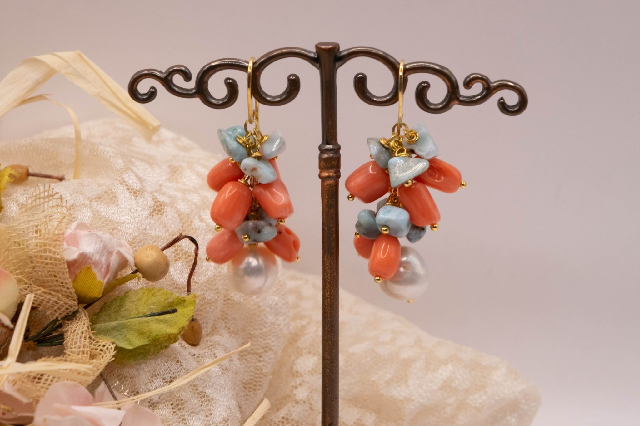 Un gioiello raffinato e ricco di fascino, realizzato con grappolo di barilotti in corallo Bamboo rosa salmone, larimar dalle delicate sfumature azzurre e perle naturali dalla luminosità elegante.