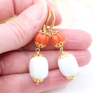 Orecchini pendenti con corniola e barilotto in agata bianca rigati