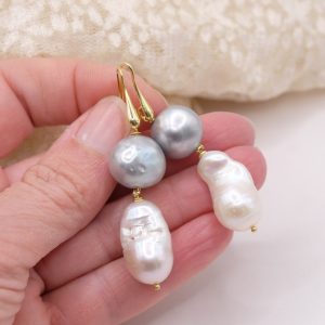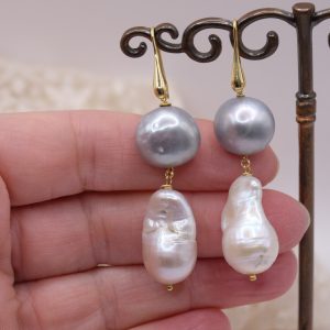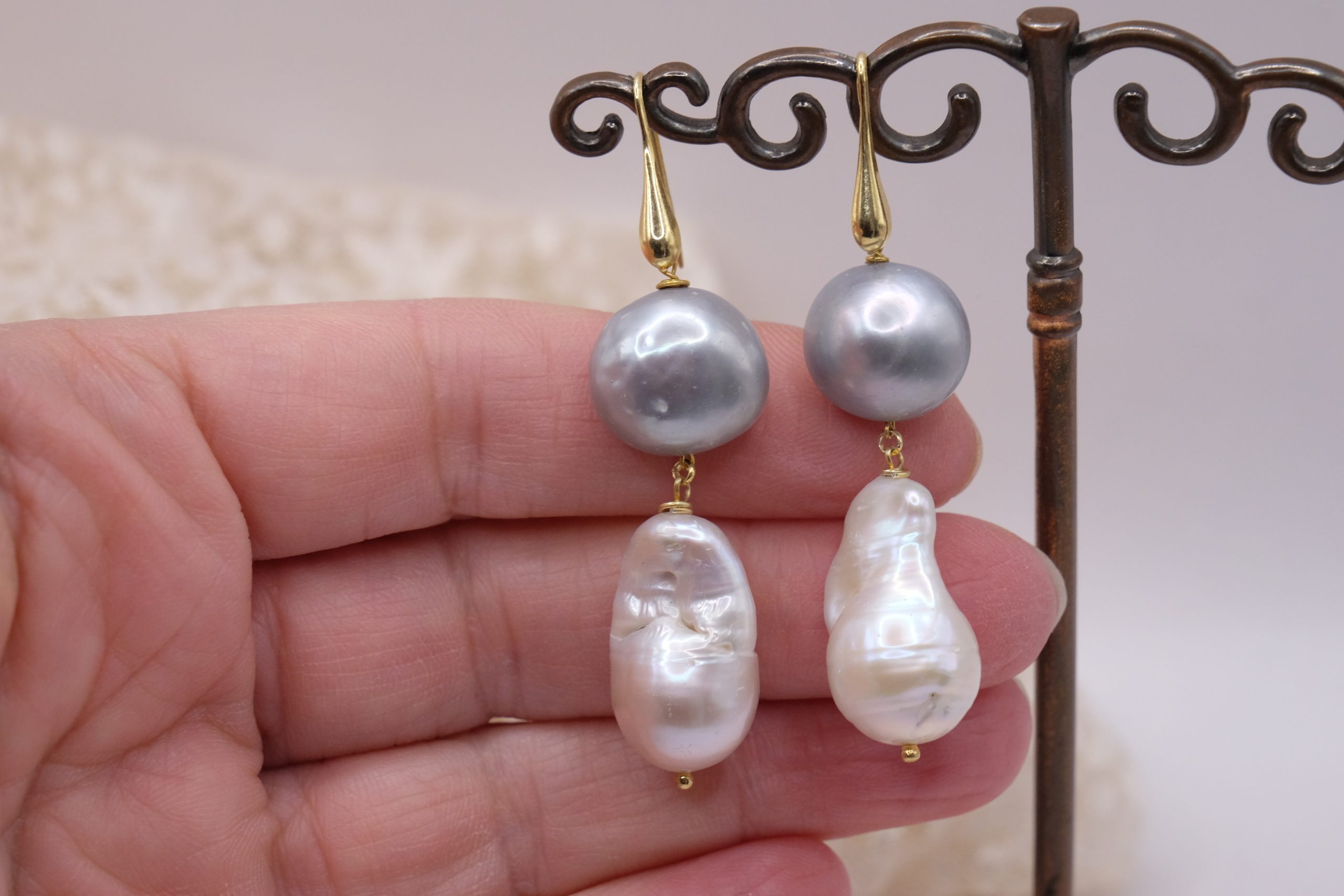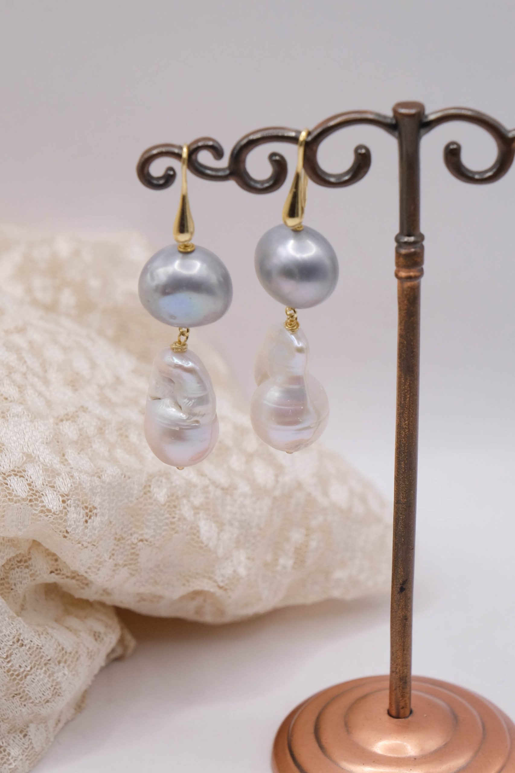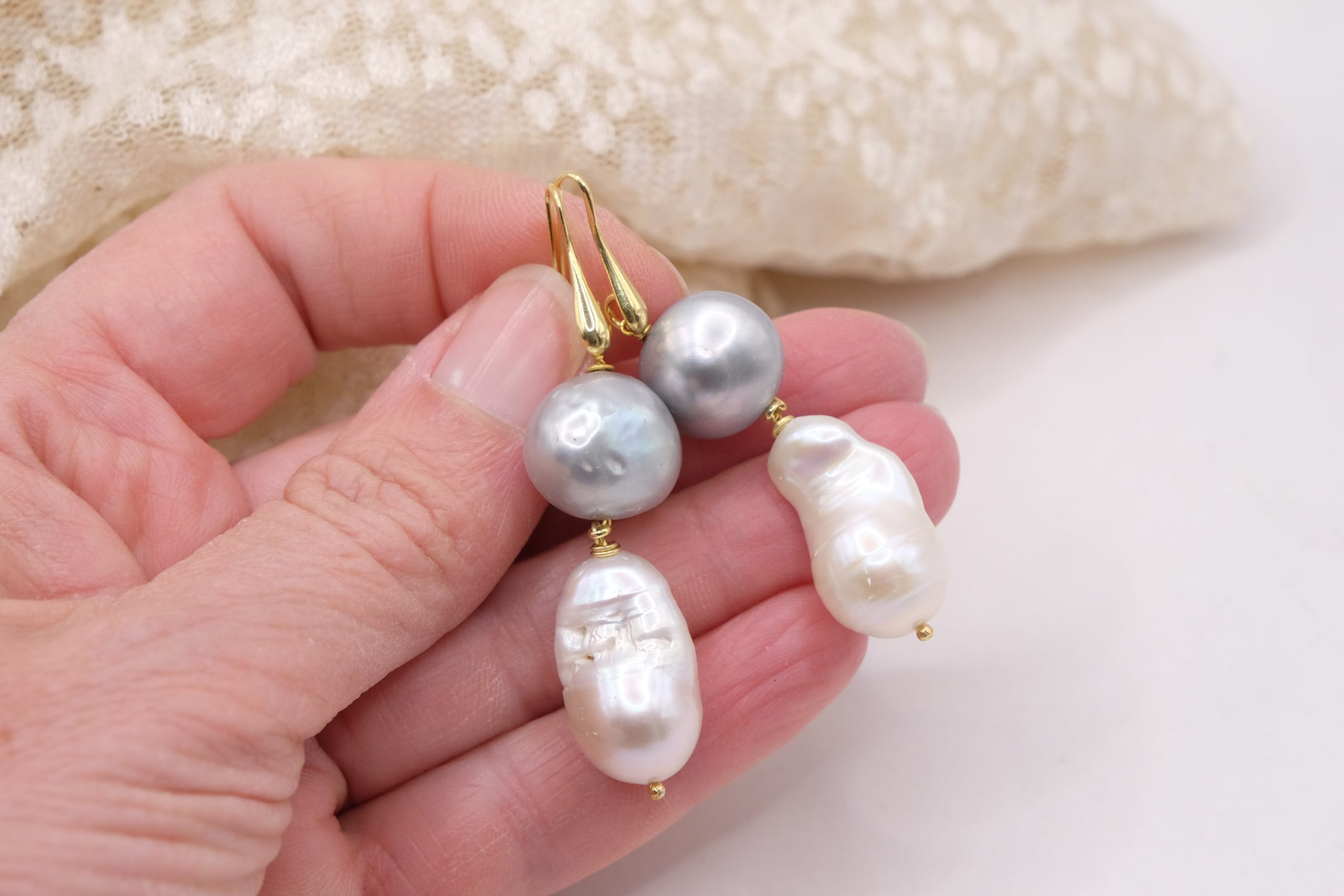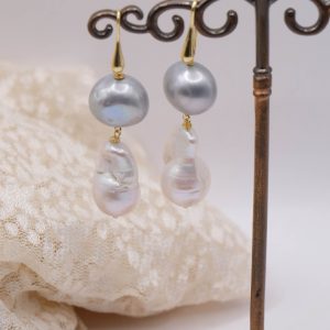 La composizione unisce una perla barocca bianca a goccia, ricca di fascino e irregolarità preziose, a una perla grigia tondeggiante da 14 mm, leggermente piatta e sorprendentemente luminosa 🌫️🤍