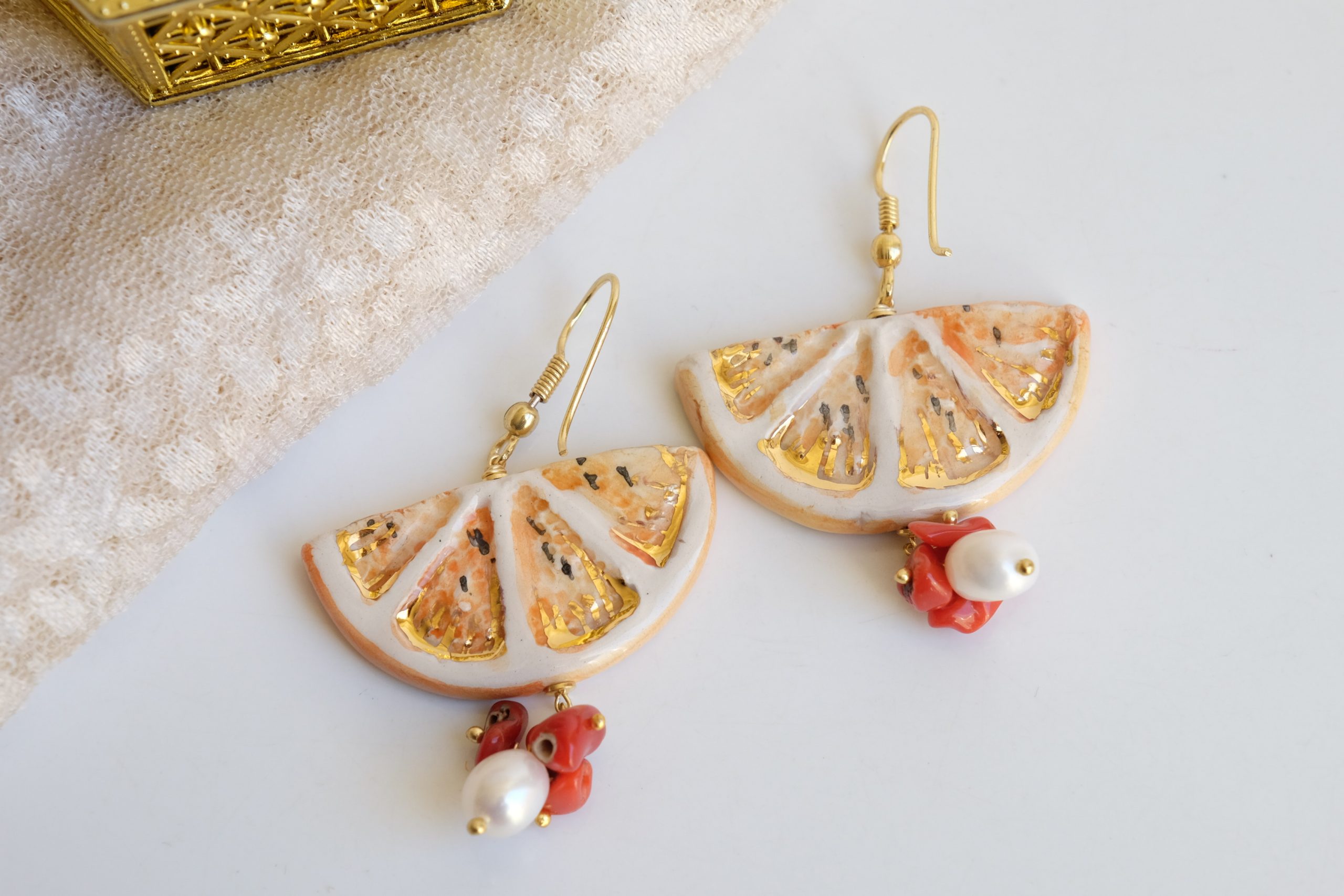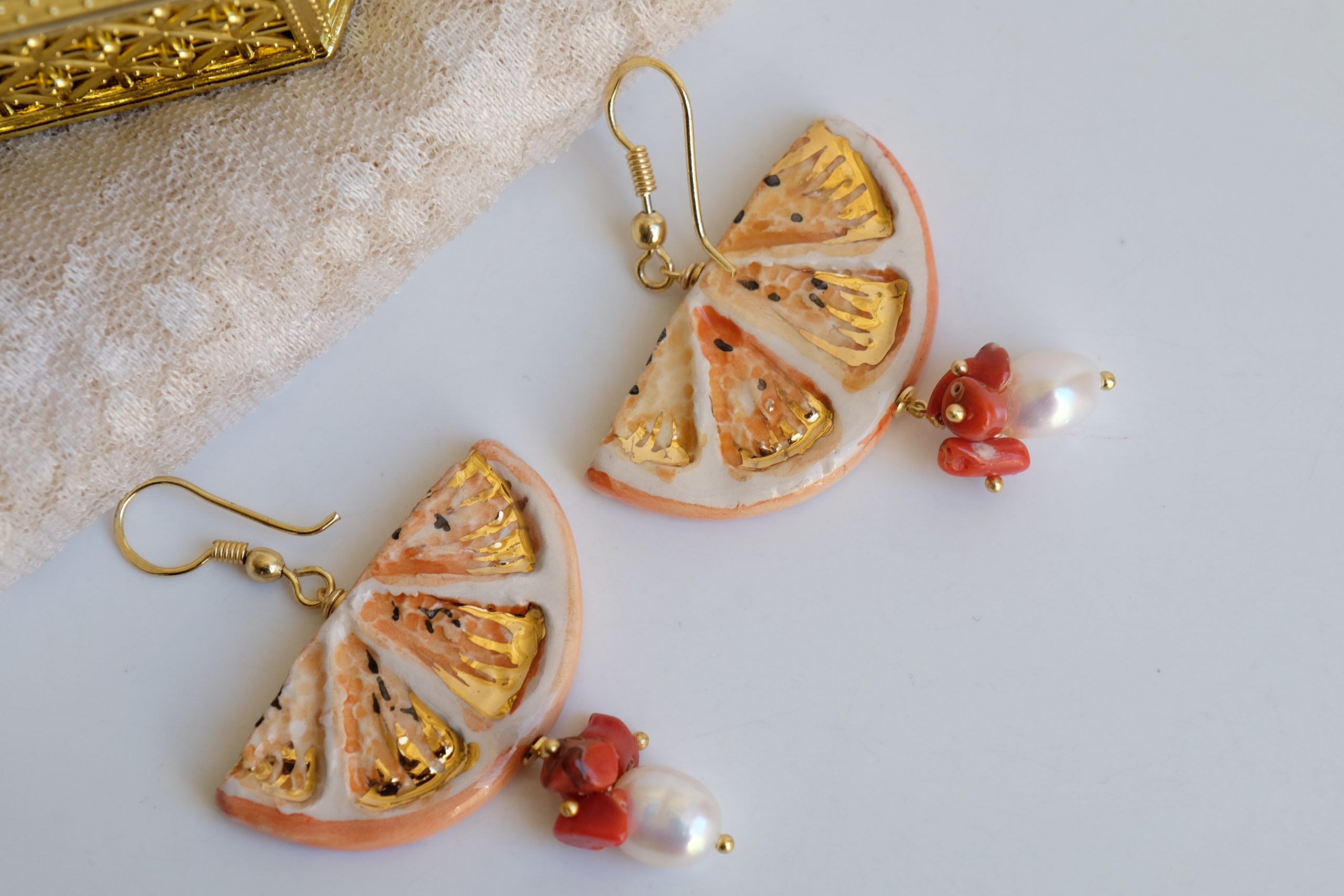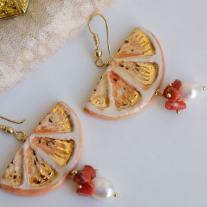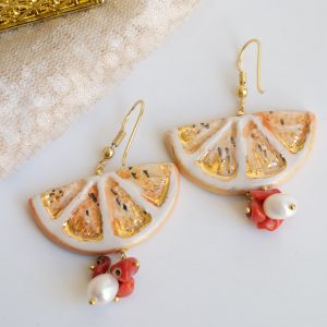 Orecchini Fetta di Limone in ceramica con Corallo e Perle
