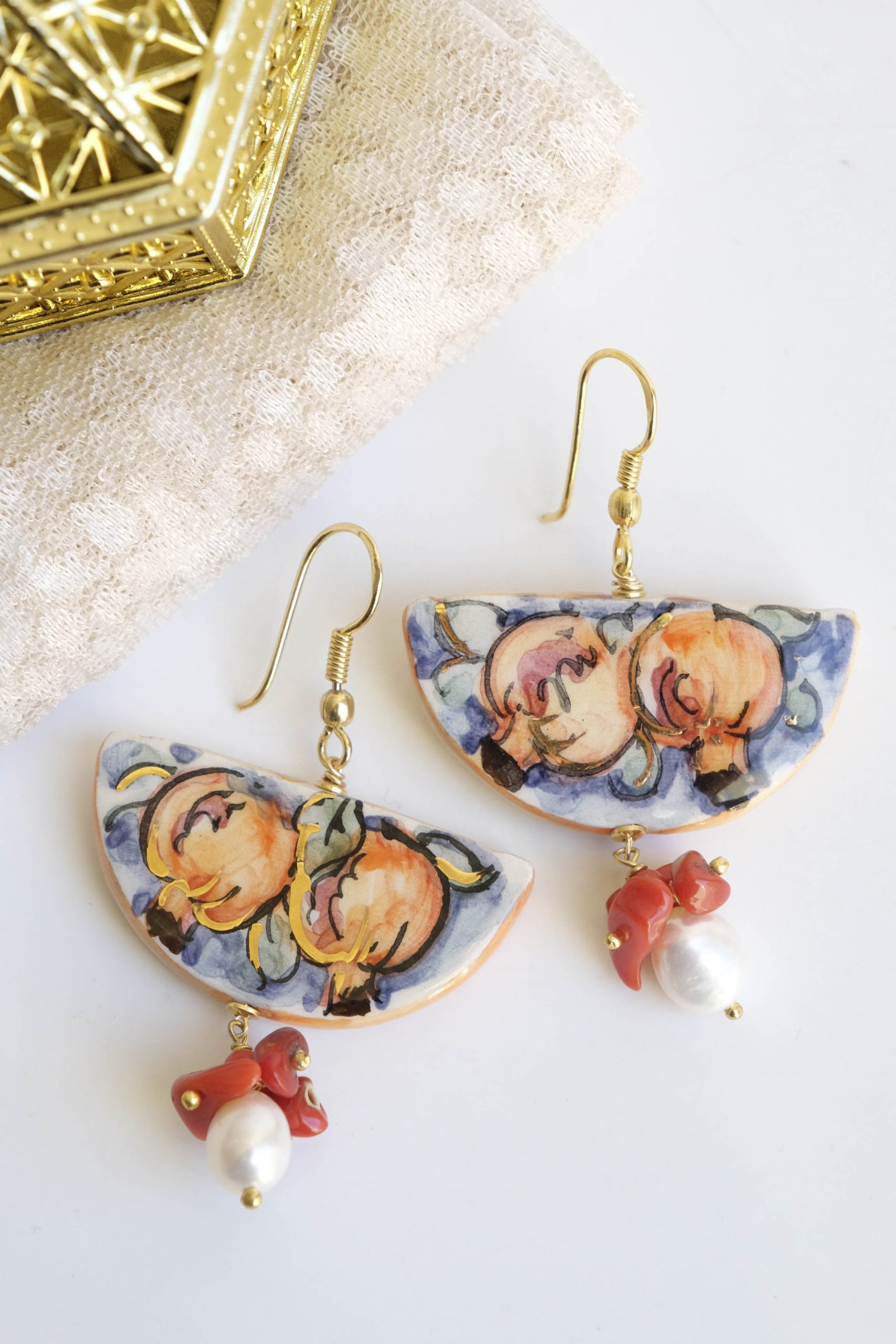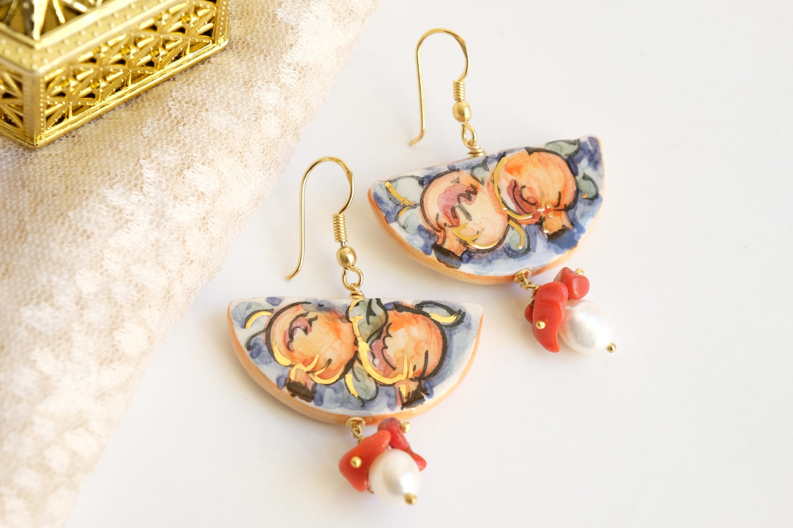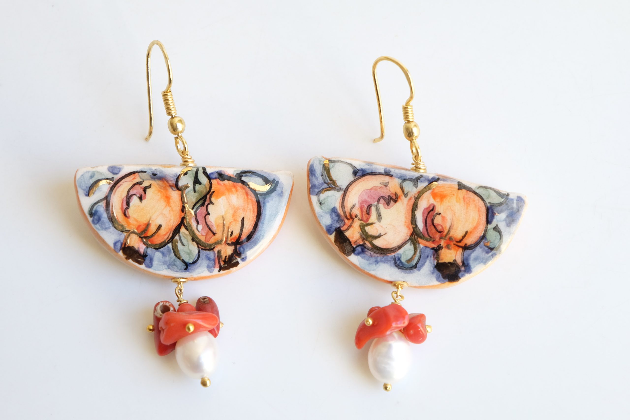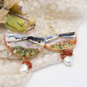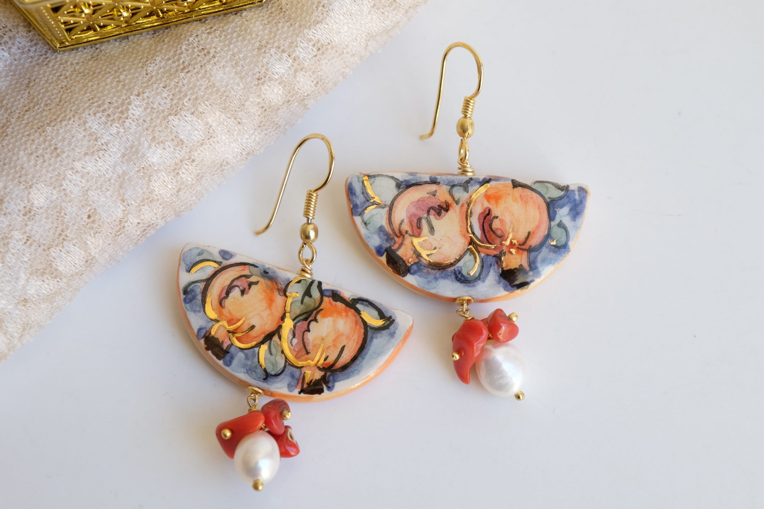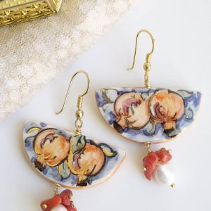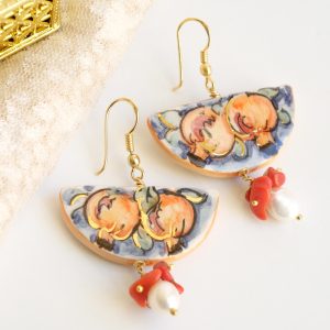 Orecchini unici, che raccontano la Sicilia in ogni dettaglio. Una fetta dei tradizionali limoni siciliani in ceramica di Caltagirone dipinta a mano con dettagli in oro zecchino. Dall’altro lato della fetta, un tradizionale dipinto siciliano.