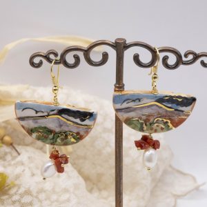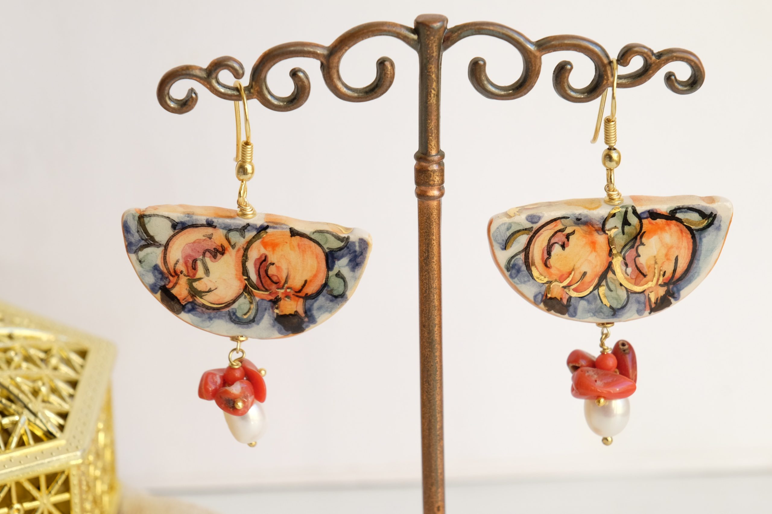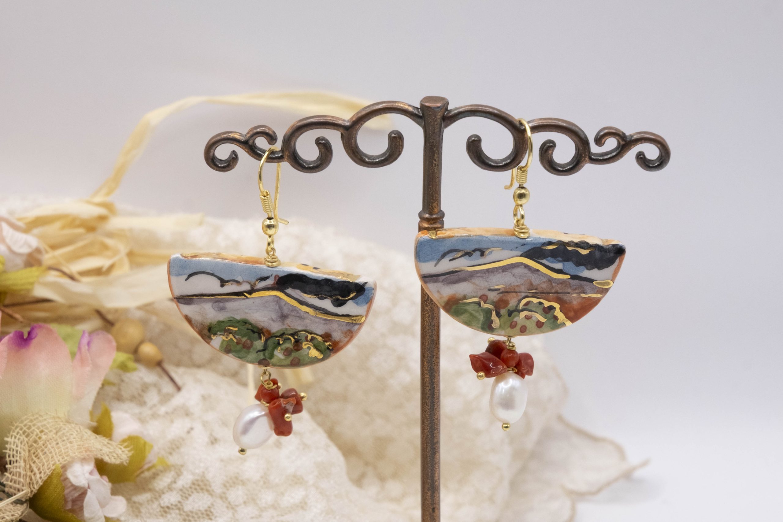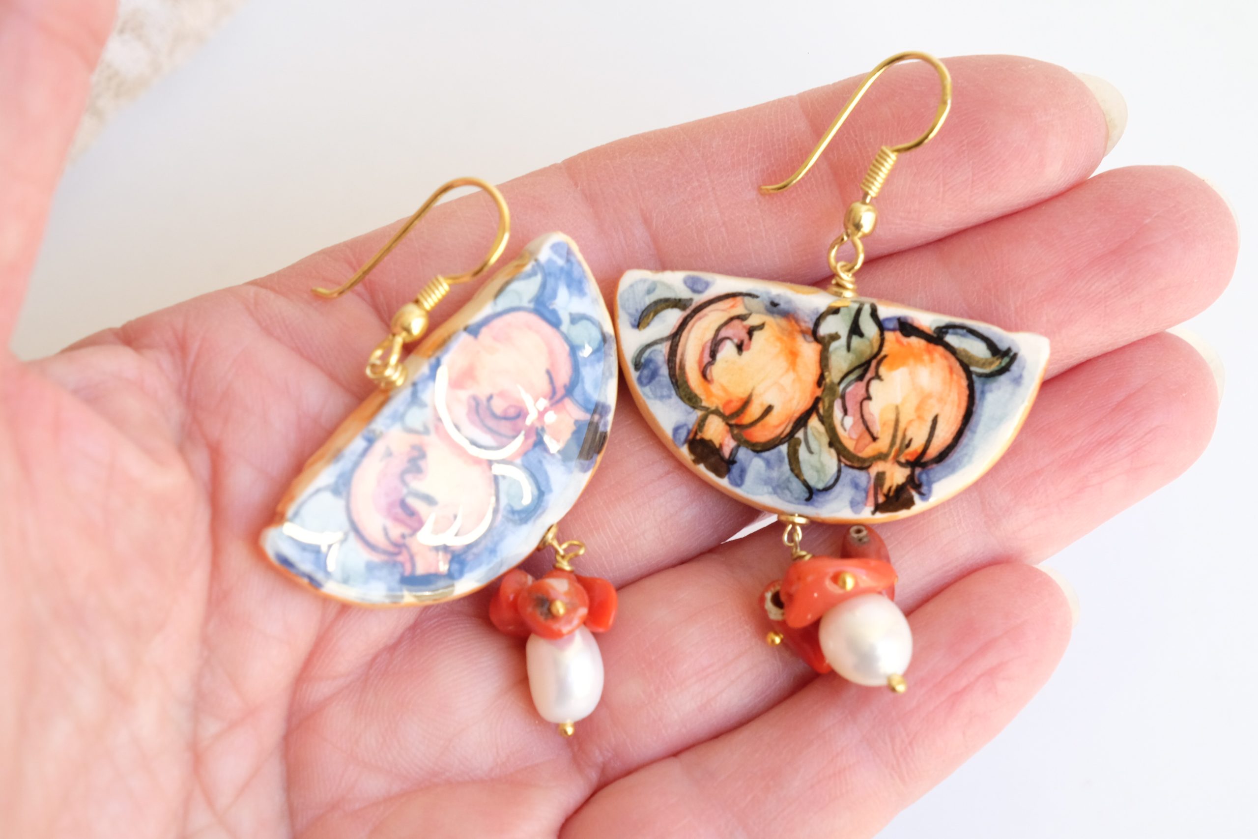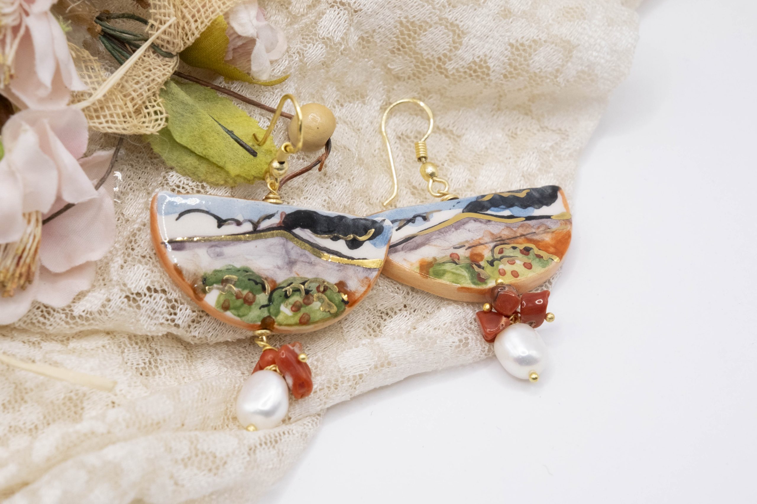 Orecchini unici, che raccontano la Sicilia in ogni dettaglio. Una fetta dei tradizionali limoni siciliani in ceramica di Caltagirone dipinta a mano con dettagli in oro zecchino. Dall’altro lato della fetta, un tradizionale dipinto siciliano.