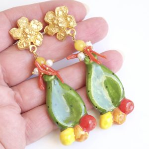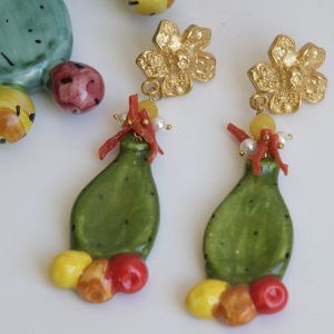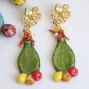 Orecchini pendenti con fichi d’india realizzati e decorati a mano in ceramica artistica di Caltagirone, giada gialla, perle di maiorca e corallo naturale.