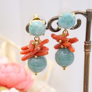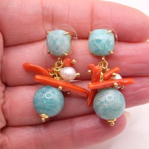 Orecchini Grappolo Amazzonite Corallo Perle Perno