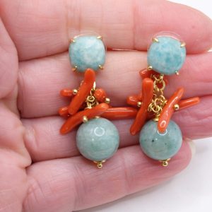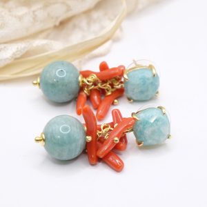 Orecchini con sfera in amazzonite e grappolo di perle e corallo naturali o solo corallo
