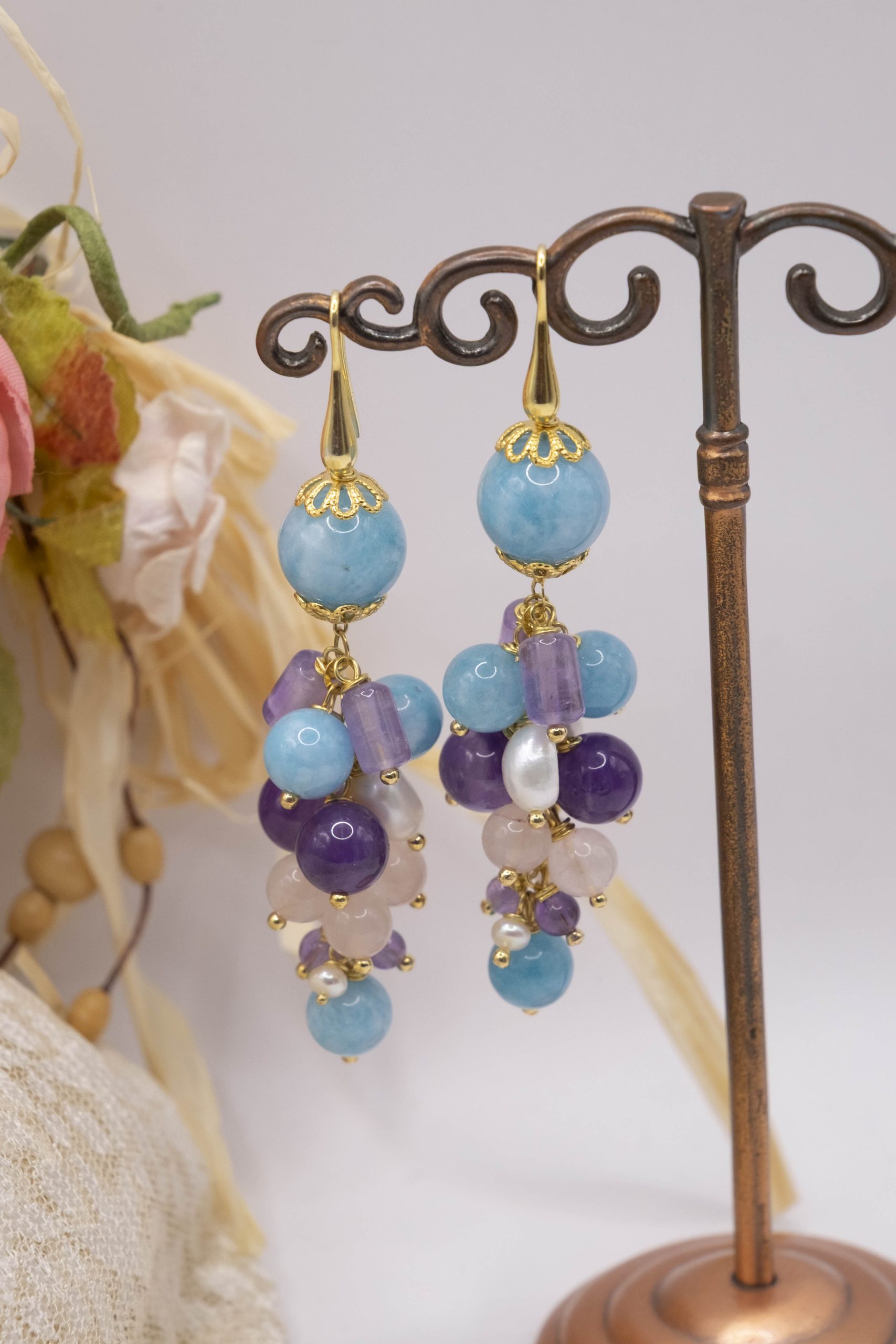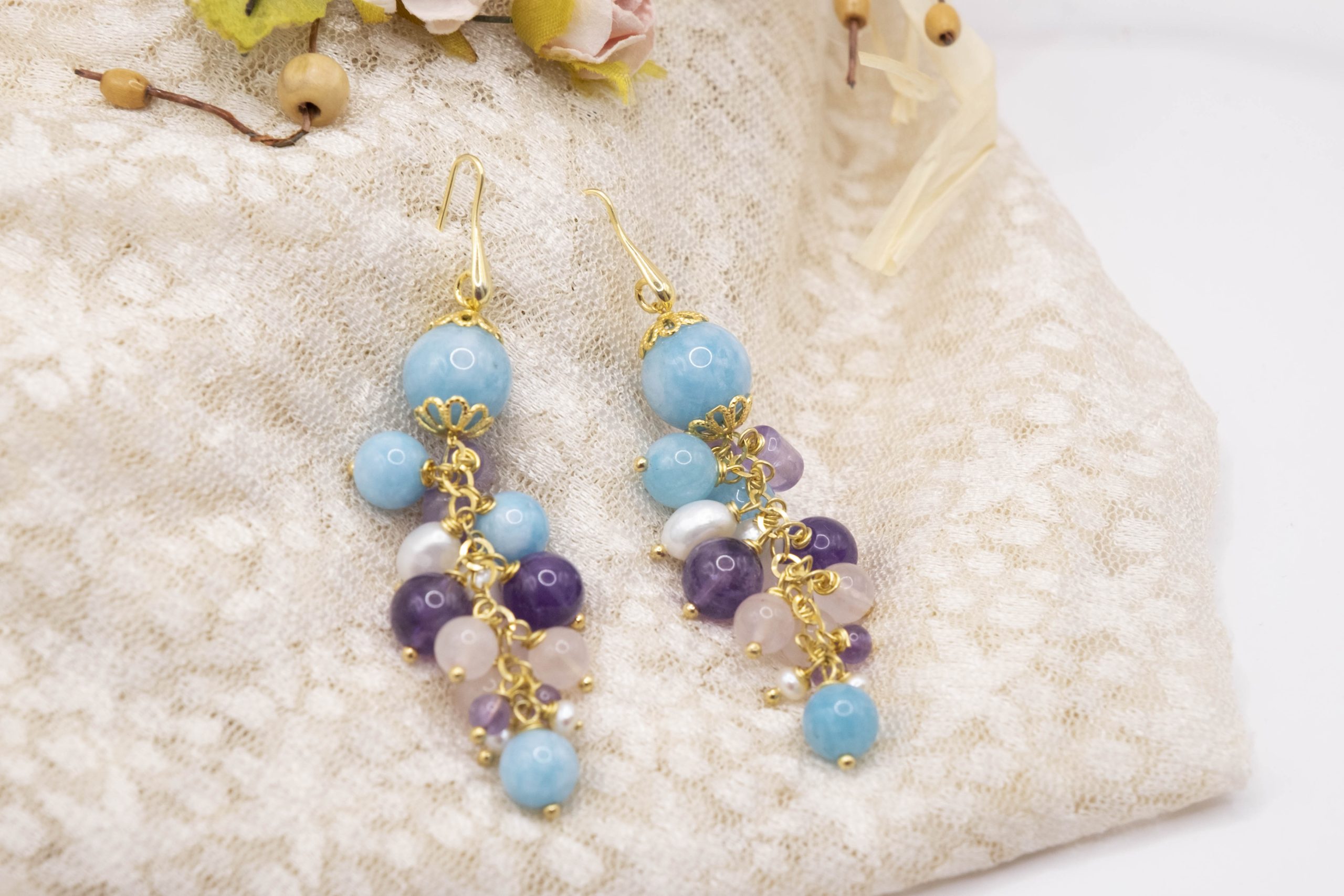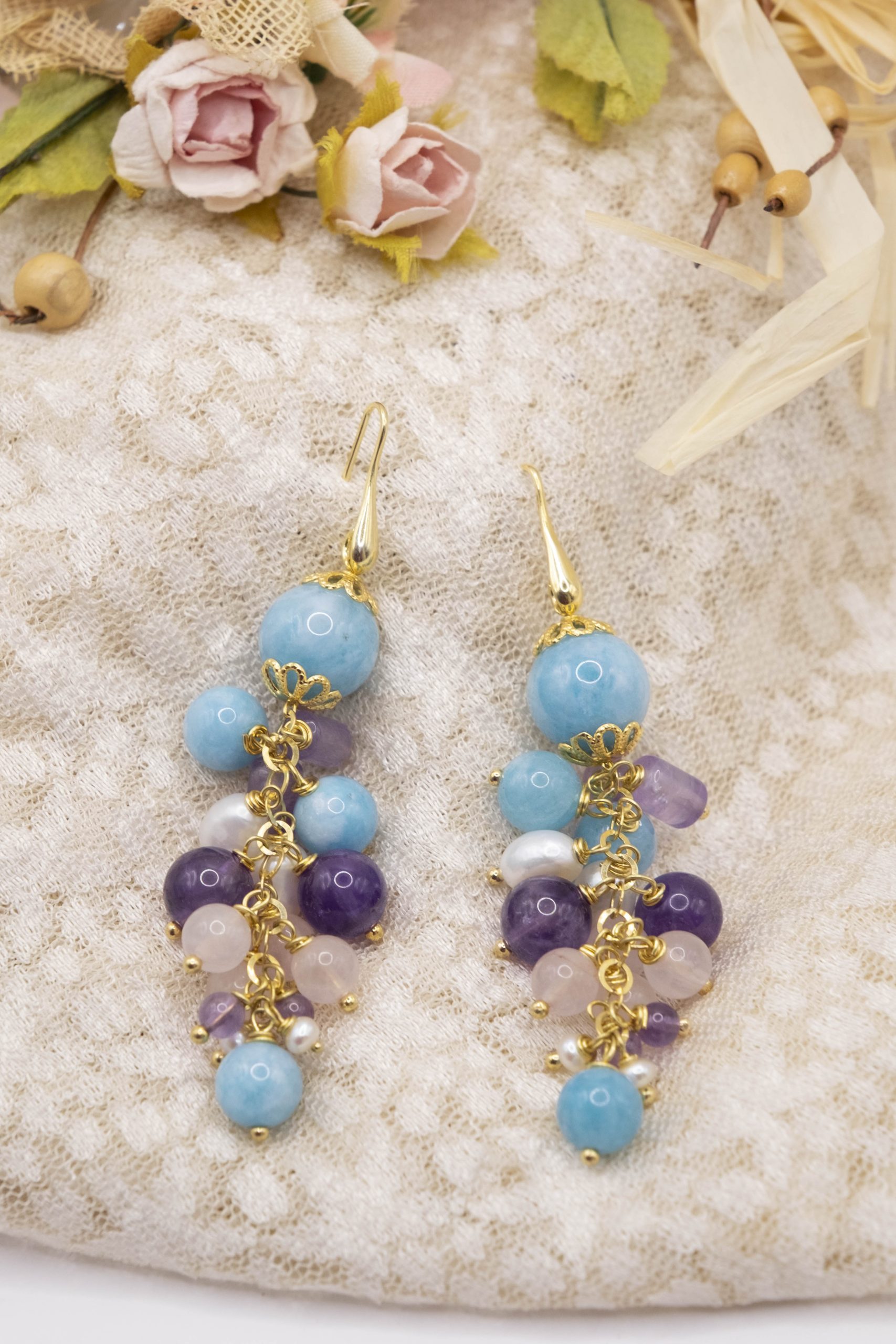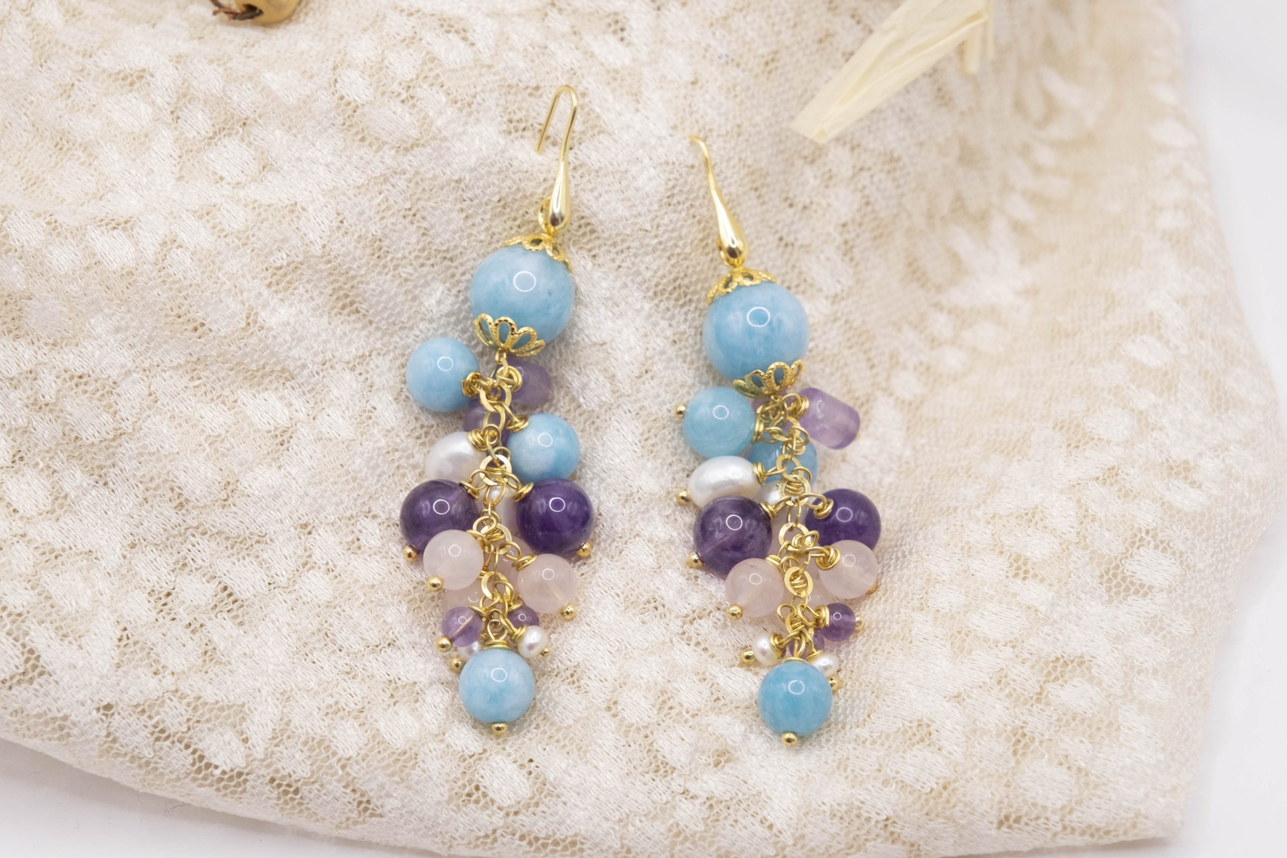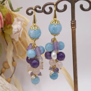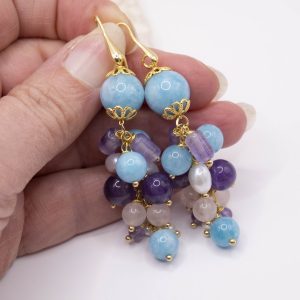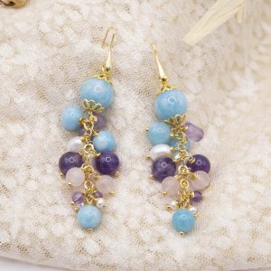 Orecchini Grappolo Angelite Quarzo Rosa Ametista Perle Argento Dorato