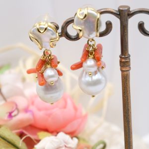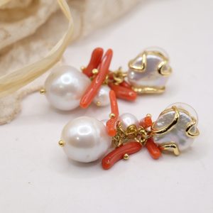Orecchini con perla e grappolo di perle e corallo naturali