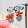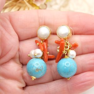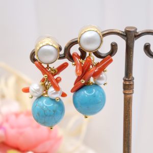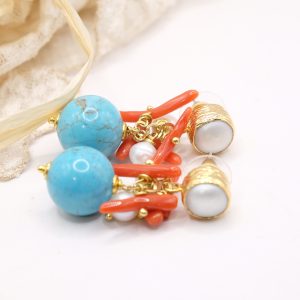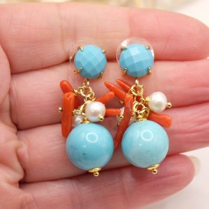 Orecchini Grappolo Turchese Corallo Perle Perno