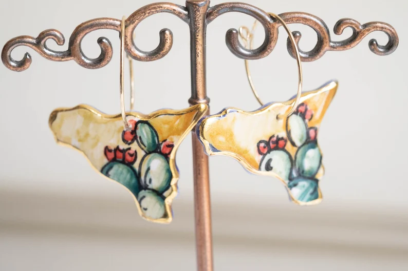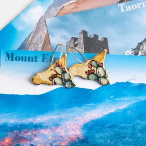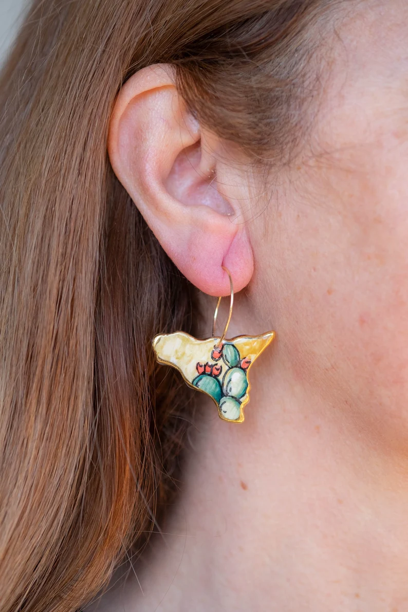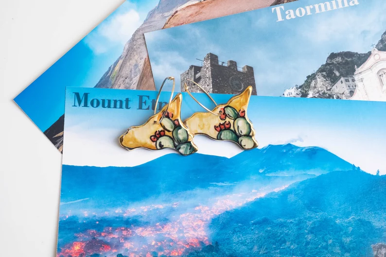 Orecchini pendenti con SICILIA da 3,5 x 2,6 cm, realizzata e dipinta a mano, in ceramica artistica di Caltagirone con foglia d’oro a 22kt.