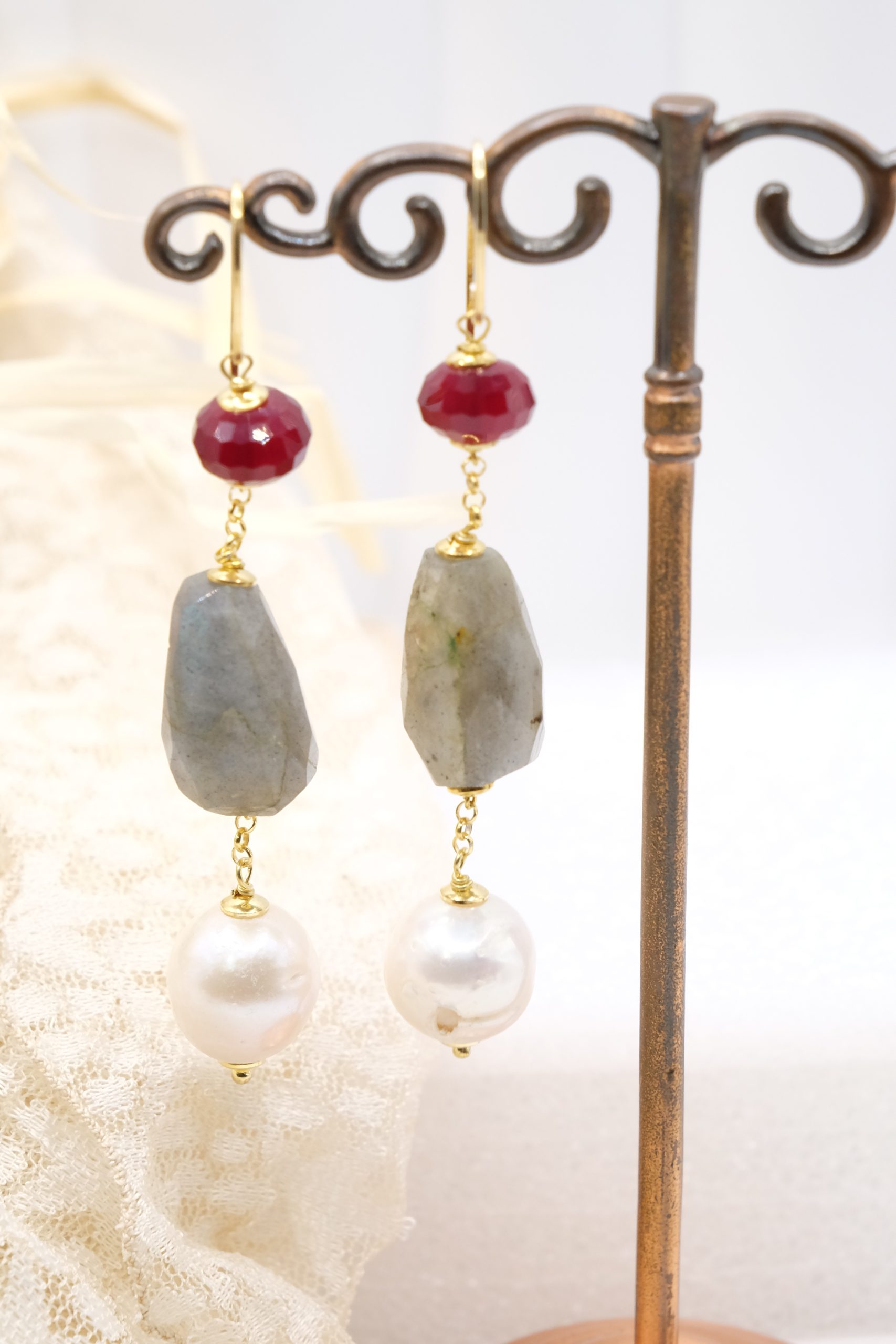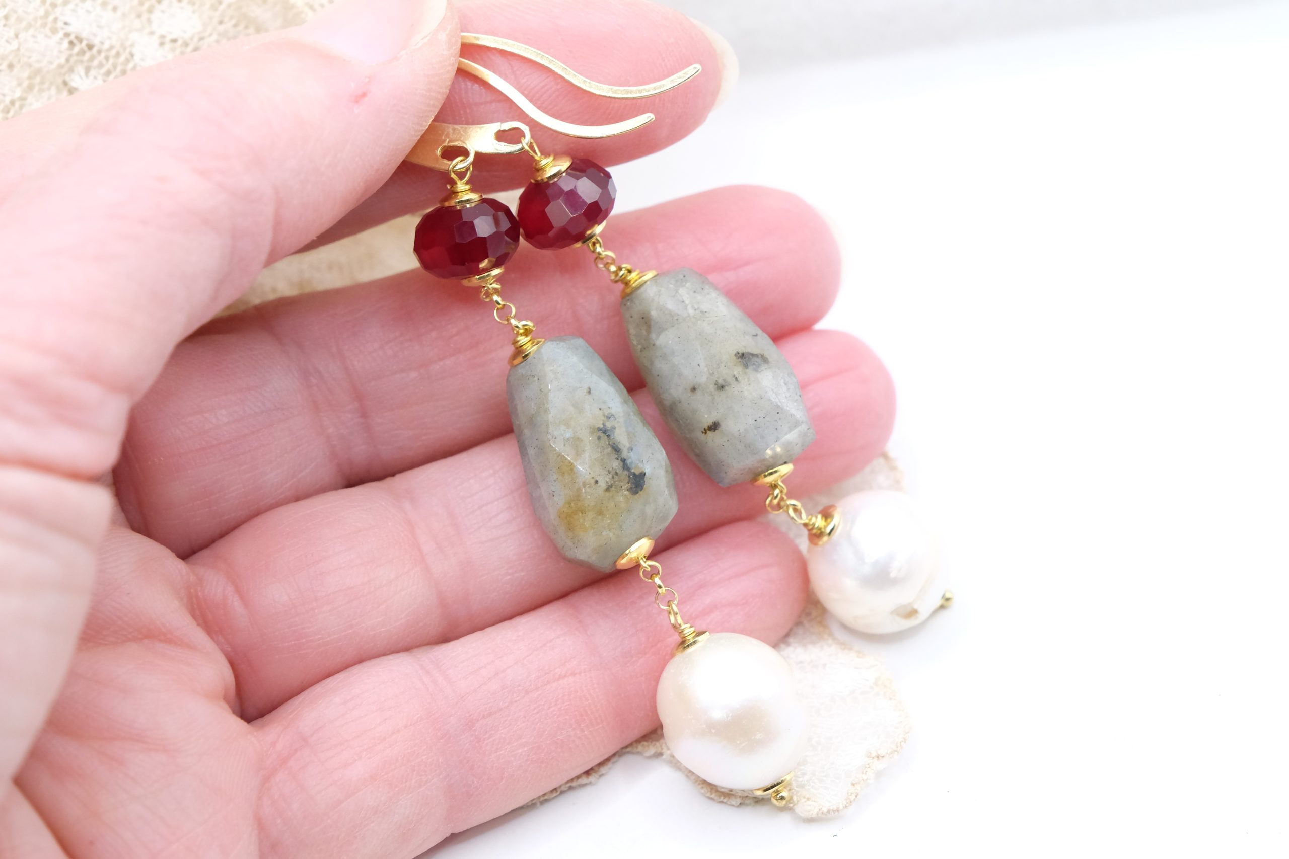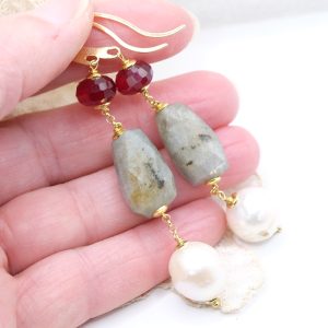 Orecchini con affascinante labradorite naturale a barilotti sfaccettati, perle naturali e giada borgogna