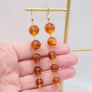 Realizzati con ambra autentica del Baltico, questi orecchini presentano cinque sfere perfettamente selezionate, dal colore caldo e avvolgente, capace di valorizzare ogni incarnato.