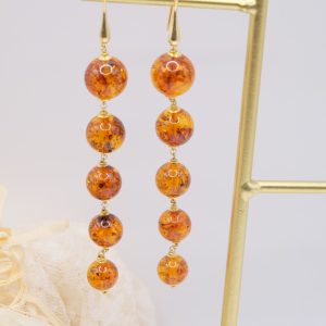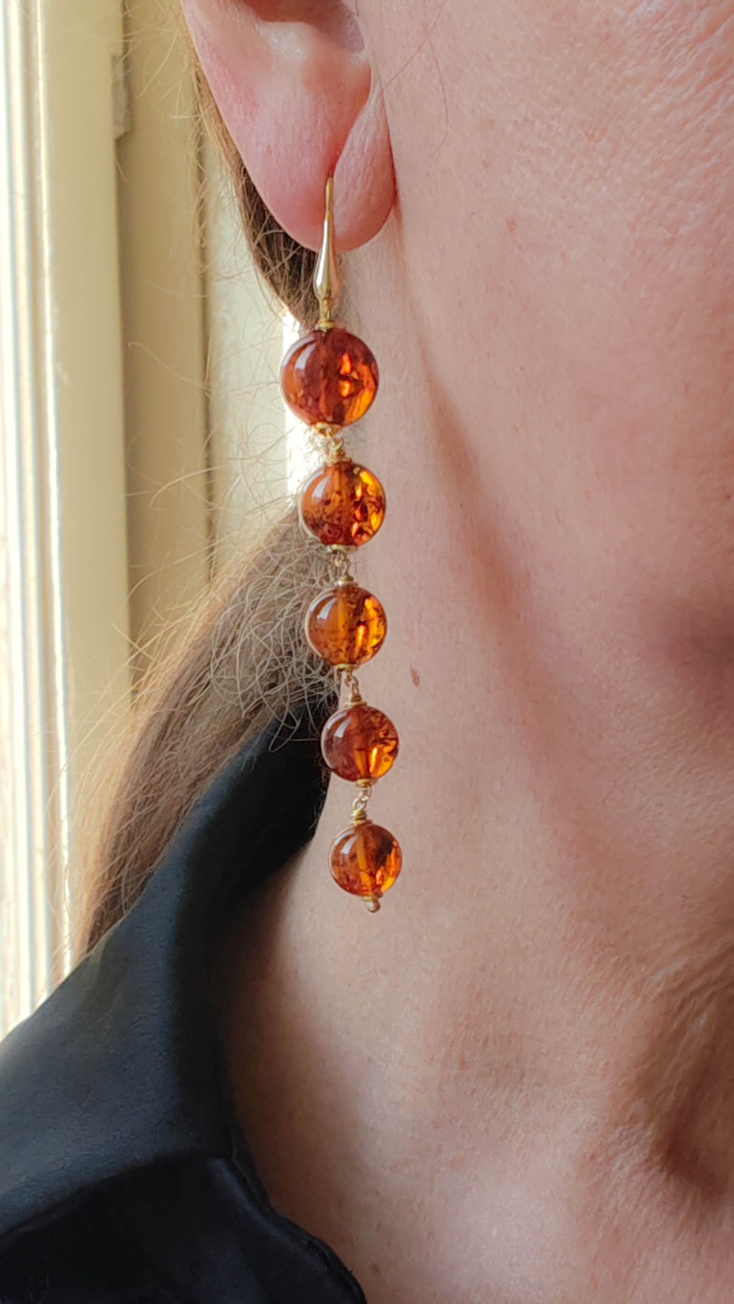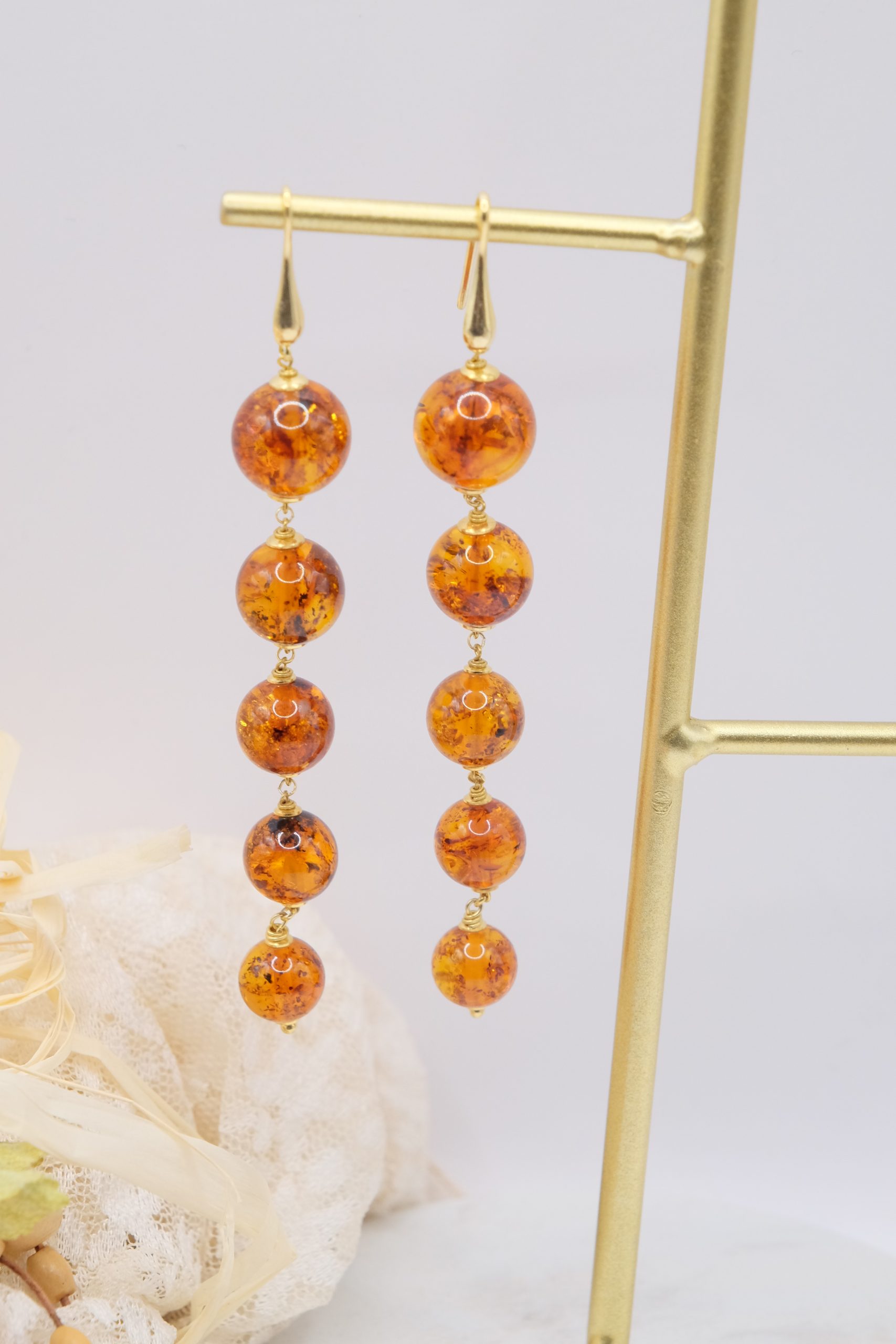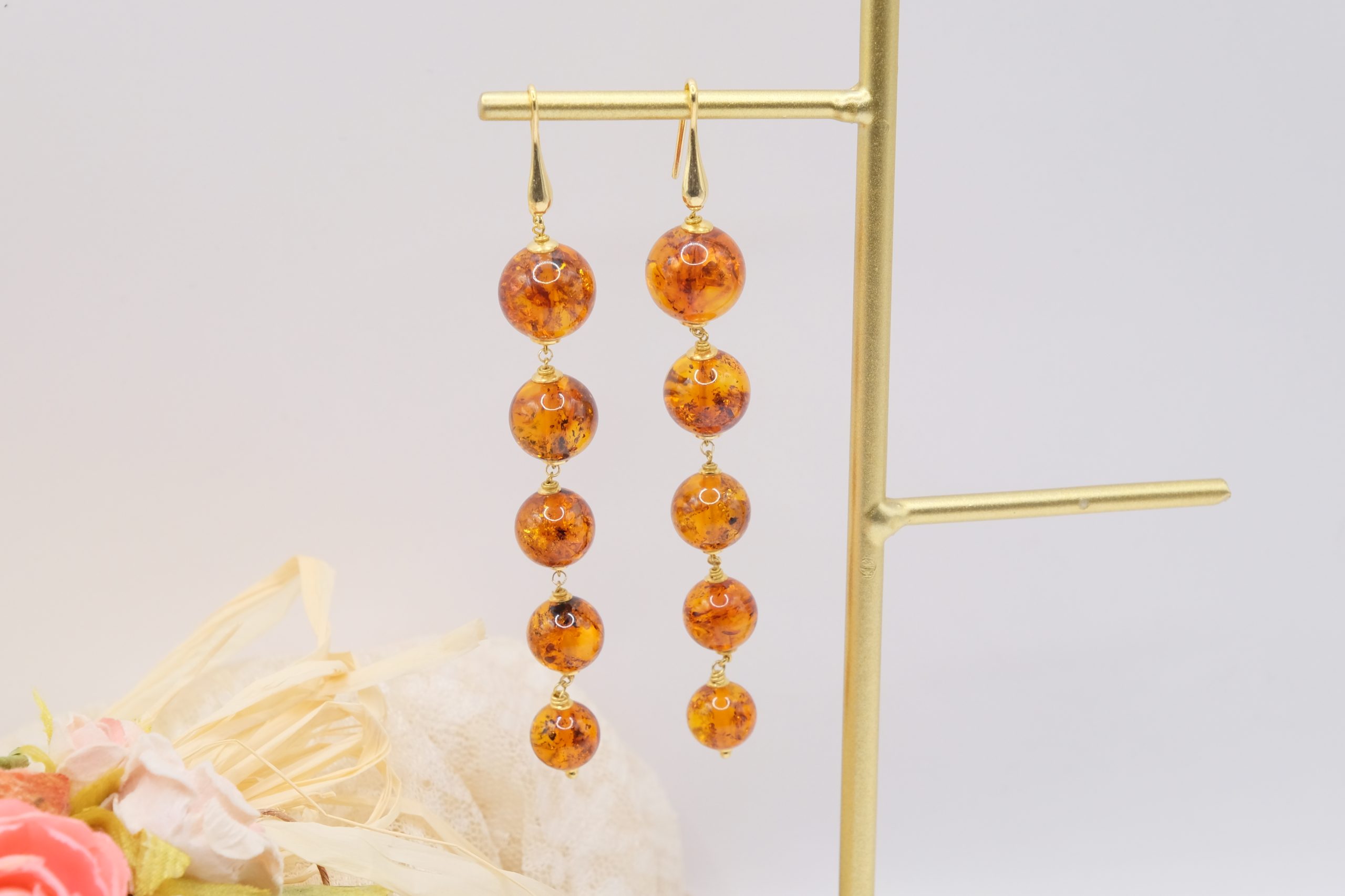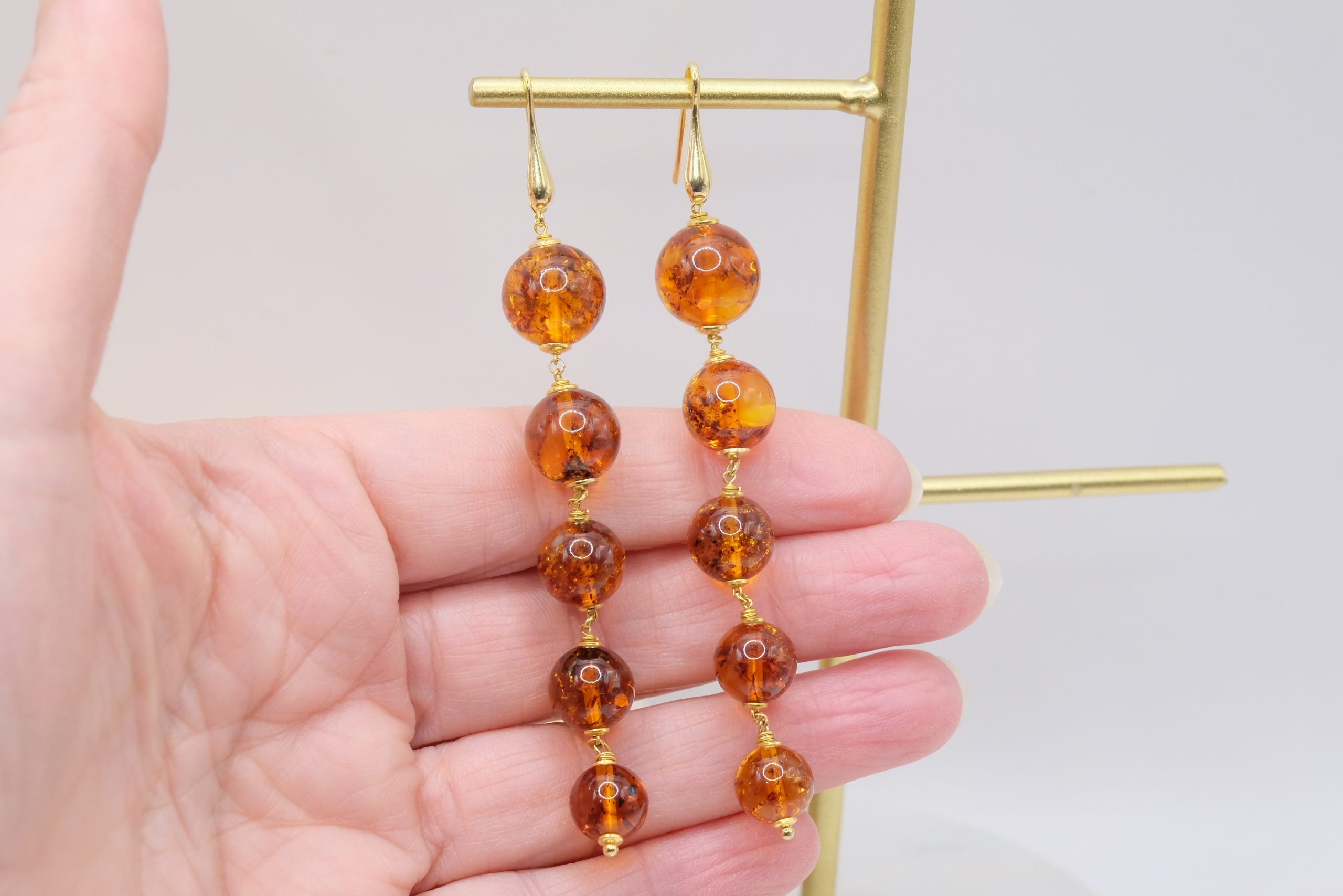 🌿 Orecchini Lunghi Ambra del Baltico – 5 Sfere e Argento ✨