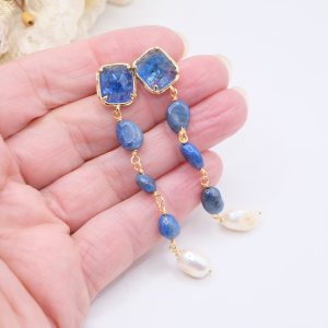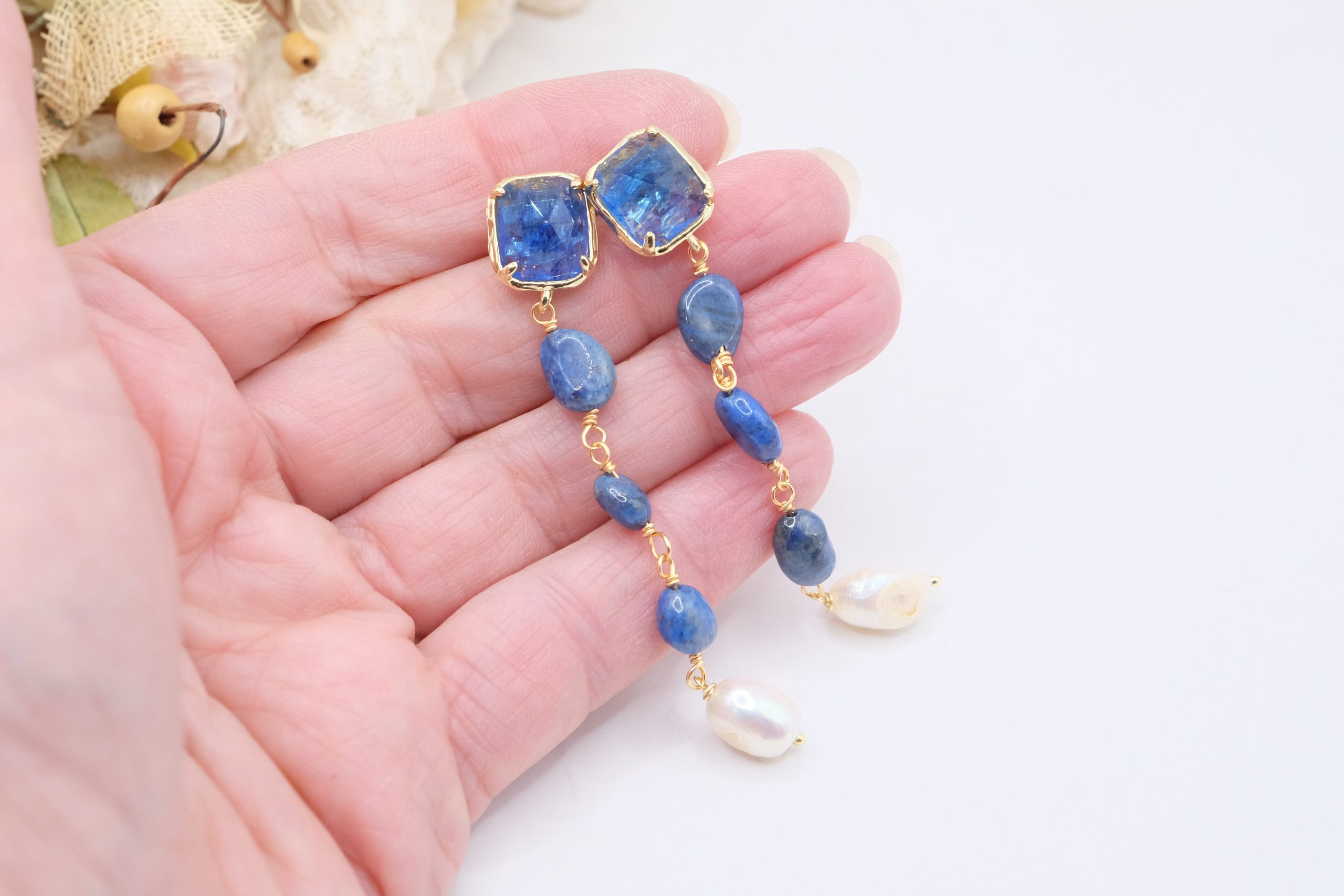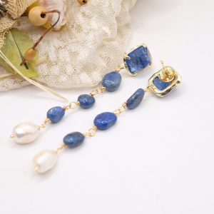 Orecchini artigianali con lapis e perla naturali, lunghi e leggeri
