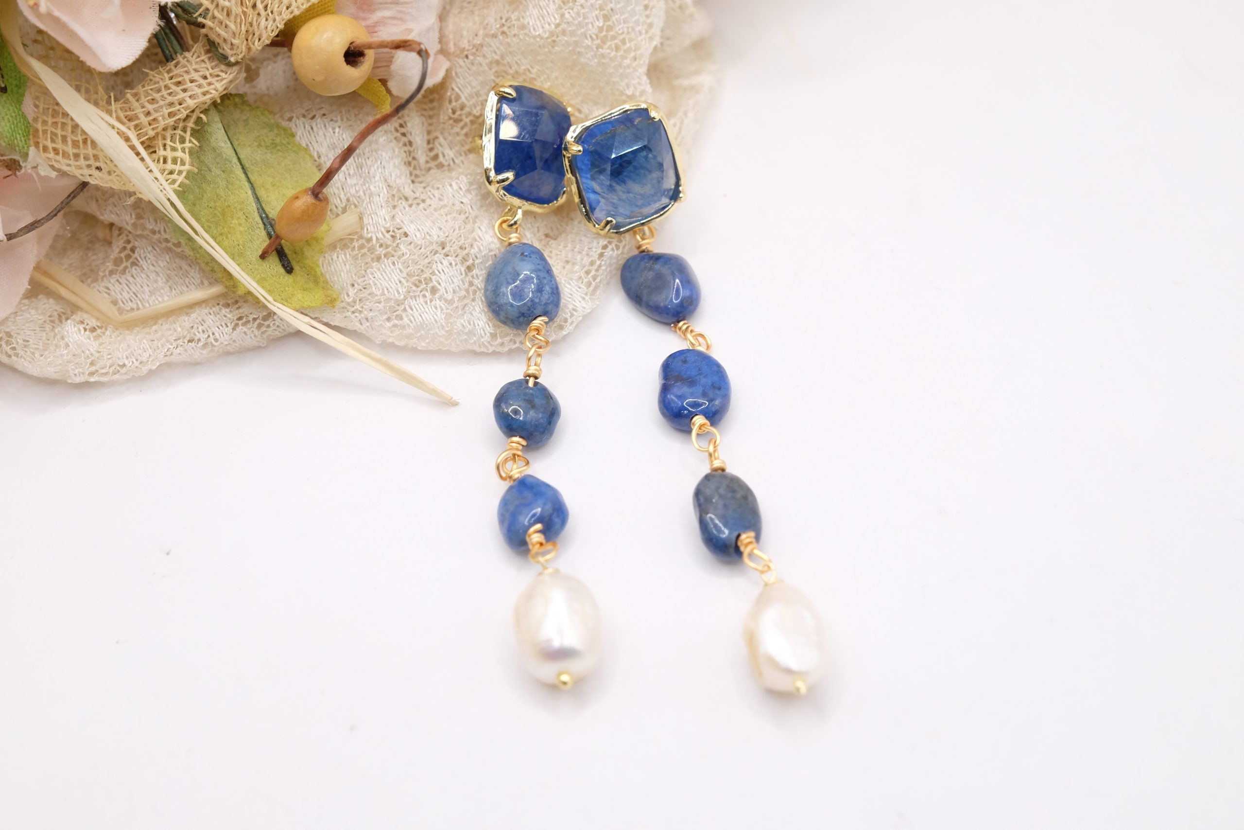 Orecchini artigianali realizzati con lapis e perle naturali, pensati per donare un tocco di luce e colore al viso ✨