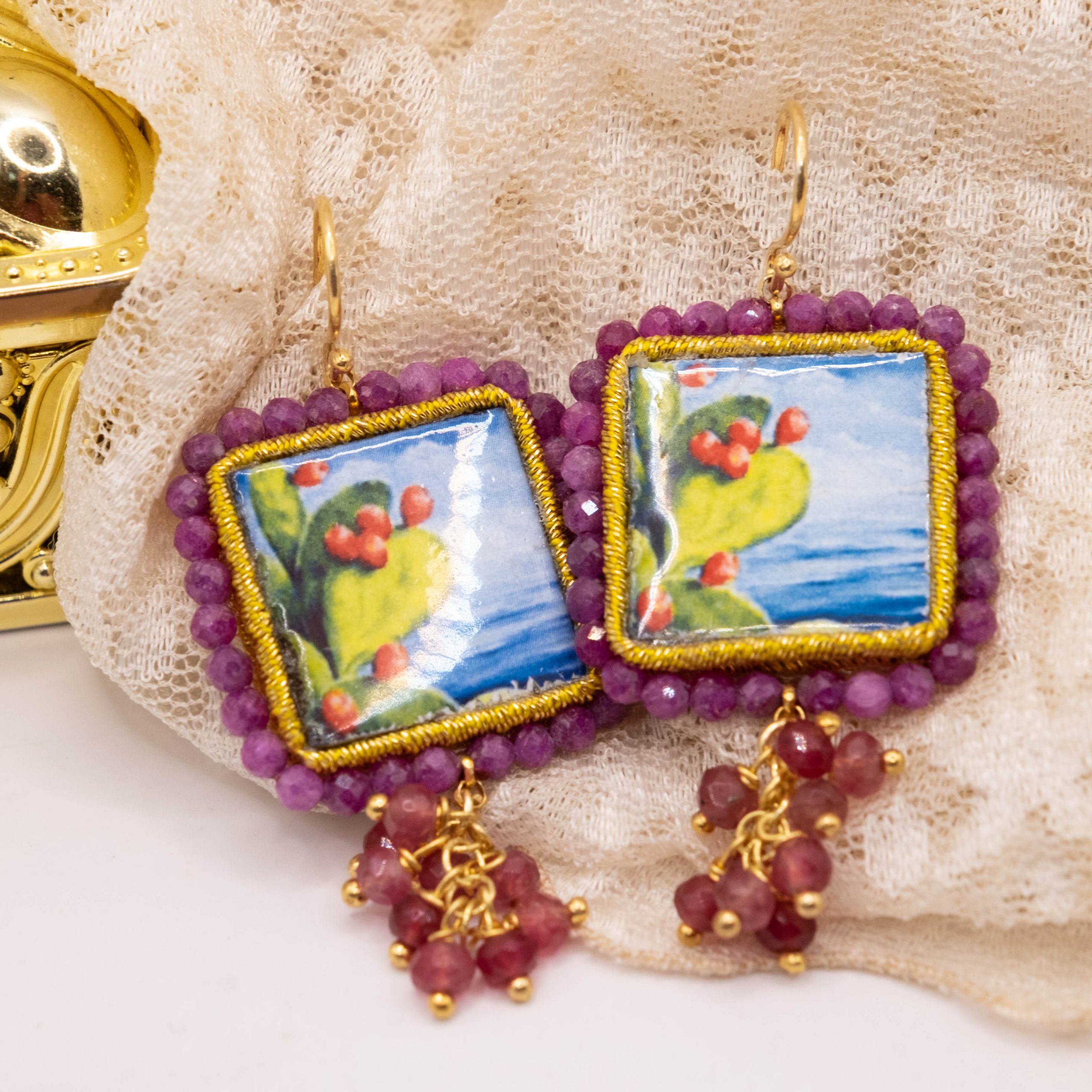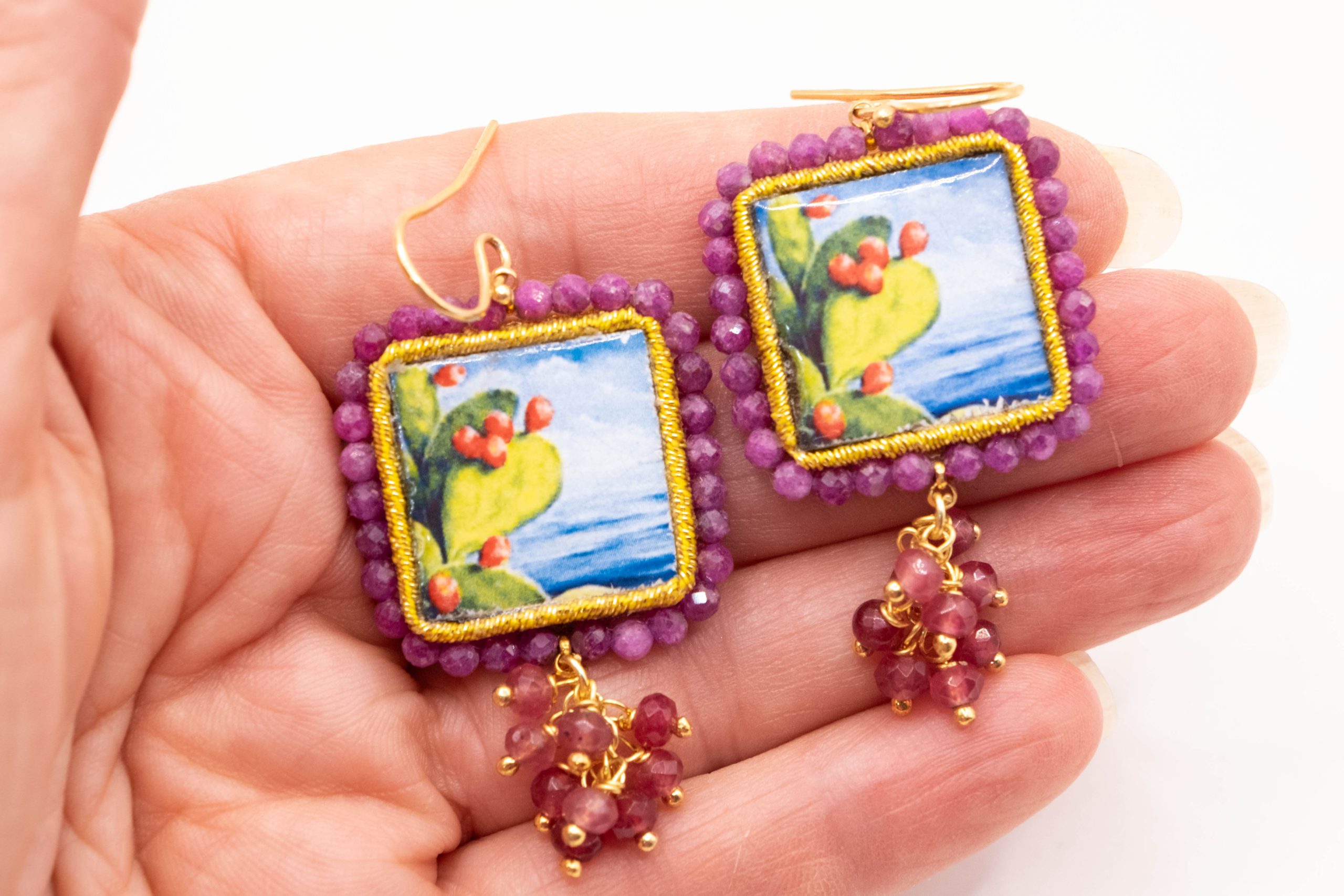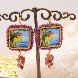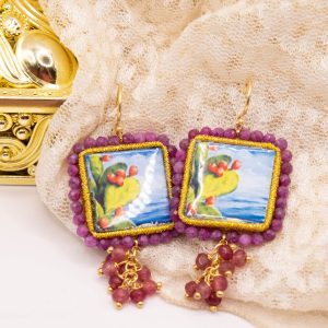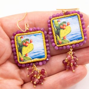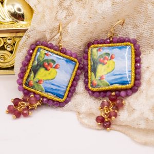 Orecchini con mattonelle, realizzate decorate a mano in pietra lavica ceramizzata di Caltagirone da 30 mm a lavorazione sautache, con fico d’india e mare, e grappolo di radice di rubino