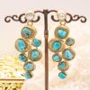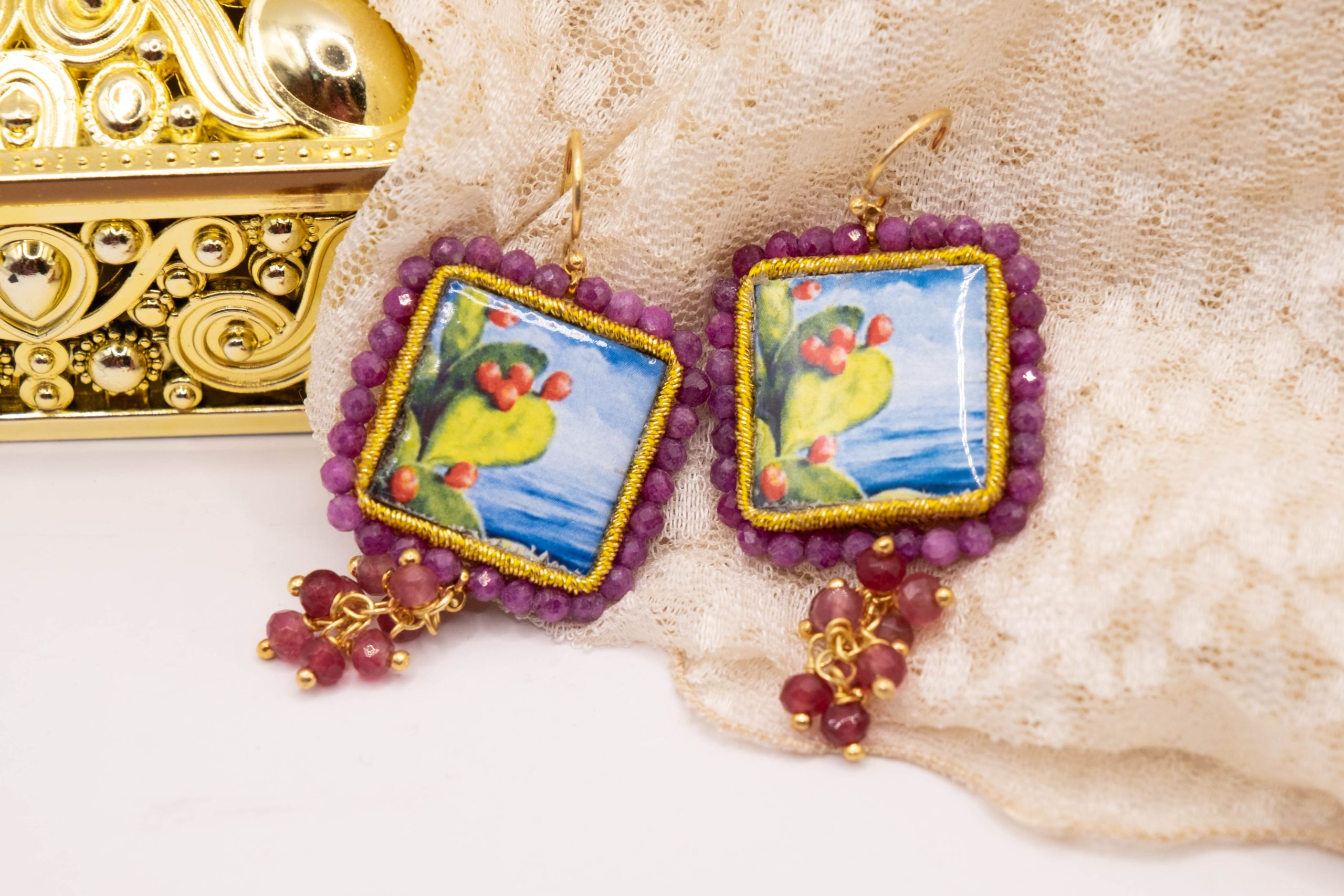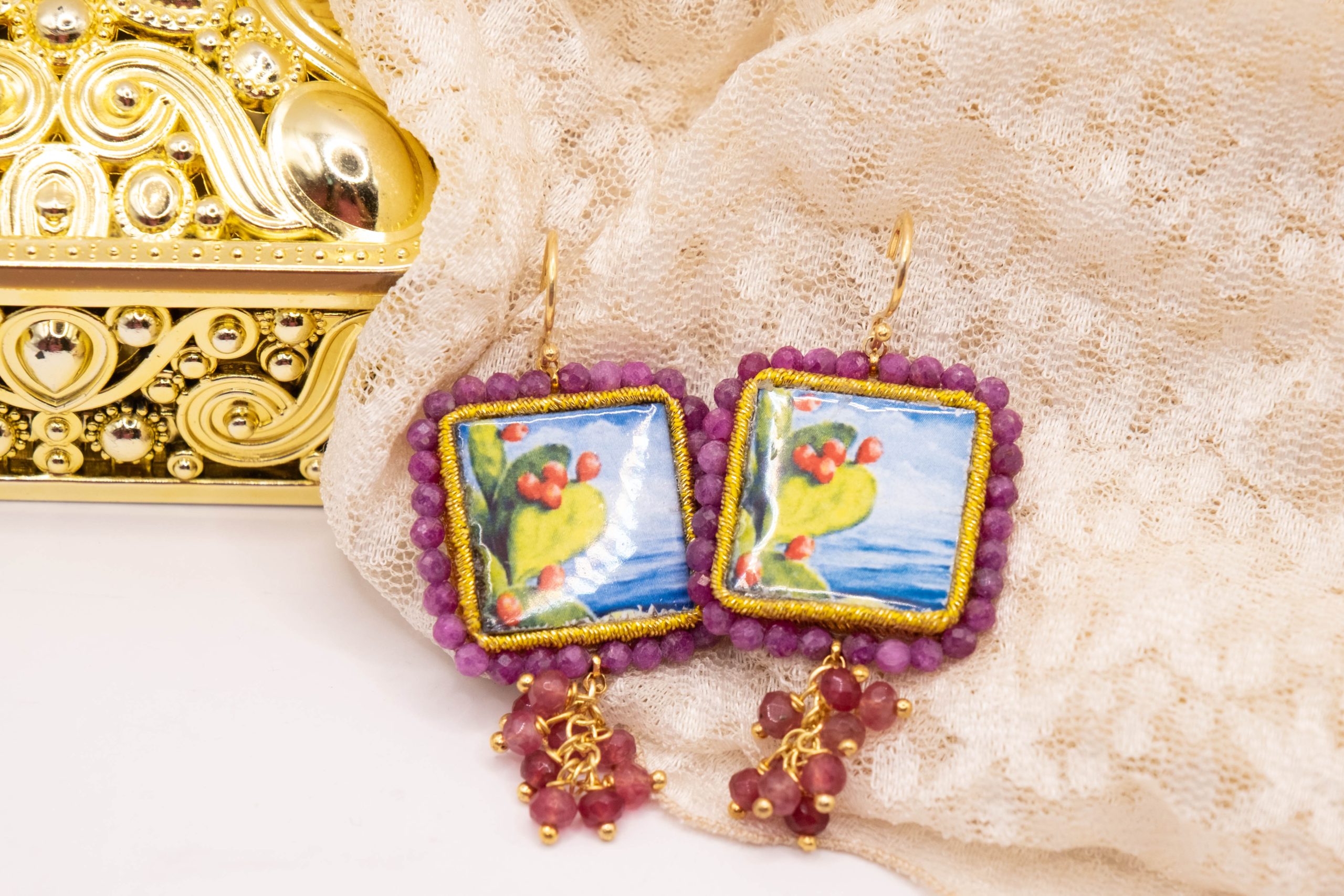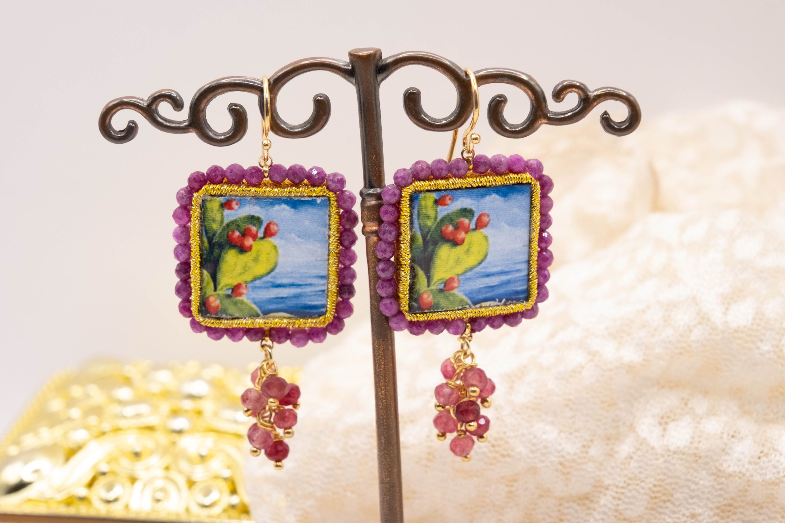 Orecchini con mattonelle, realizzate decorate a mano in pietra lavica ceramizzata di Caltagirone da 30 mm a lavorazione sautache, con fico d’india e mare, e grappolo di radice di rubino