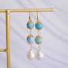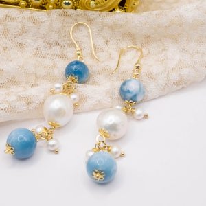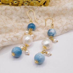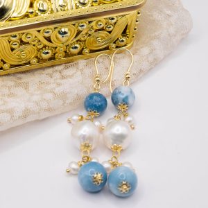 Questi orecchini pendenti uniscono la raffinatezza delle perle bianche e la delicatezza del larimar, il tutto impreziosito da finiture in argento 925 placcato oro.