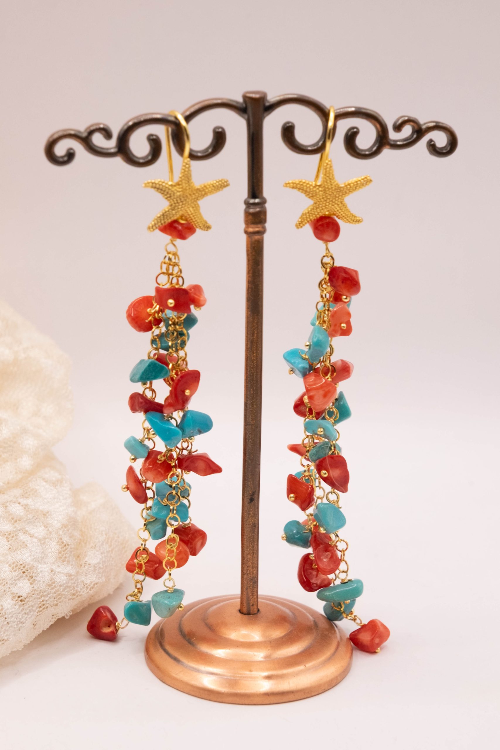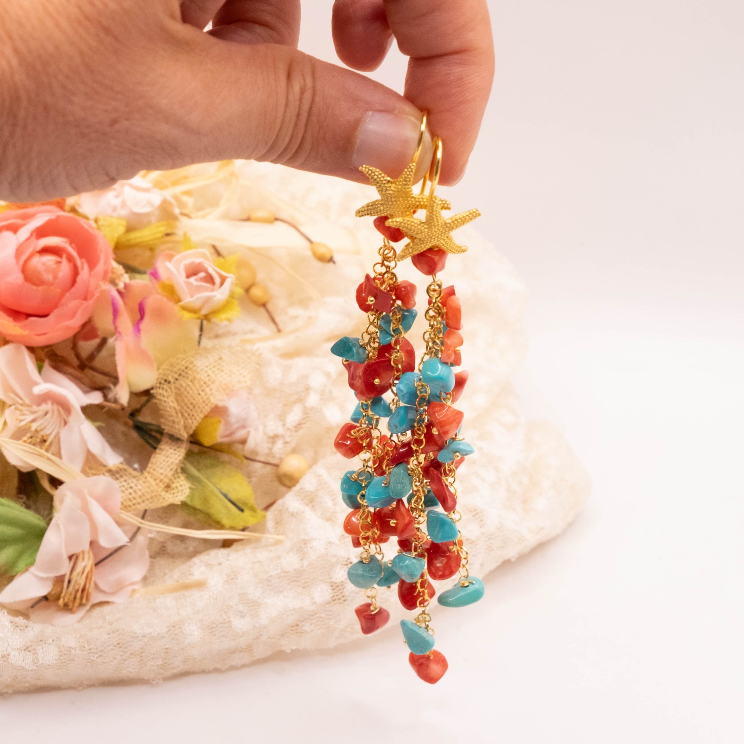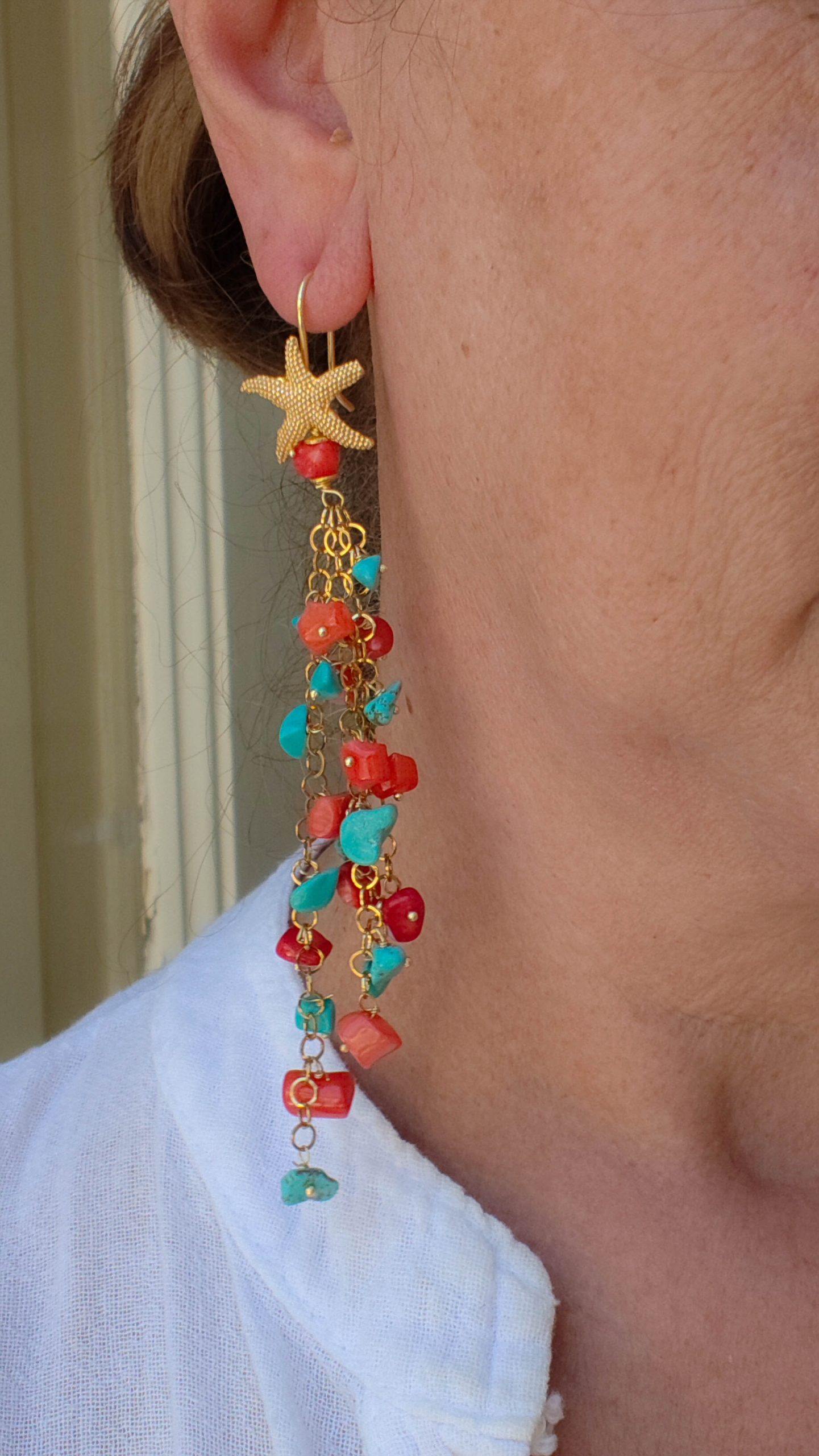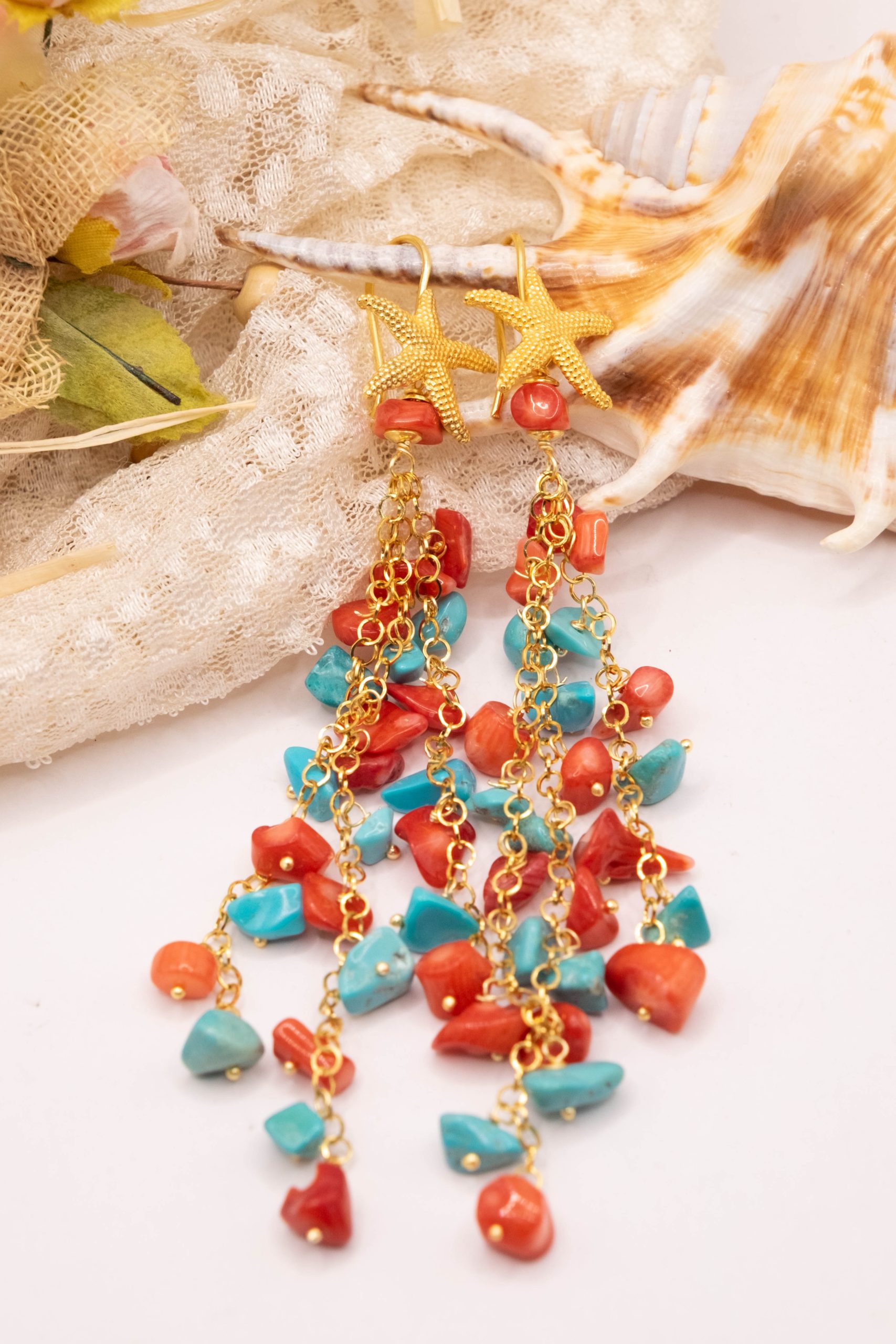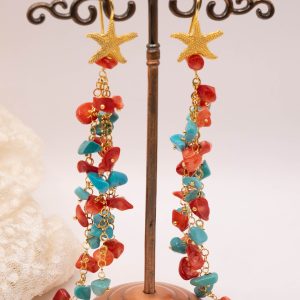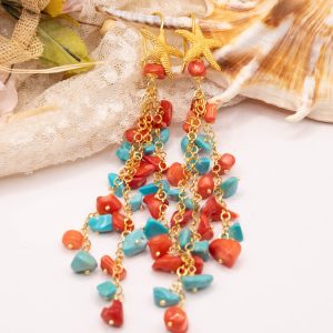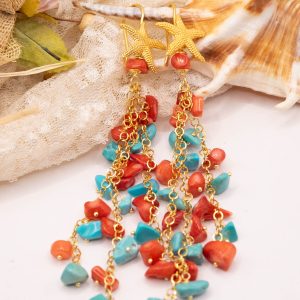 Orecchini Pendentissimi Cascata Turchese Corallo Bamboo Rosso Stella Marina