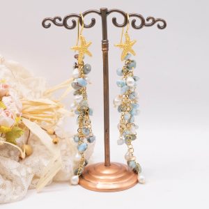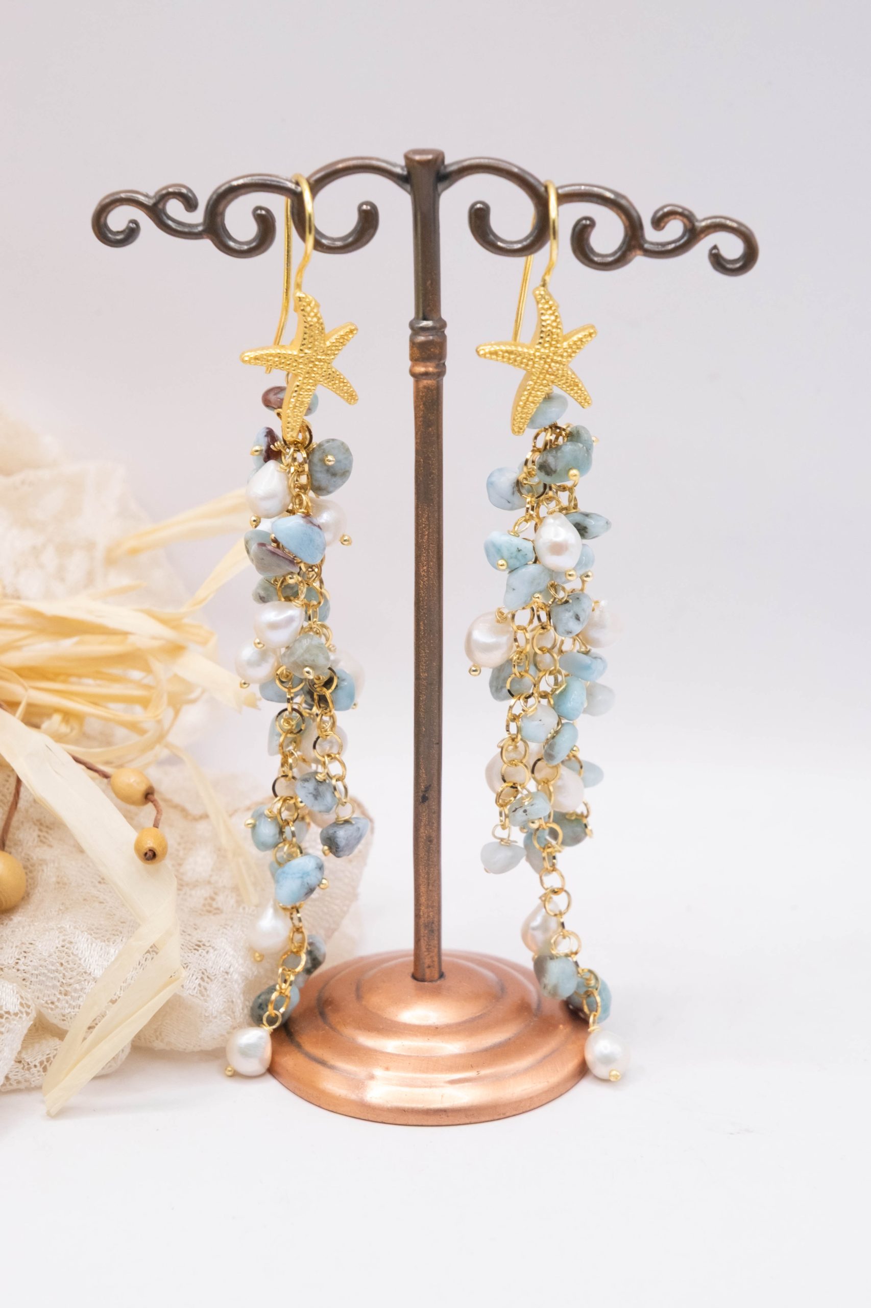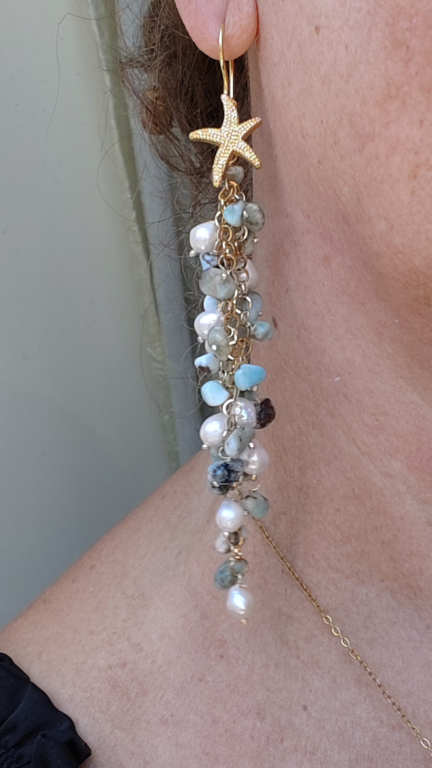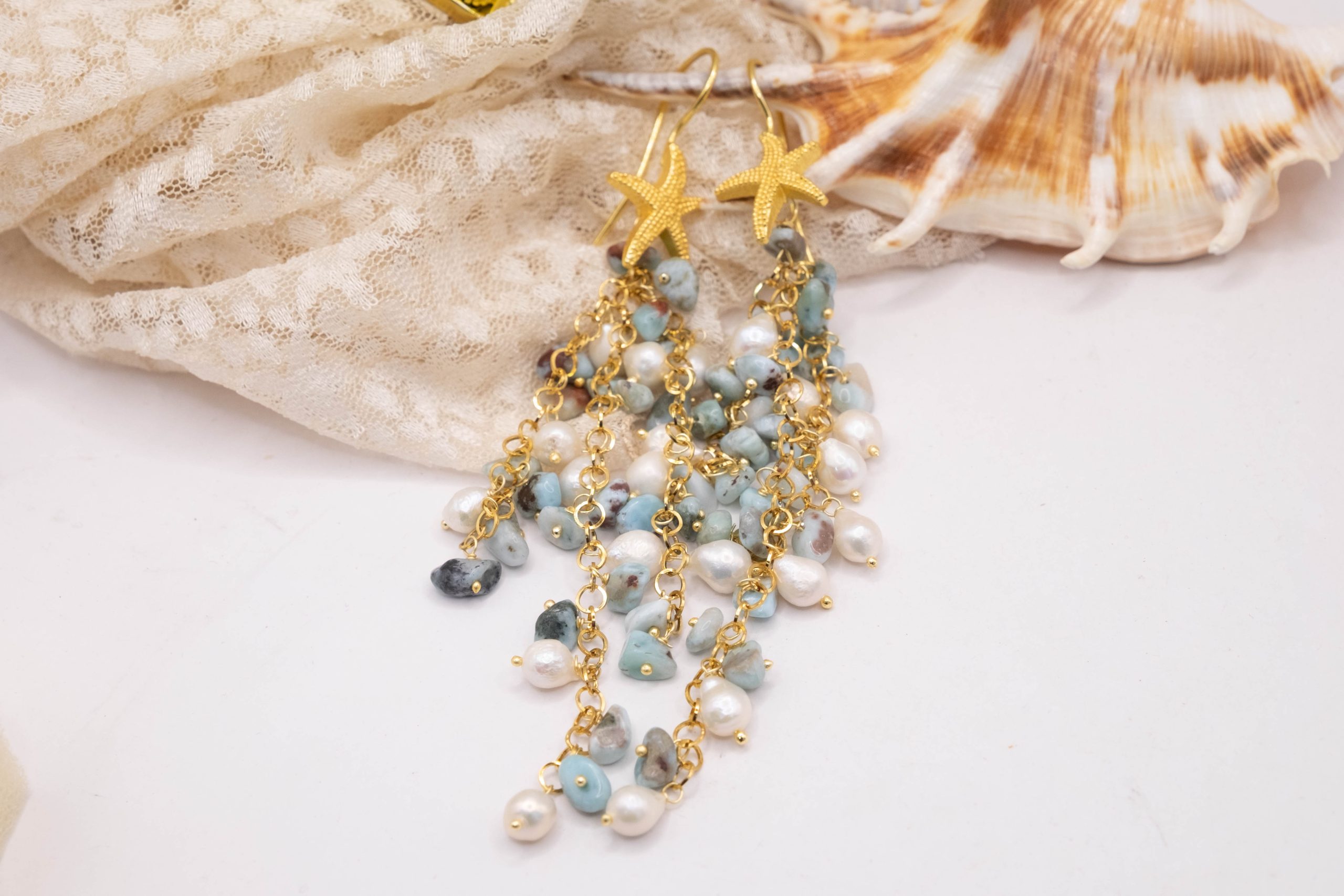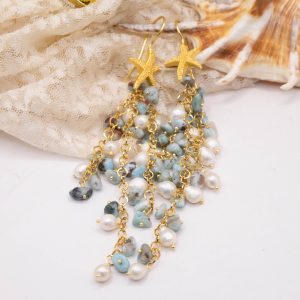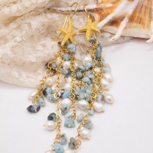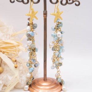 Orecchini Pendentissimi Cascata Larimar Perle Stella Marina