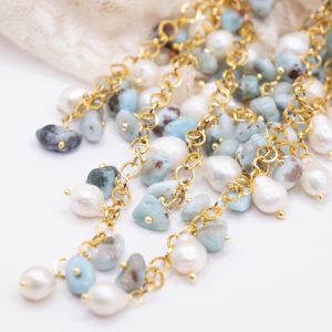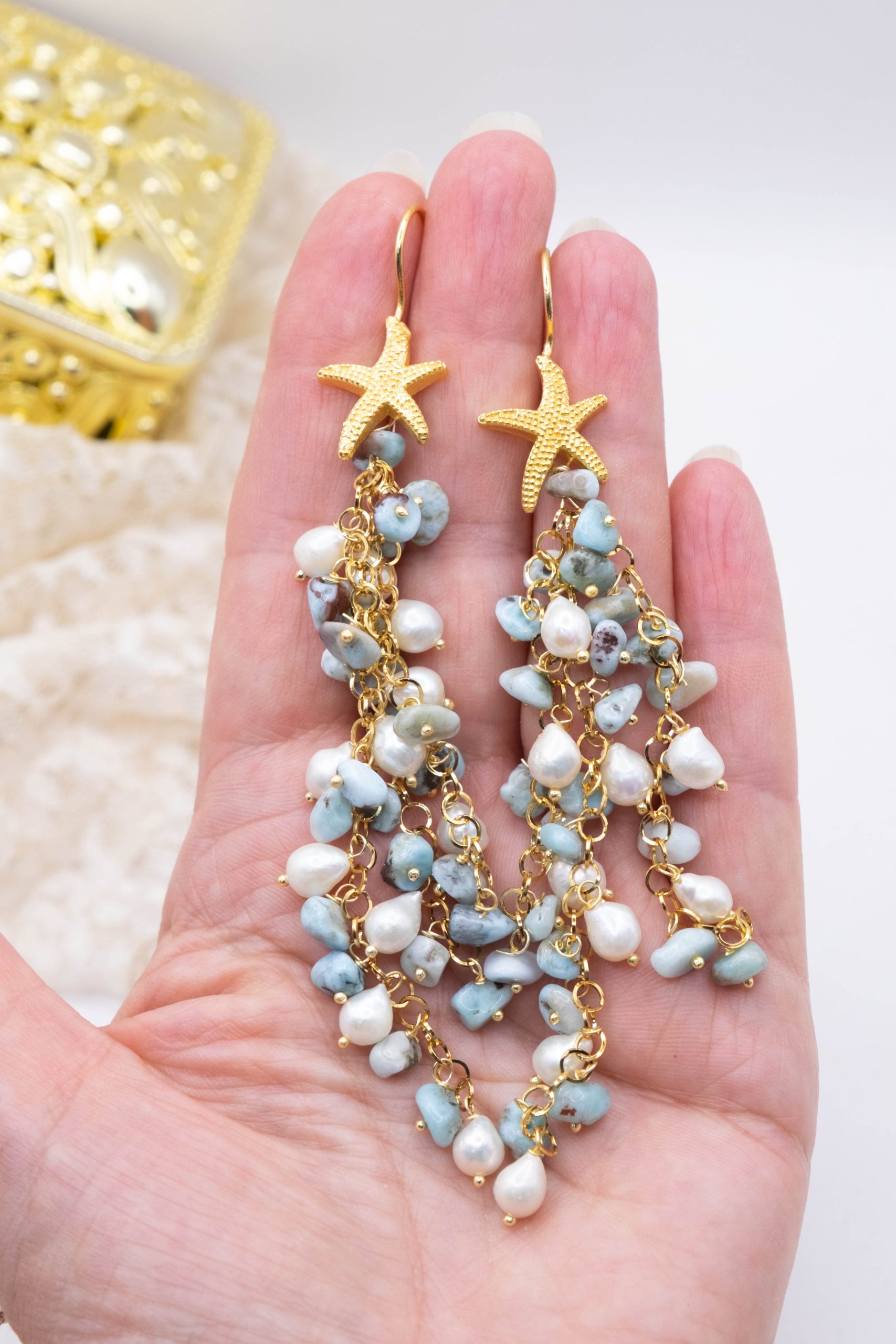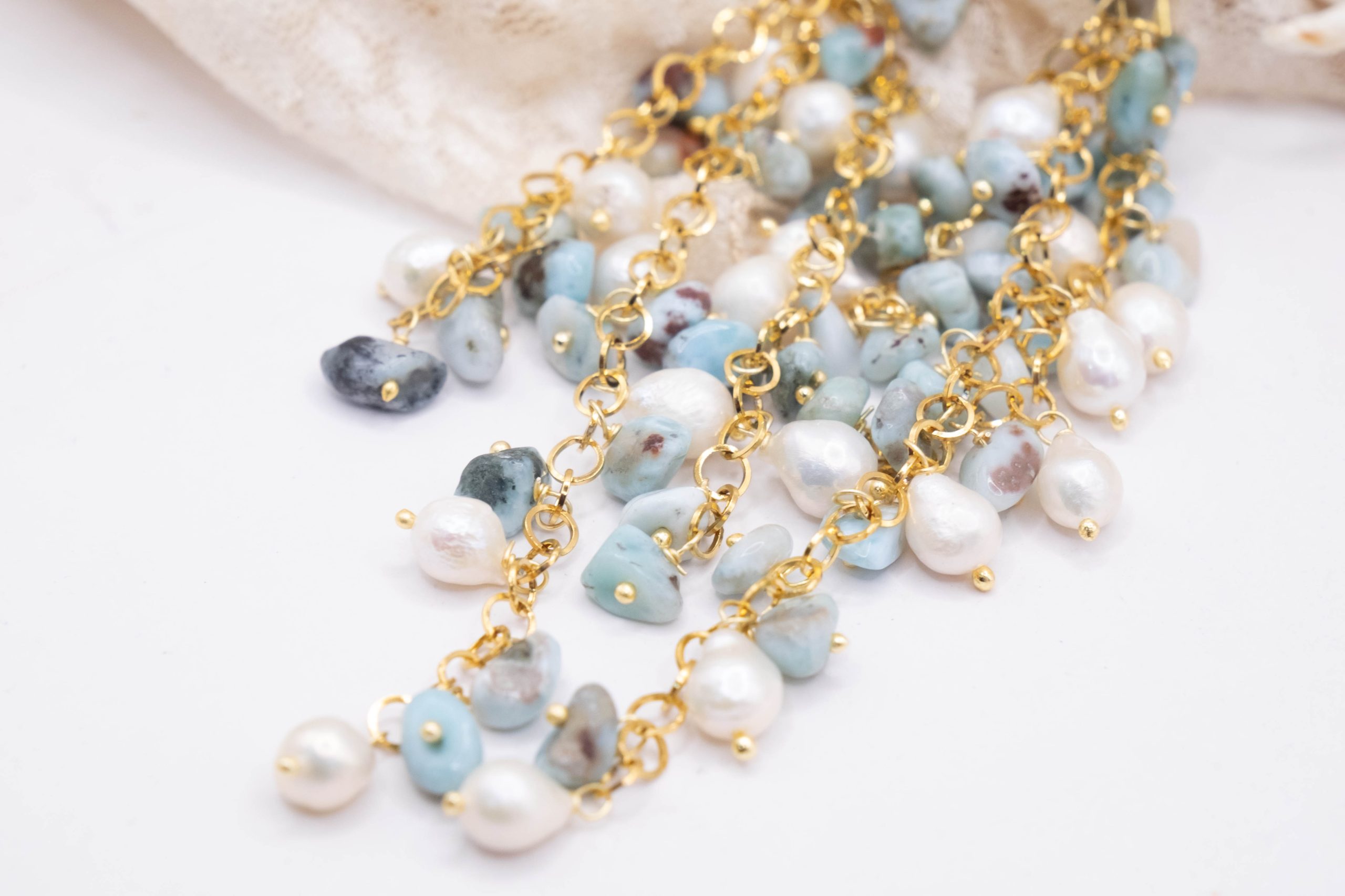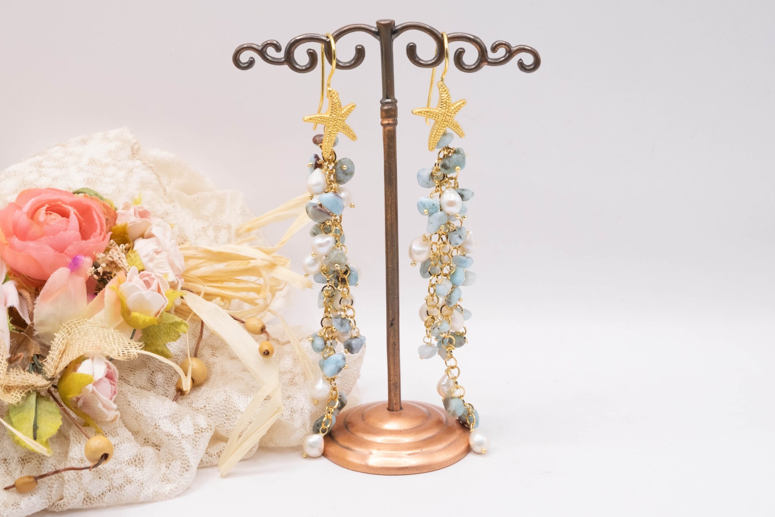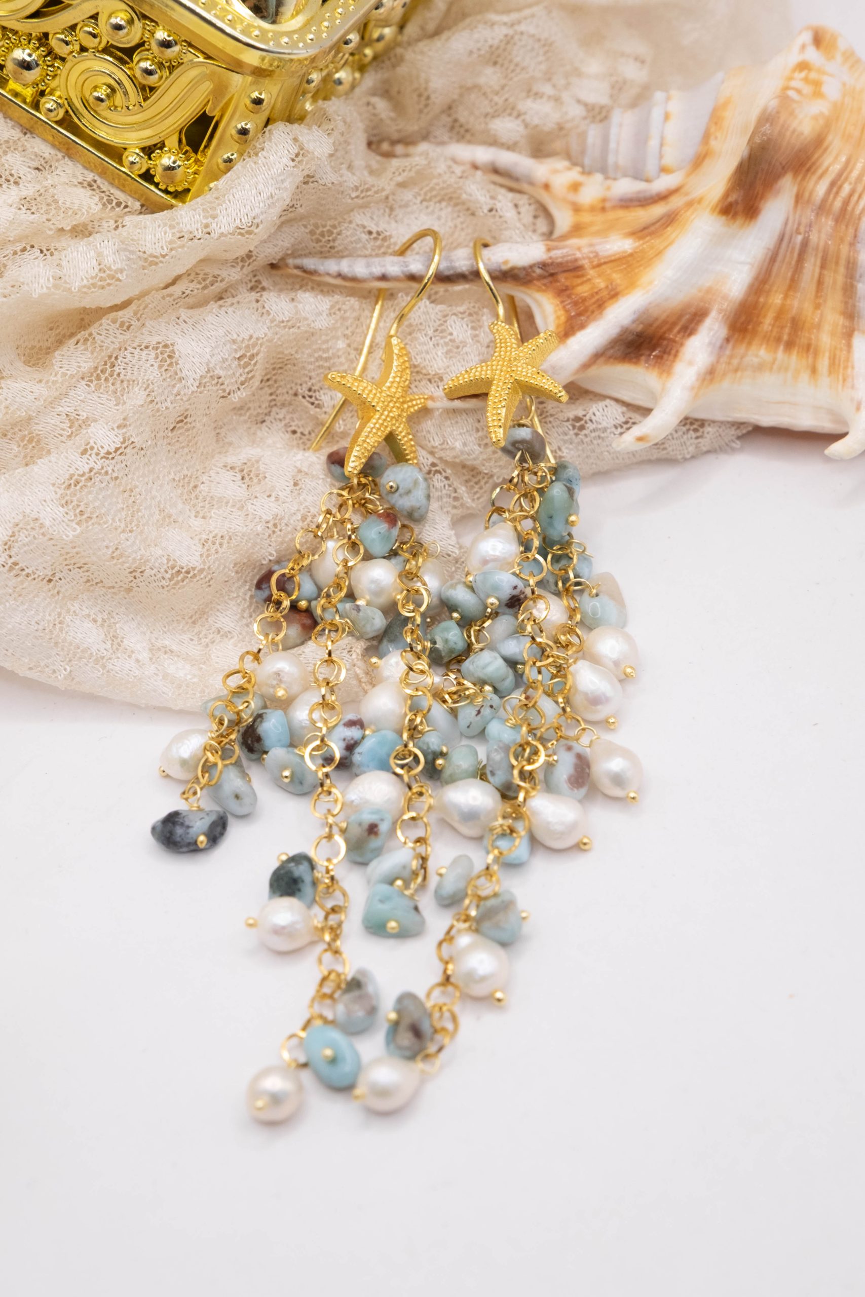 Orecchini Pendentissimi Cascata Larimar Perle Stella Marina