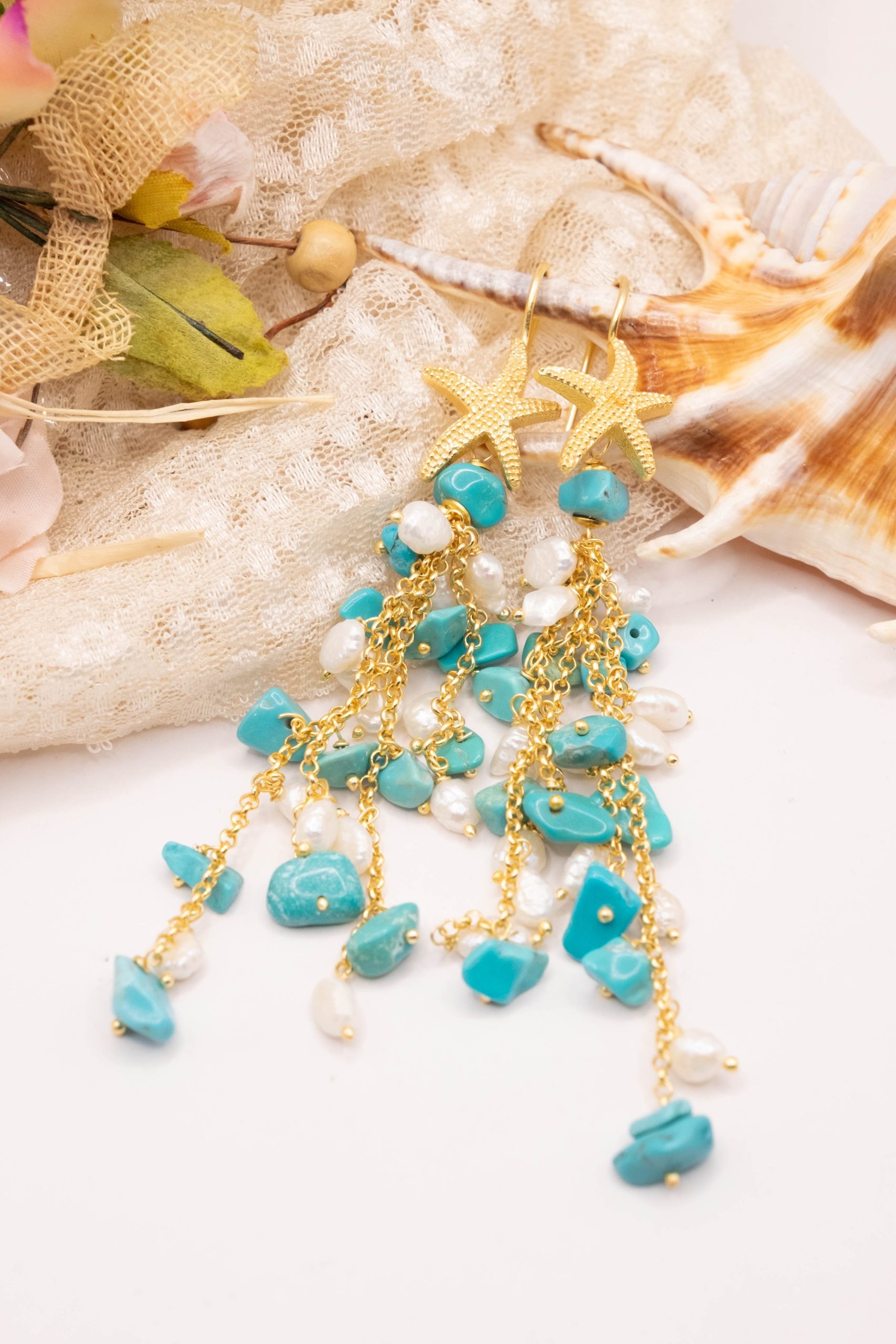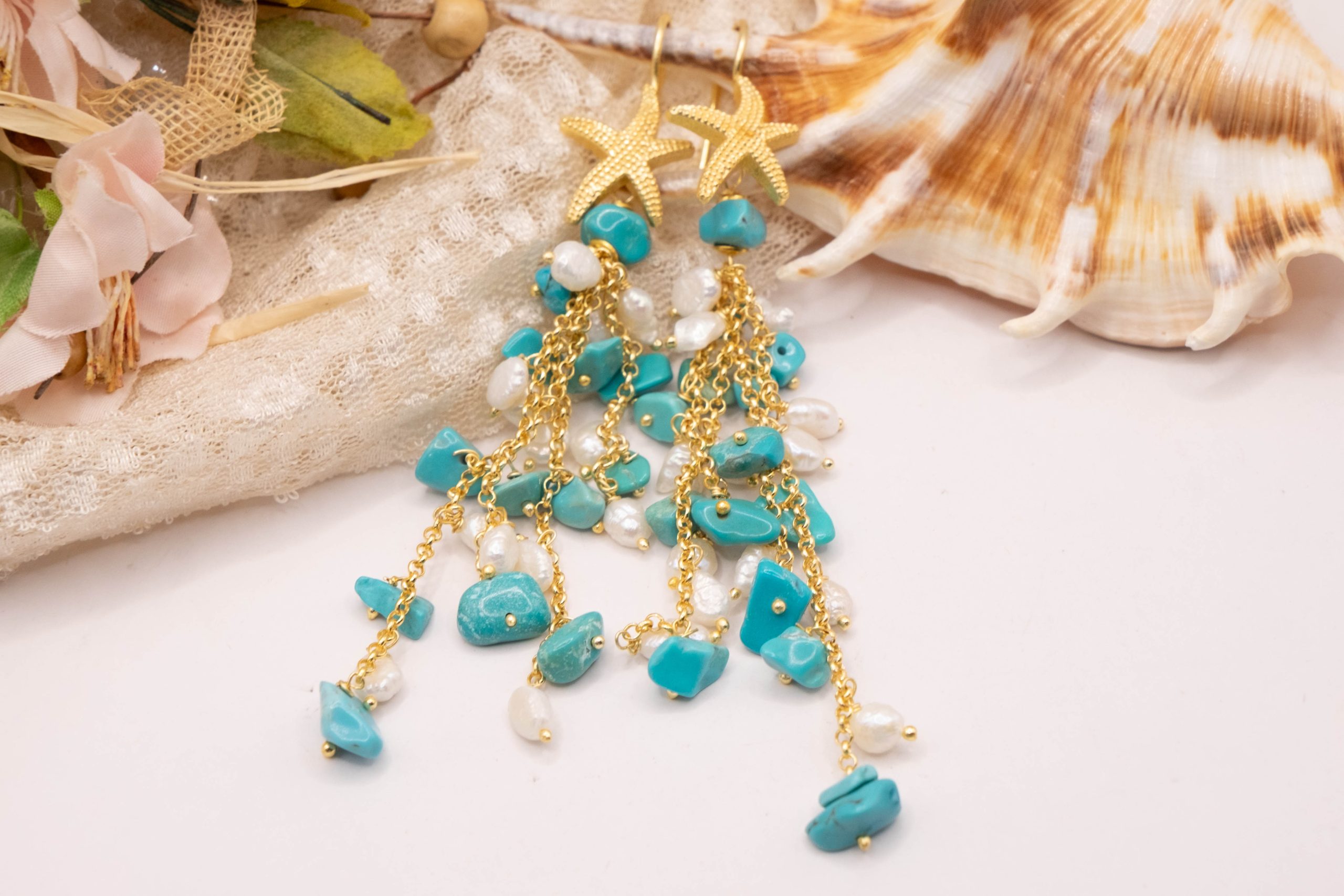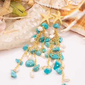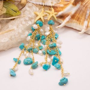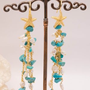 Orecchini Pendentissimi Cascata Turchese Perle Naturali Stella Marina