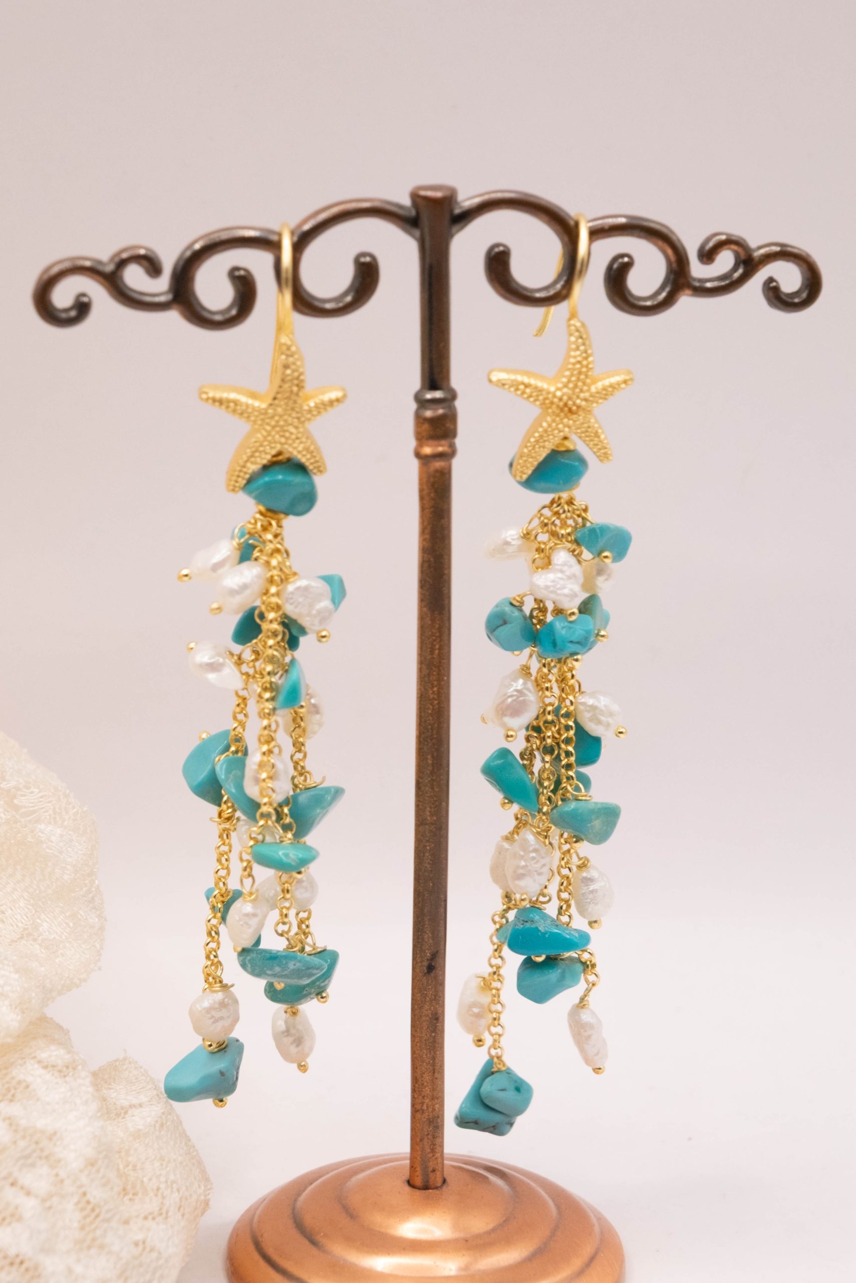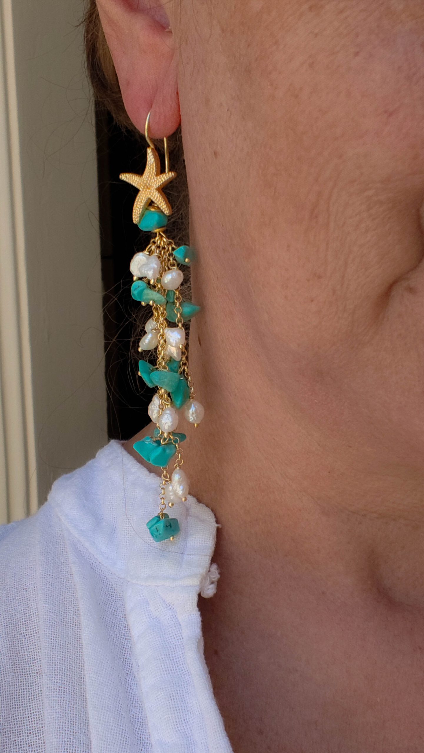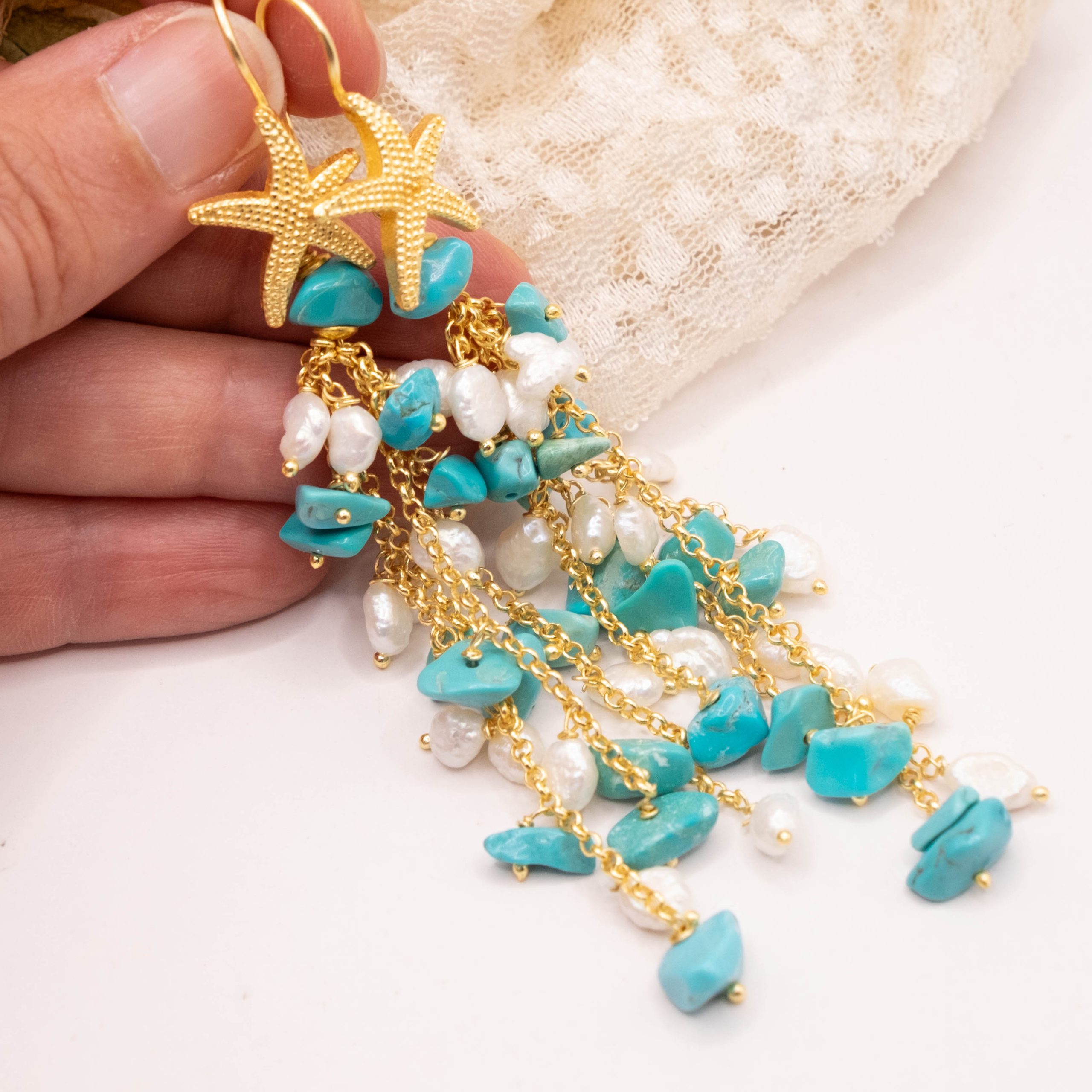 Orecchini Pendentissimi Cascata Turchese Perle Naturali Stella Marina