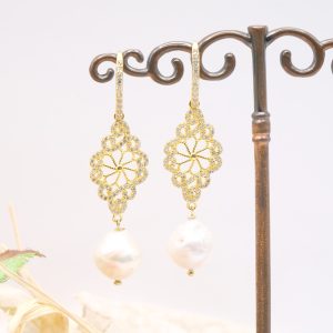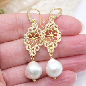 Orecchini con luminose perle barocche bianche e rombo a filigrana in argento 925 placcato oro tempestato di zirconi