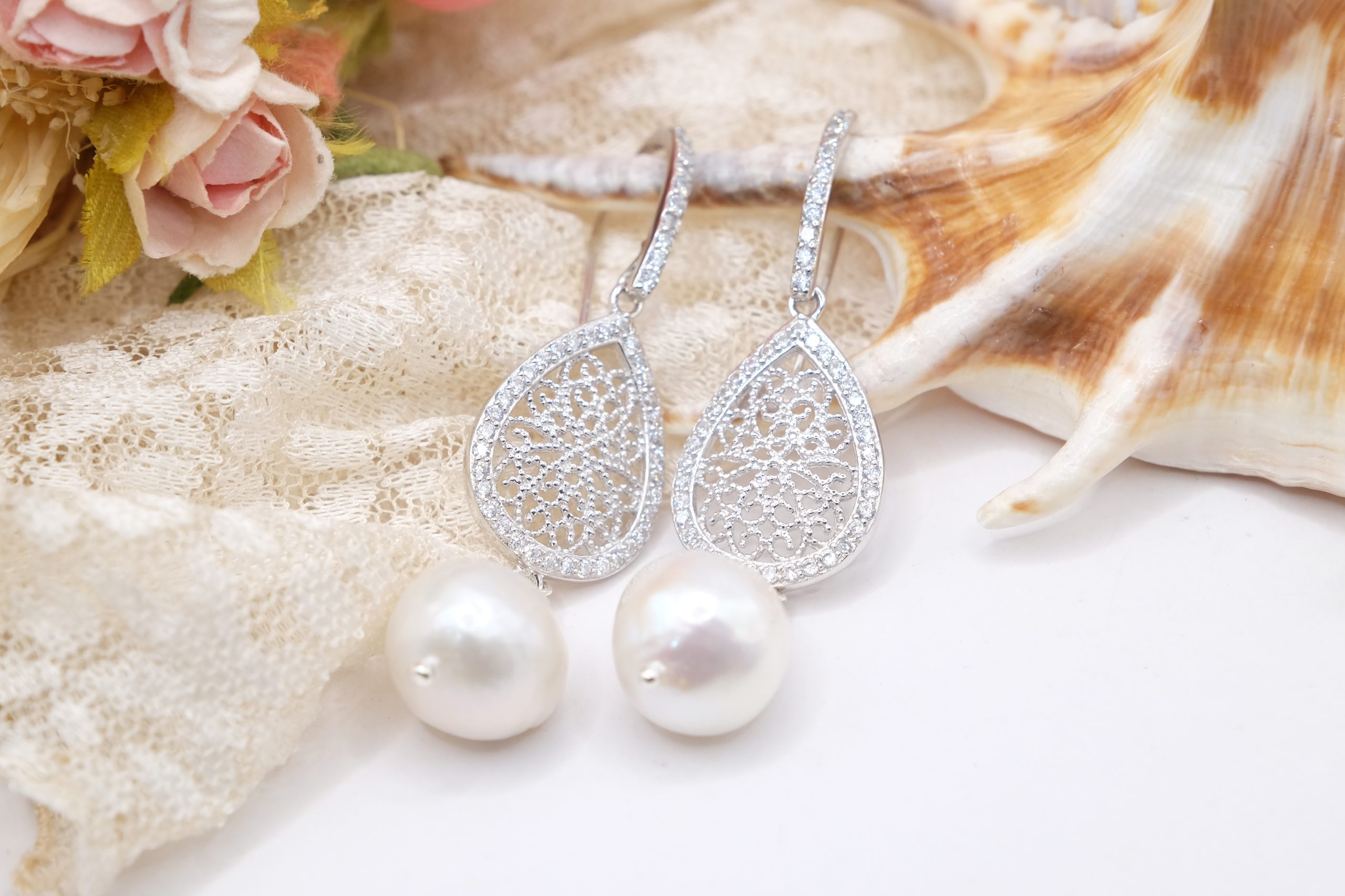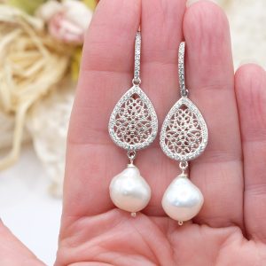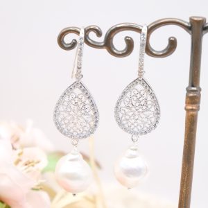 Orecchini con luminose perle barocche bianche e goccia a filigrana in argento 925 tempestato di zirconi