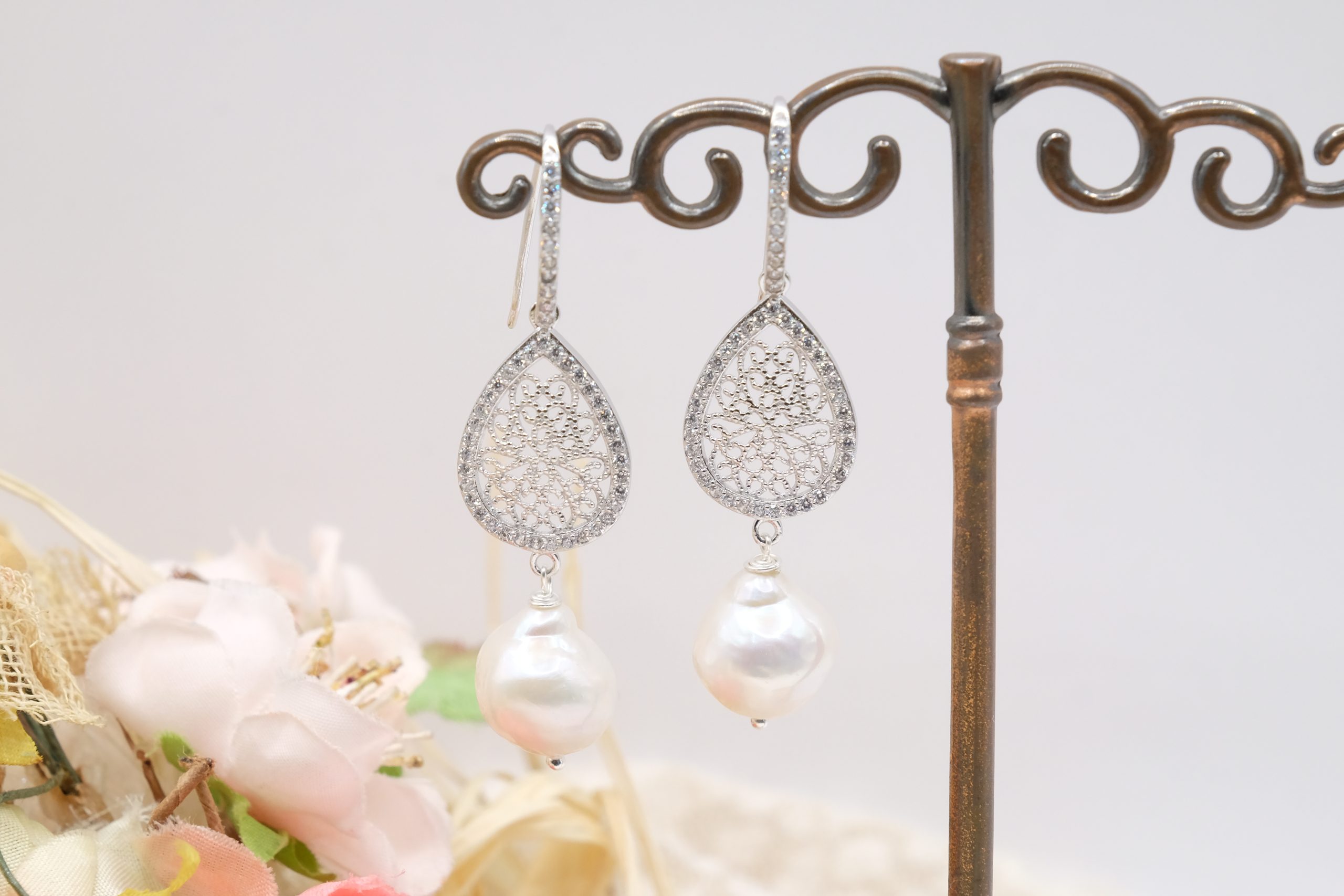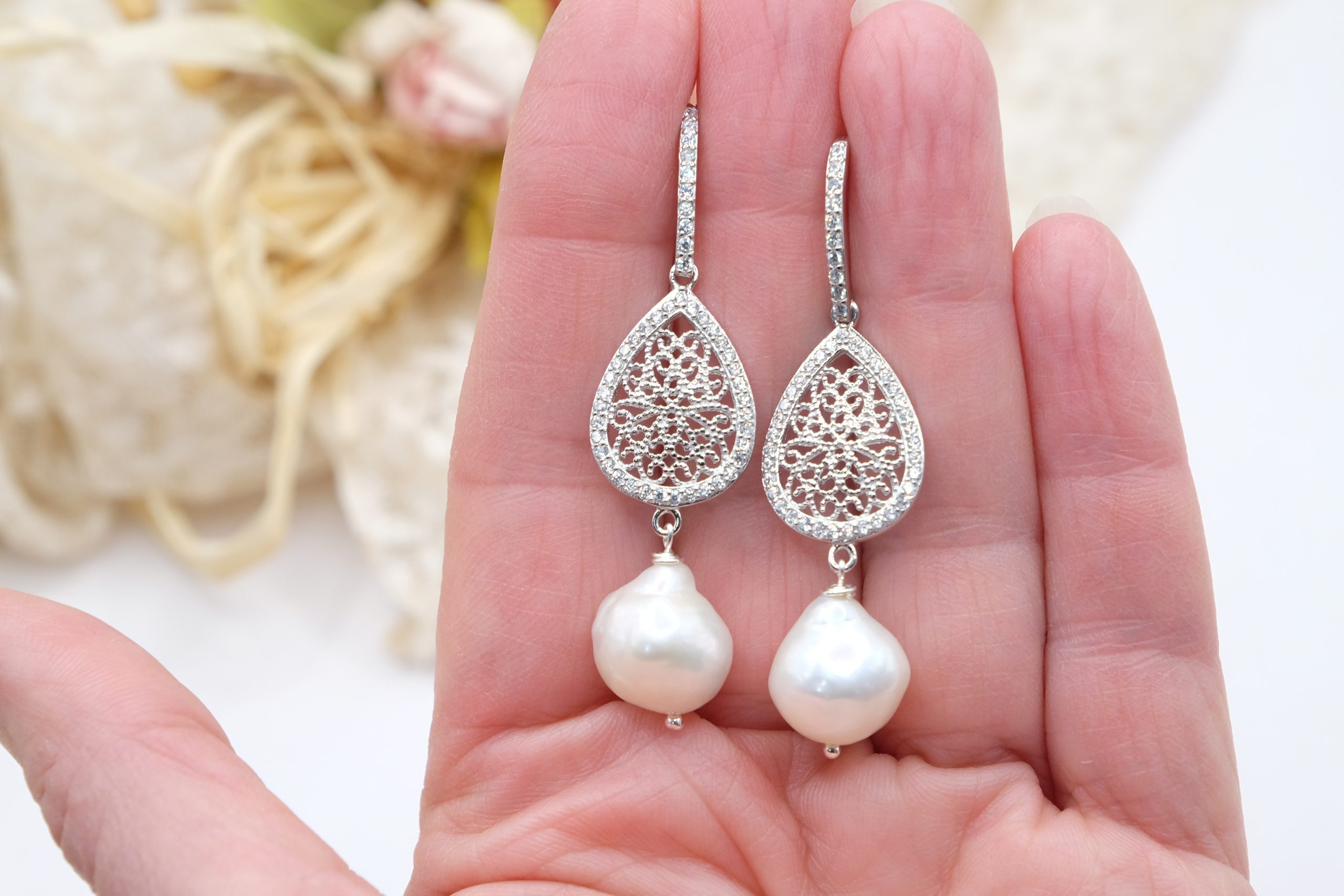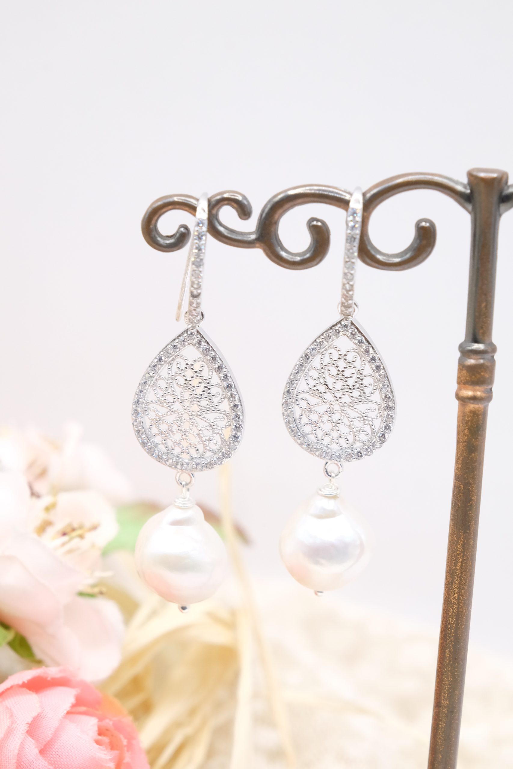 Orecchini raffinati con perle barocche bianche, uniche nelle loro forme naturali, abbinate a una delicata goccia filigranata in argento 925, impreziosita da luminosi zirconi ✨
