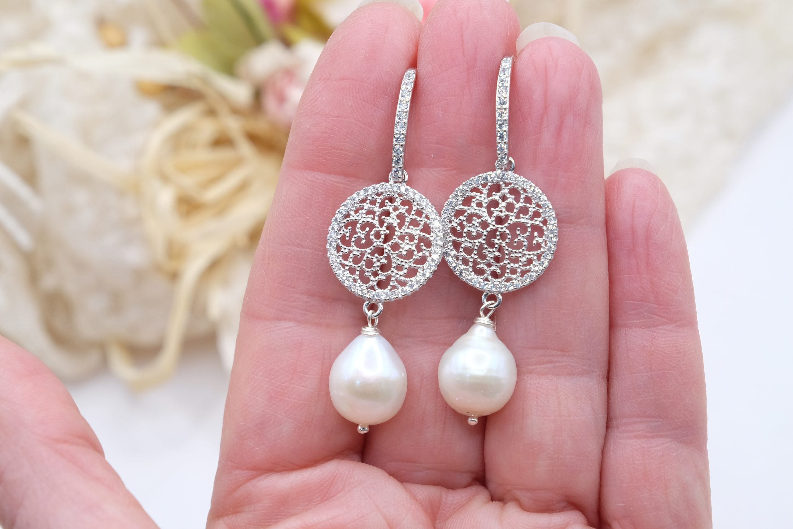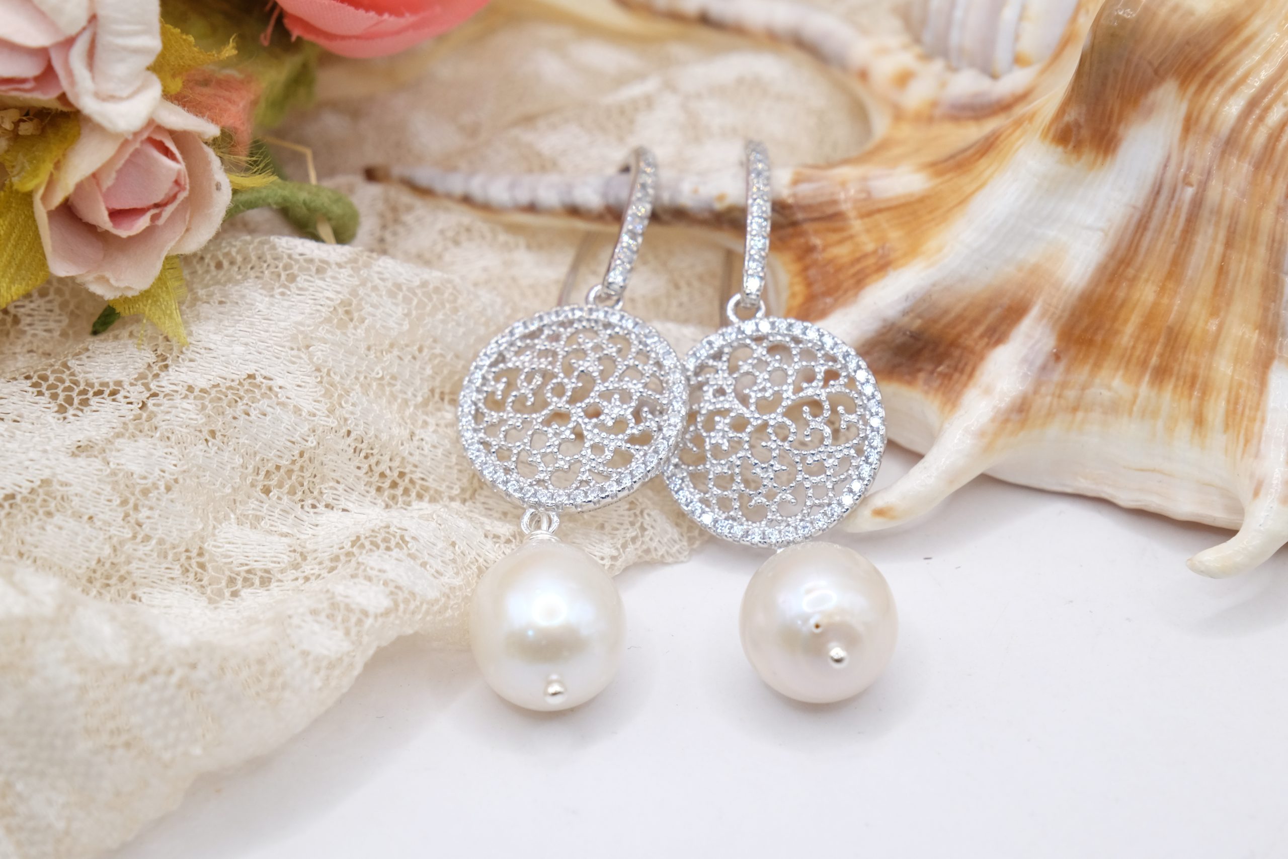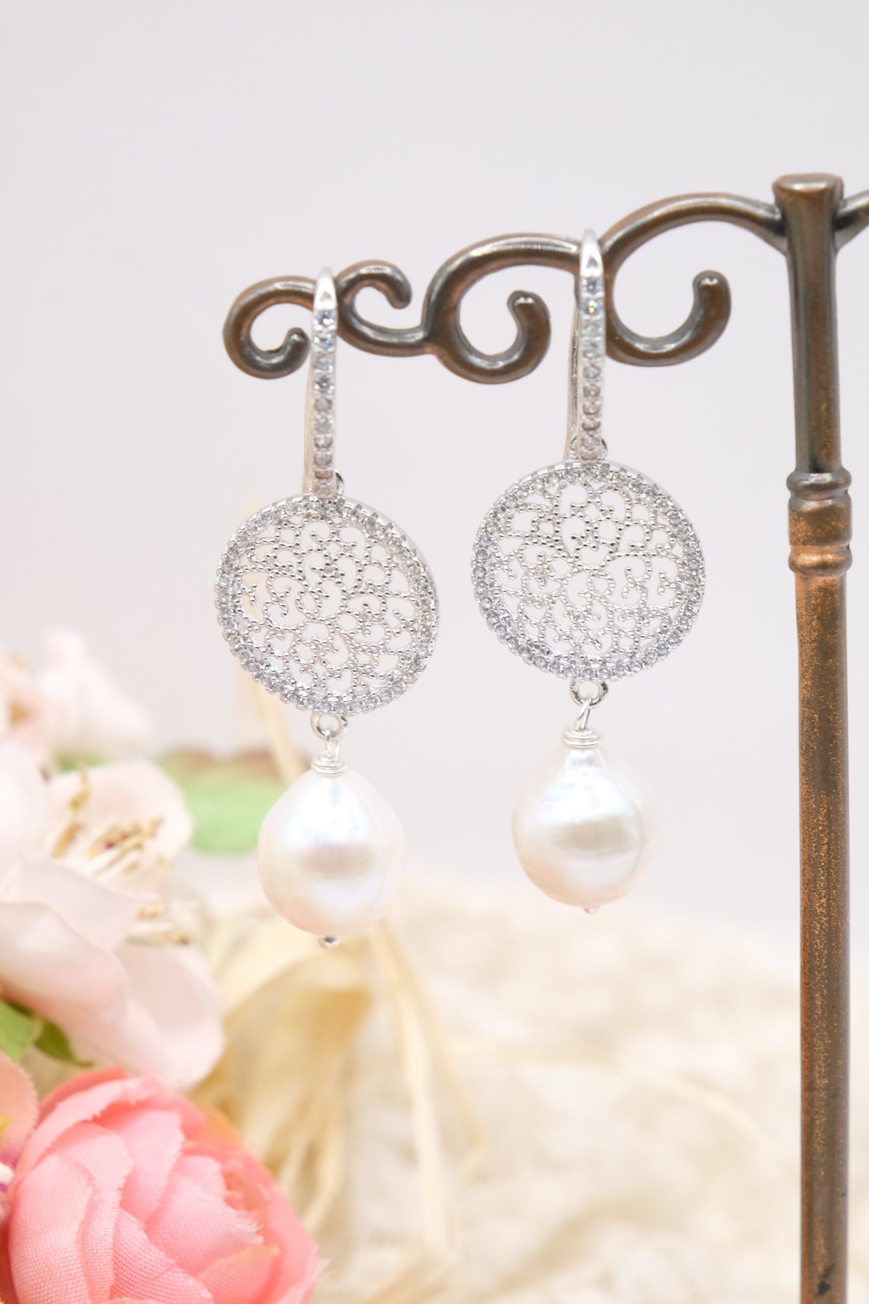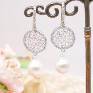 Orecchini con luminose perle barocche bianche e cerchi a filigrana in argento 925 tempestato di zirconi