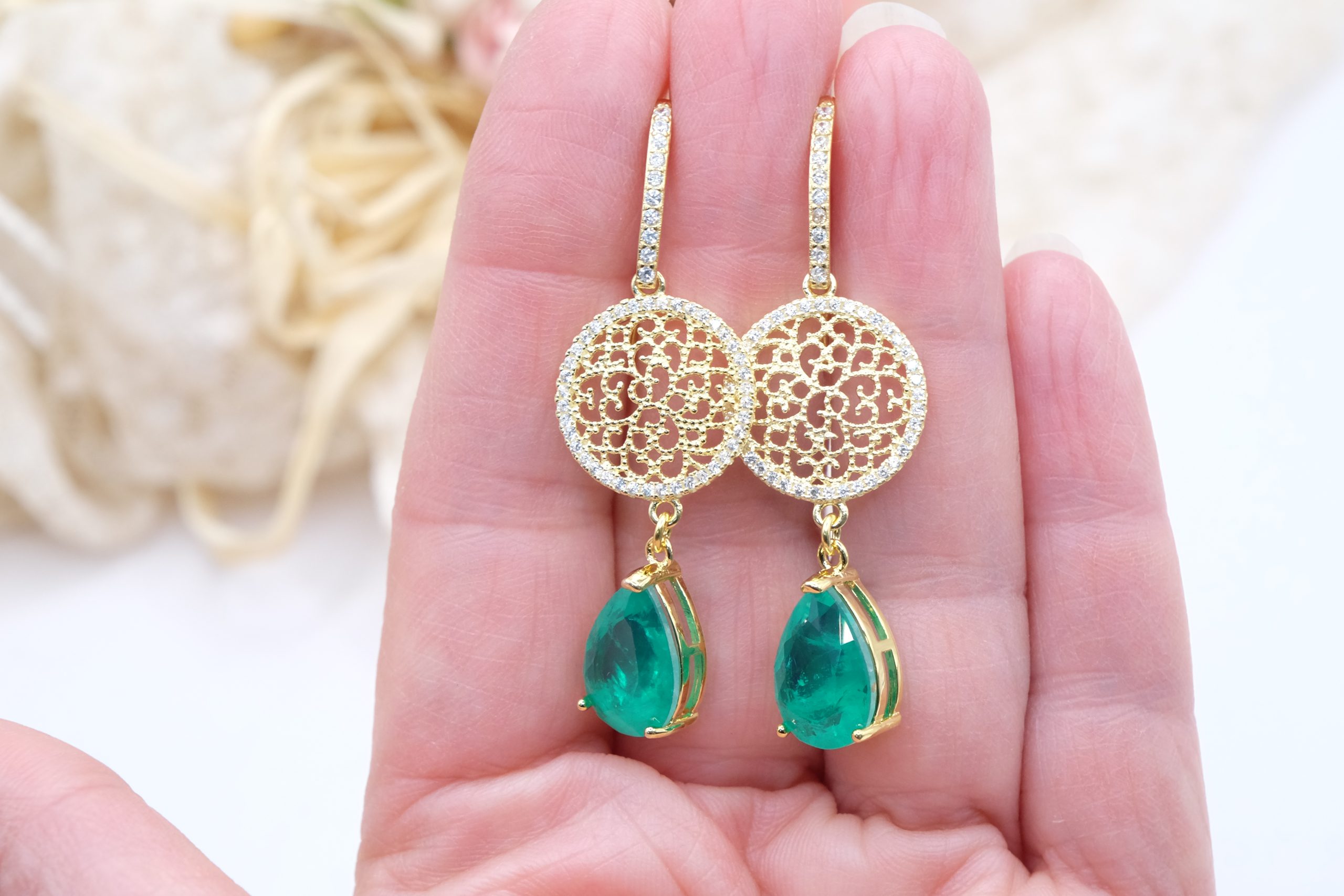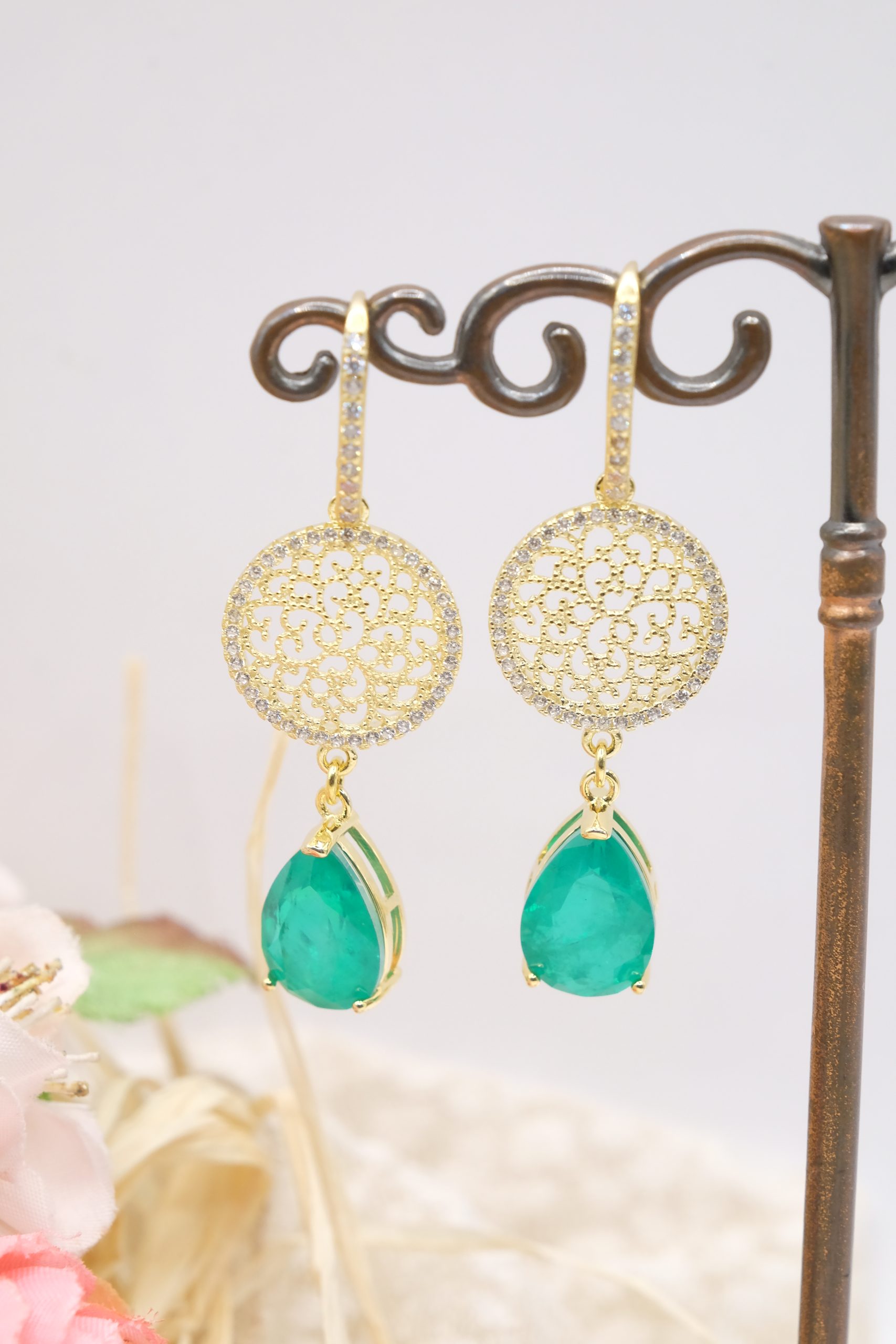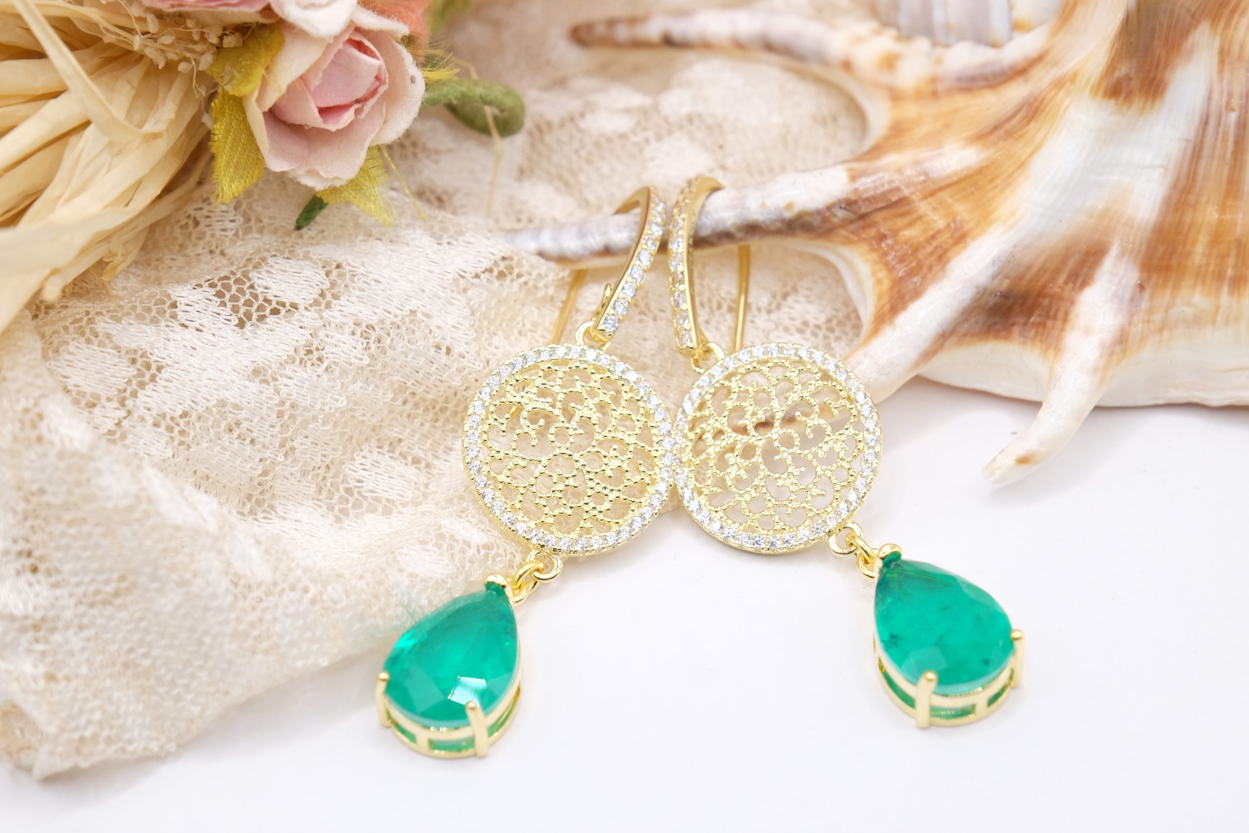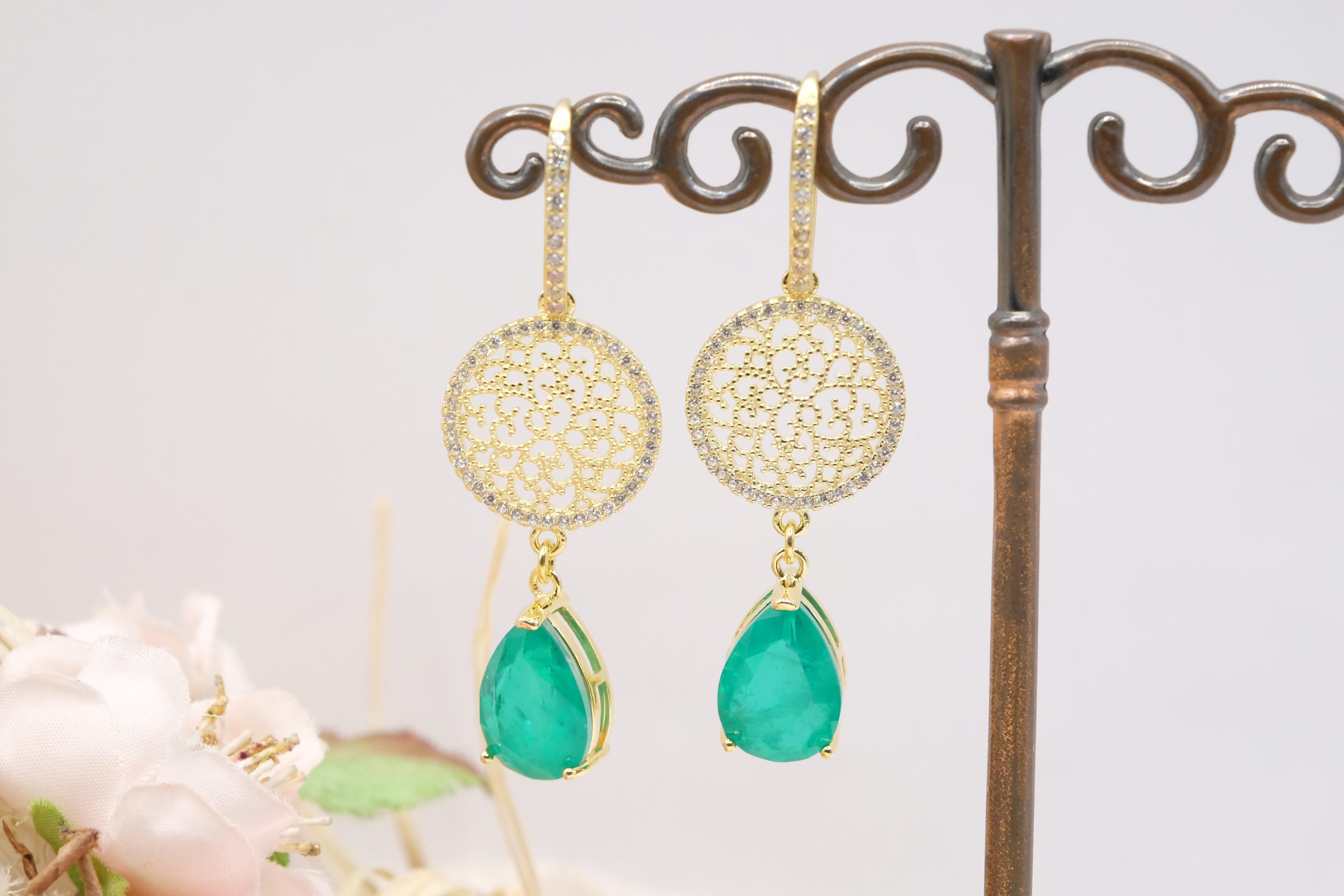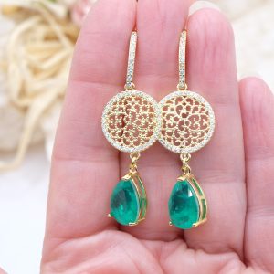 Orecchini con luminose gocce in quarzo verde e cerchio a filigrana in argento 925 placcato oro tempestato di zirconi