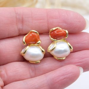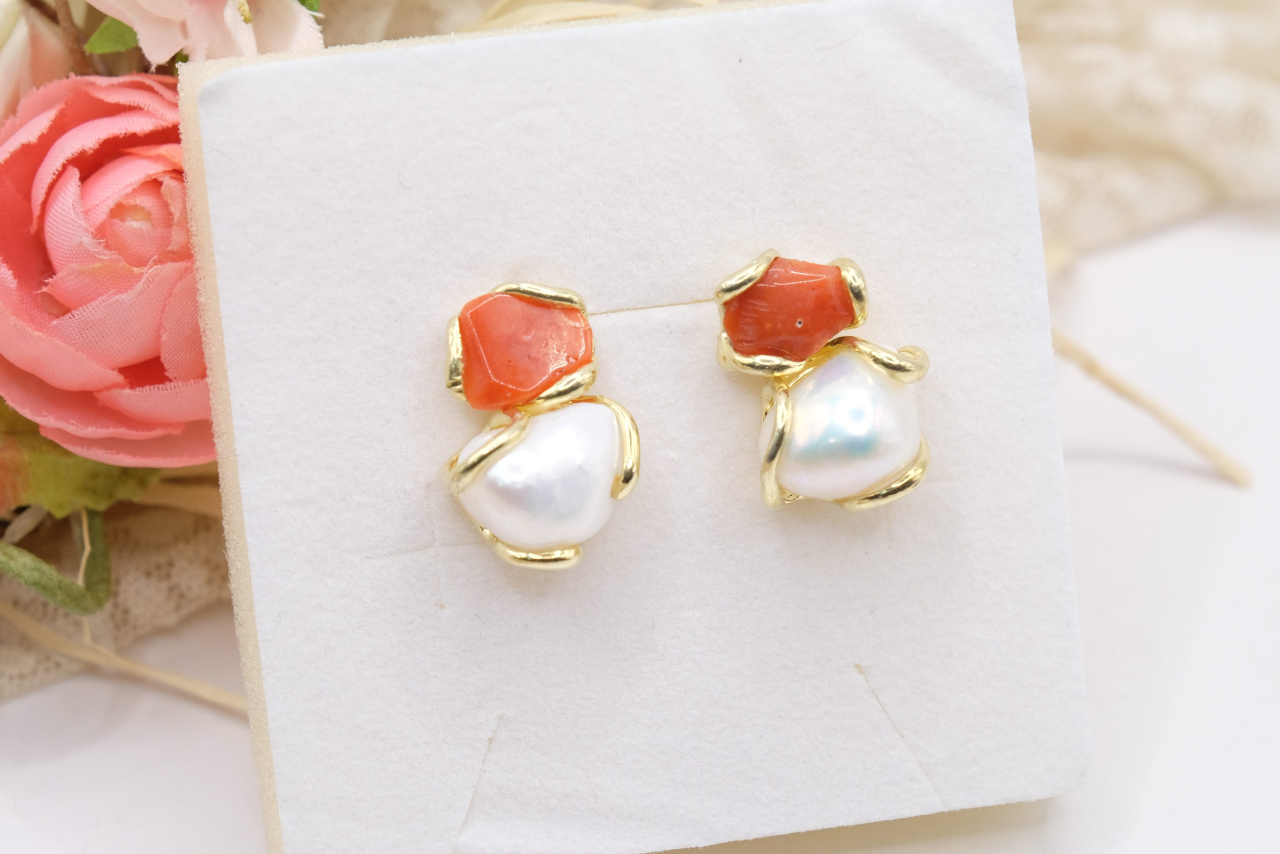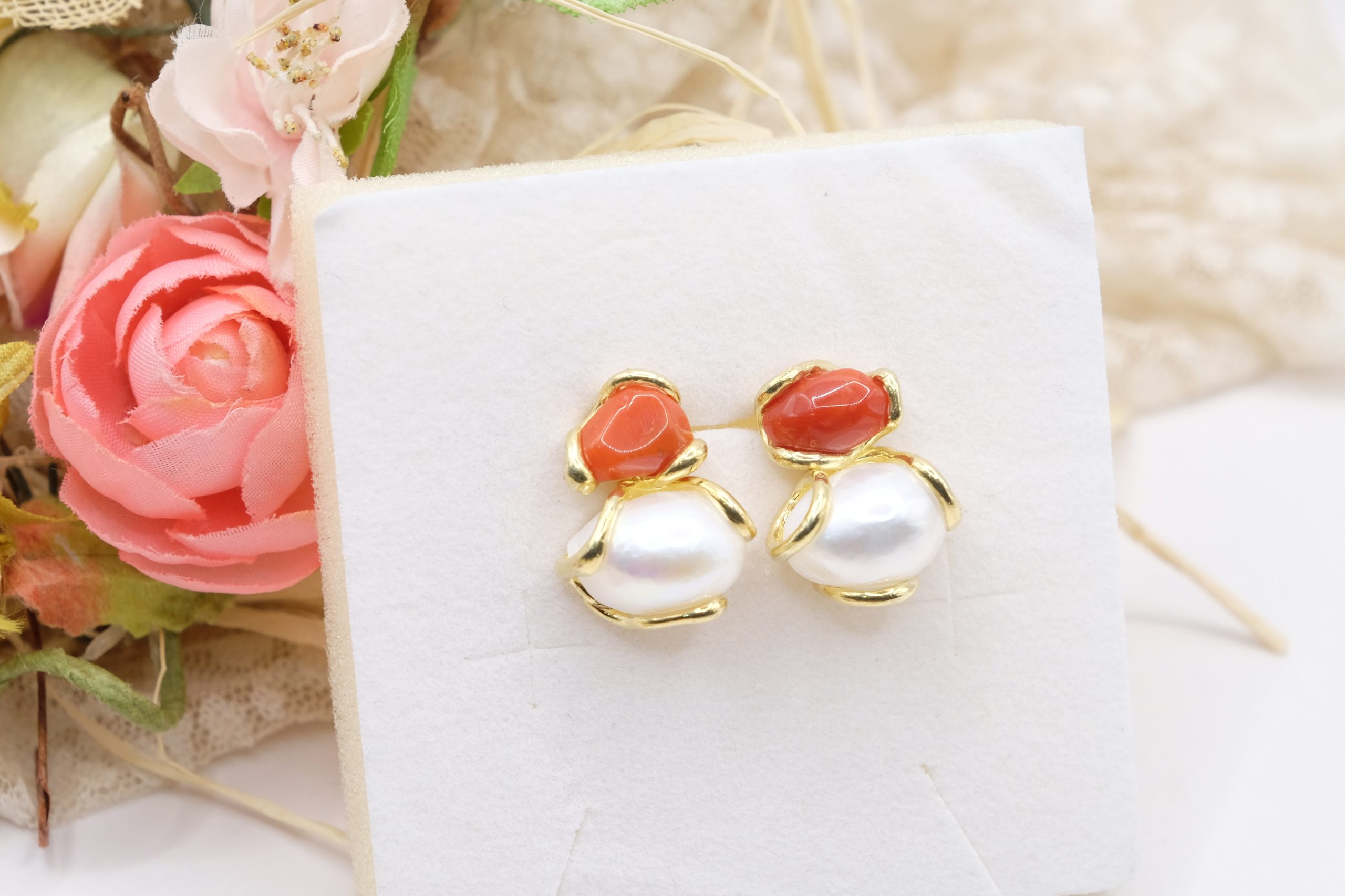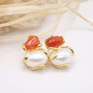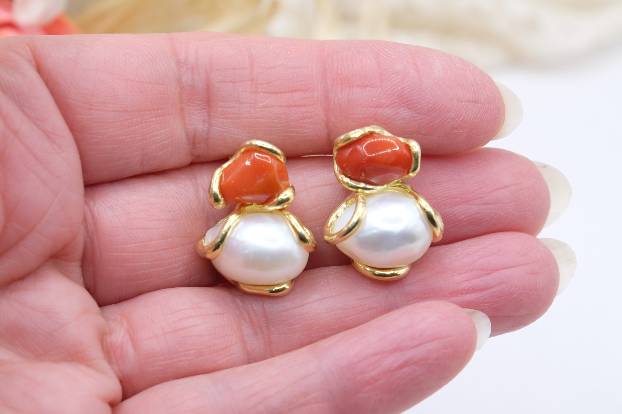 Orecchini con preziosi sassi di corallo rosso naturale del mediterraneo e perle cicciotte naturali, con perno, farfalla e montatura in