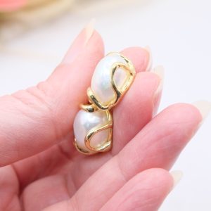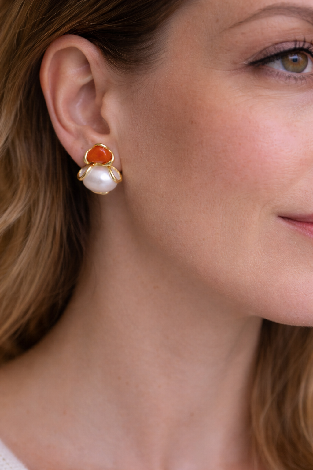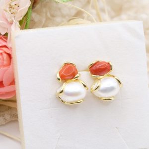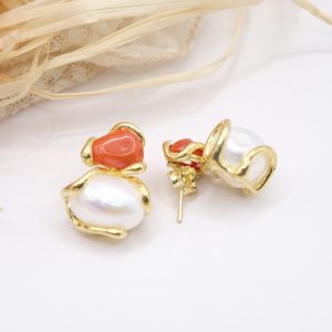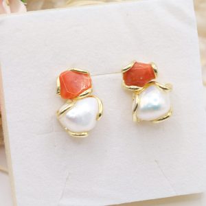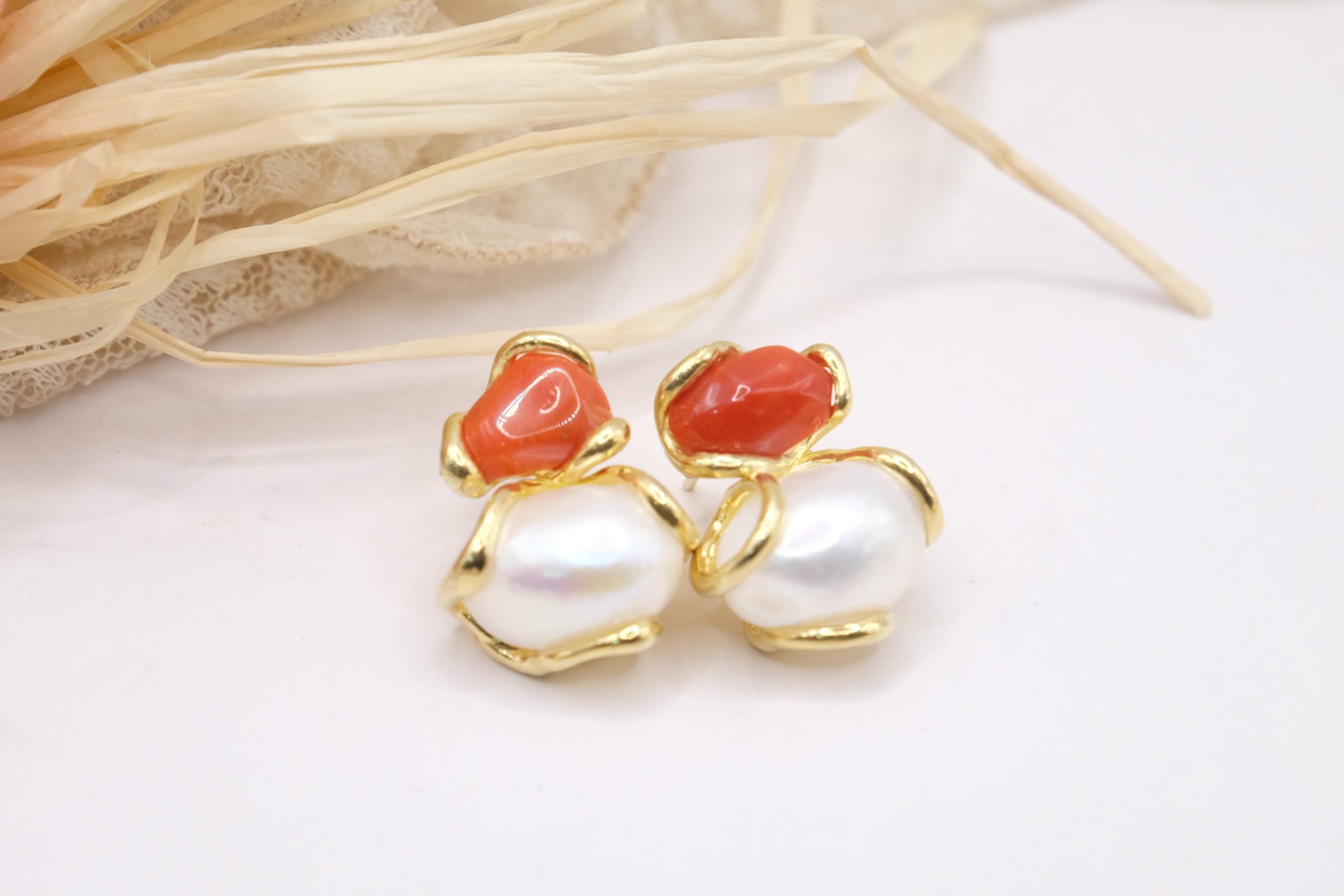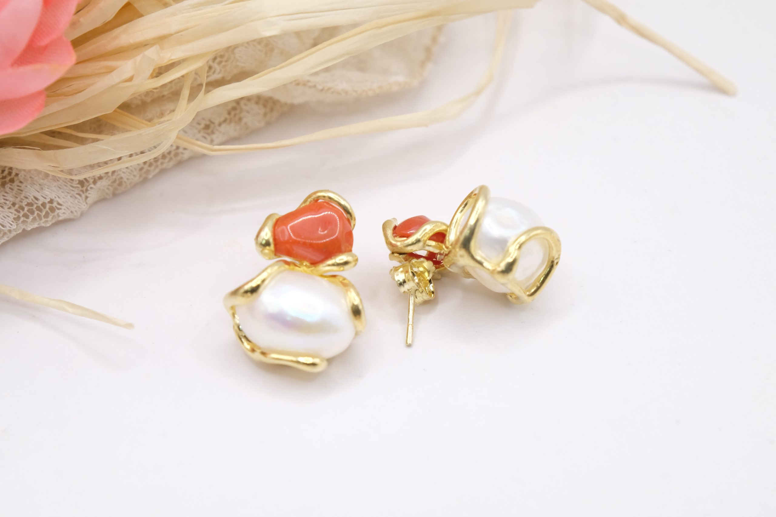 Orecchini con preziosi sassi di corallo rosso naturale del mediterraneo e perle cicciotte naturali, con perno, farfalla e montatura in