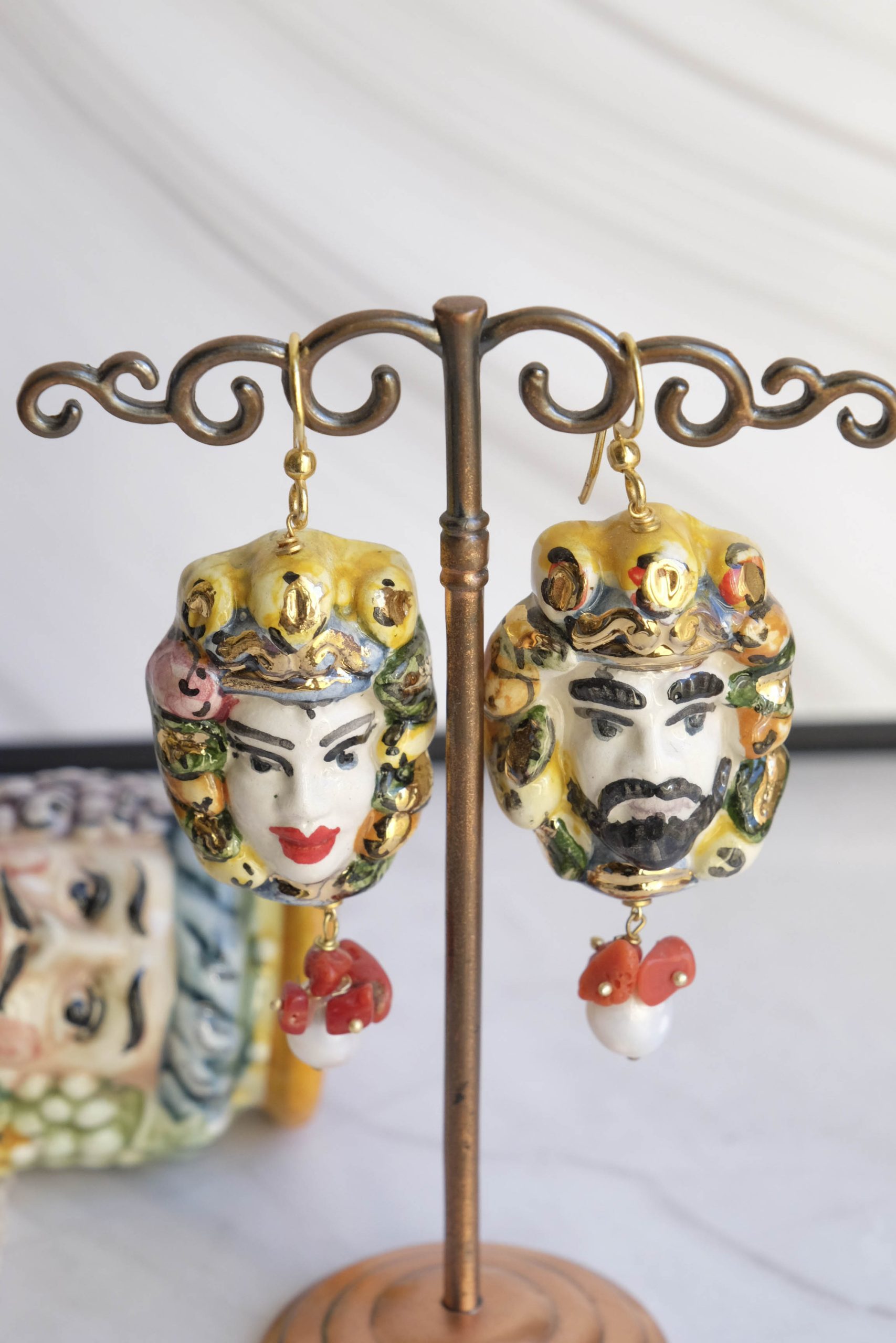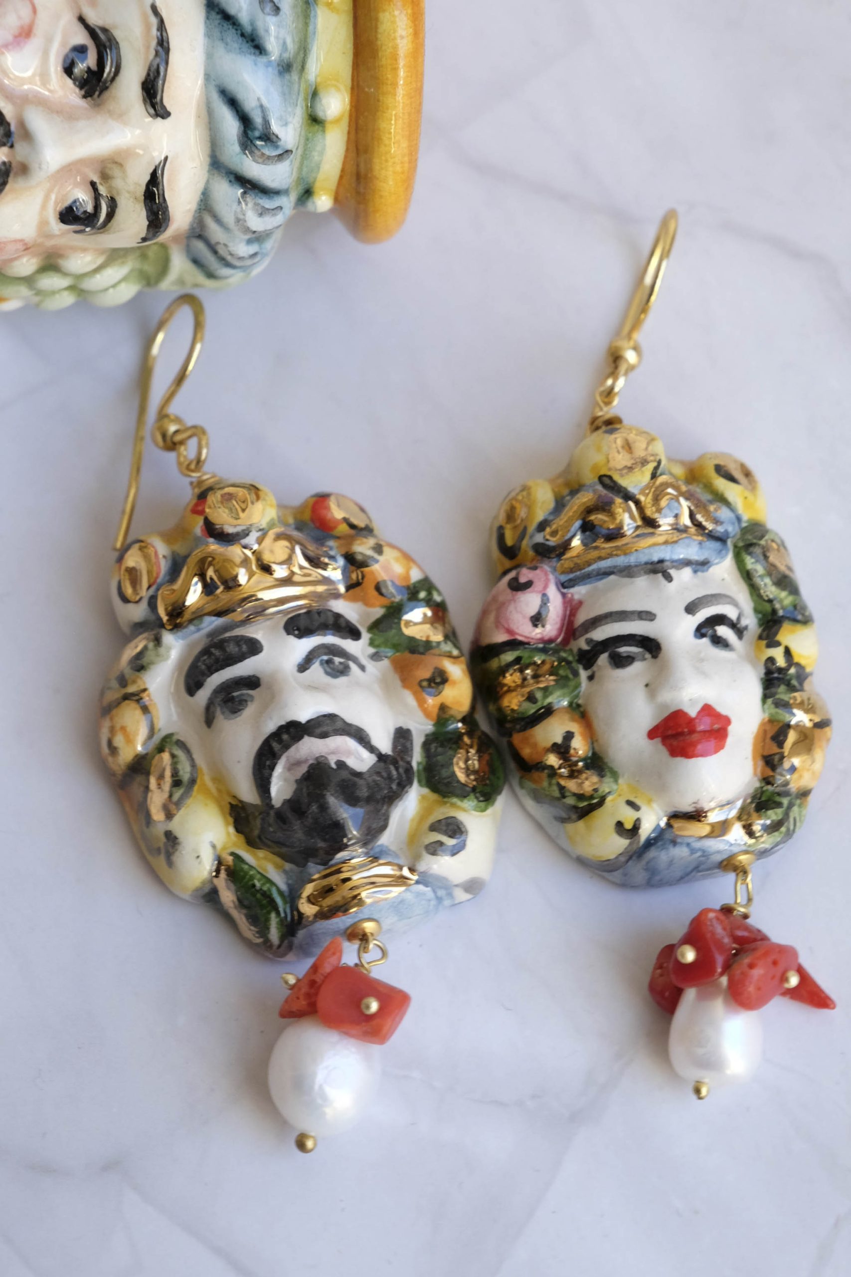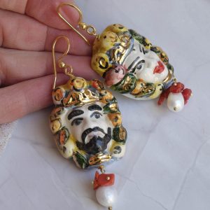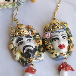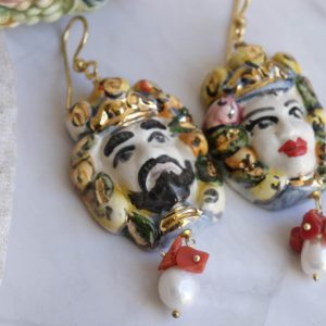 Orecchini siciliani Teste di Moro (uomo e donna) in ceramica di Caltagirone, da 3,6 x 2,7 cm, rifinite nei minimi dettagli, con applicazioni in foglia d’oro a 22 kt, e grappolino finale in corallo naturale e perle naturali.