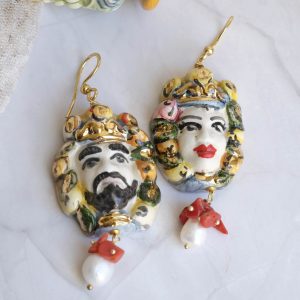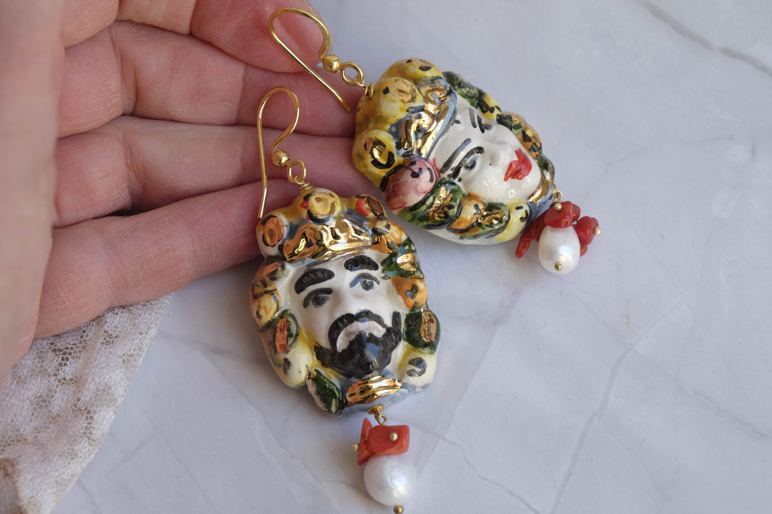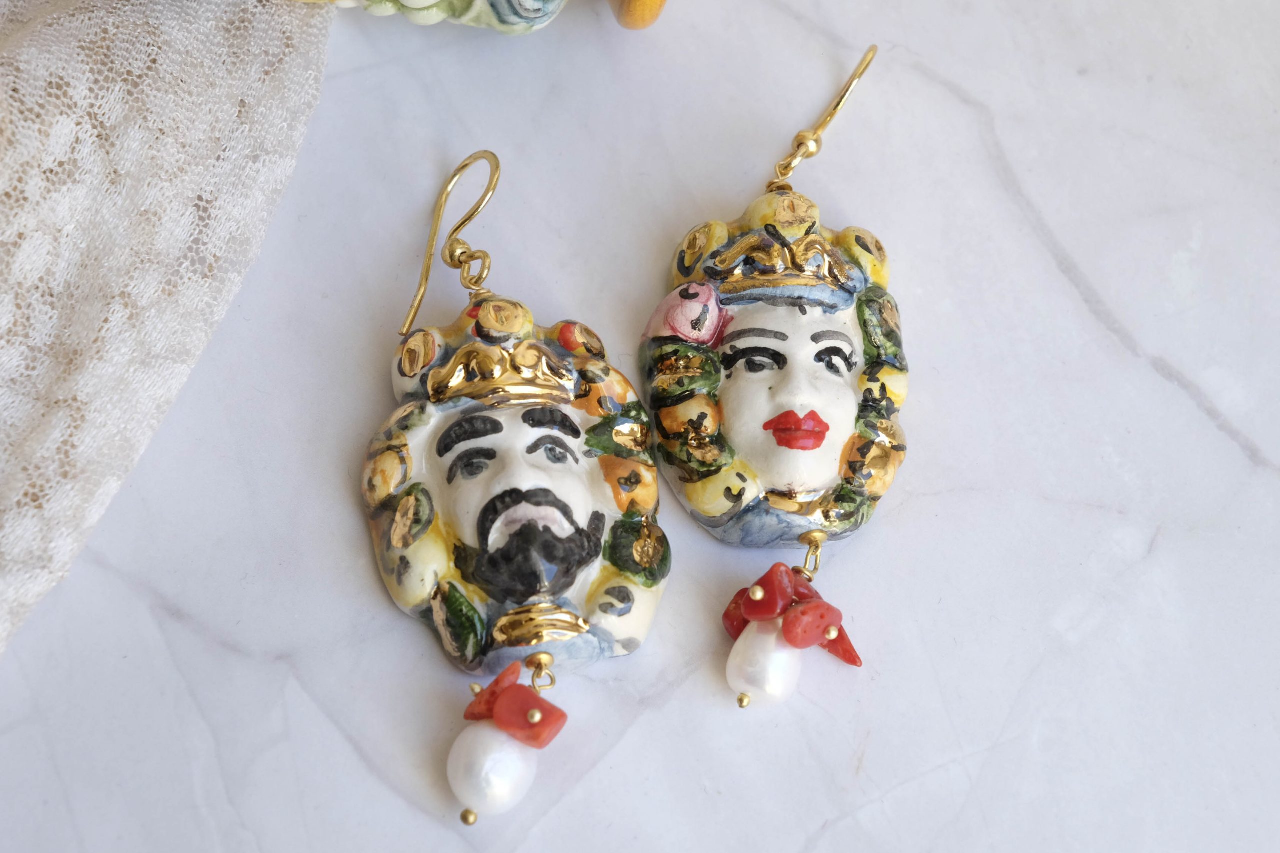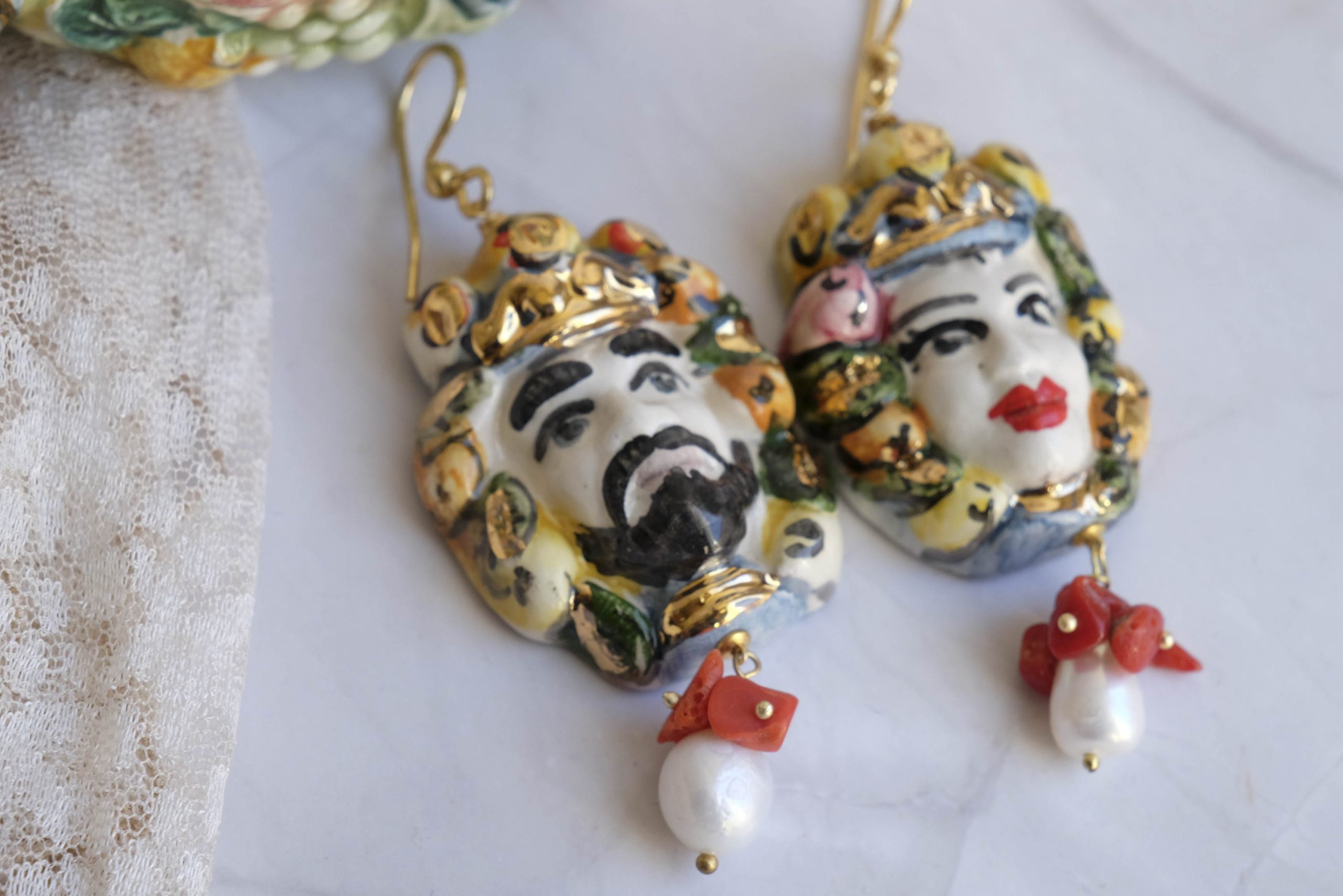 Orecchini siciliani Teste di Moro (uomo e donna) in ceramica di Caltagirone, da 3,6 x 2,7 cm, rifinite nei minimi dettagli, con applicazioni in foglia d’oro a 22 kt, e grappolino finale in corallo naturale e perle naturali.