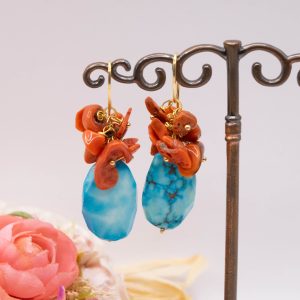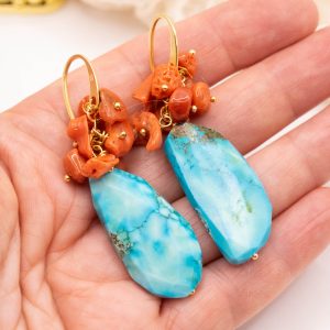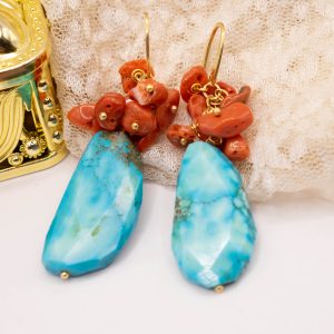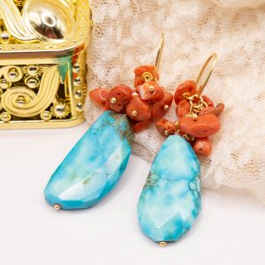 Orecchini con piastre di turchese afgano e grappolo di corallo del Mediterraneo