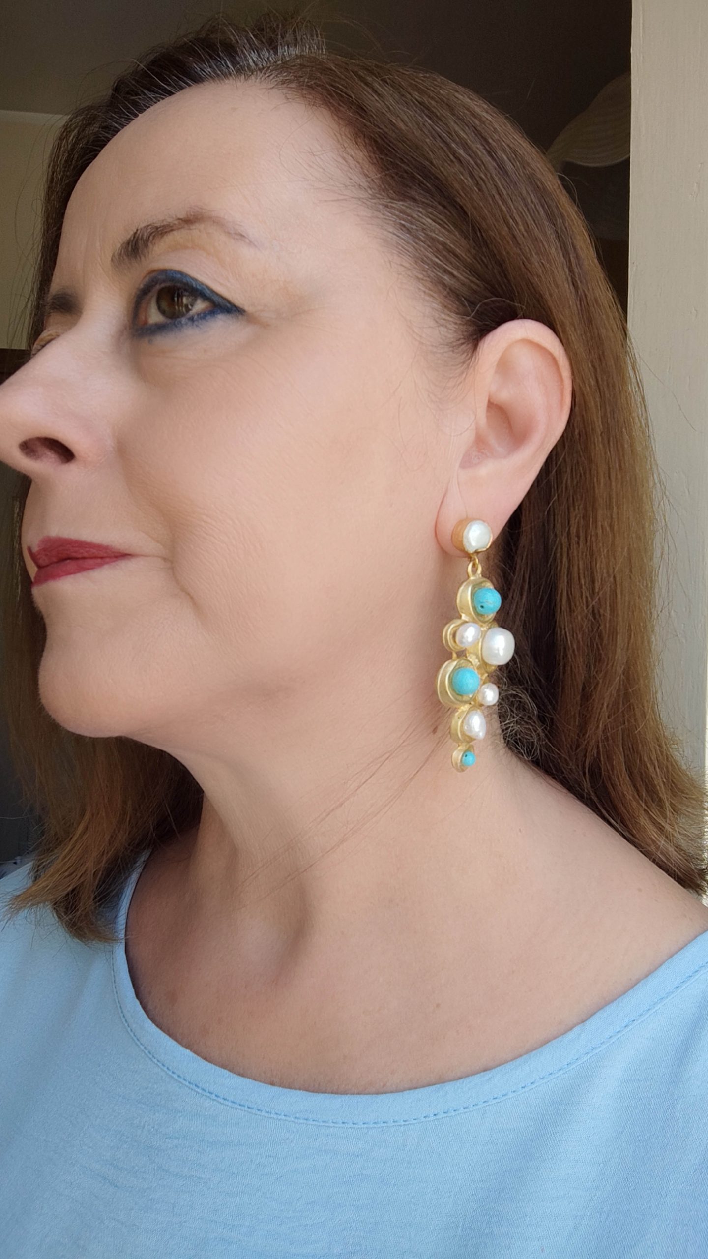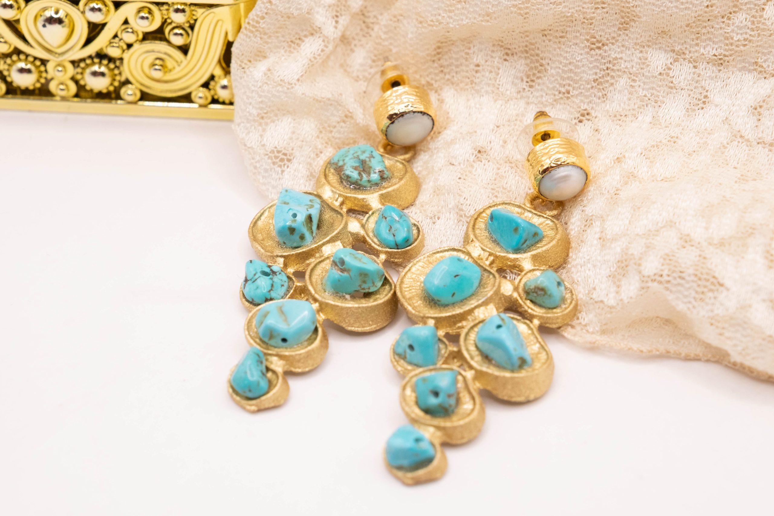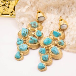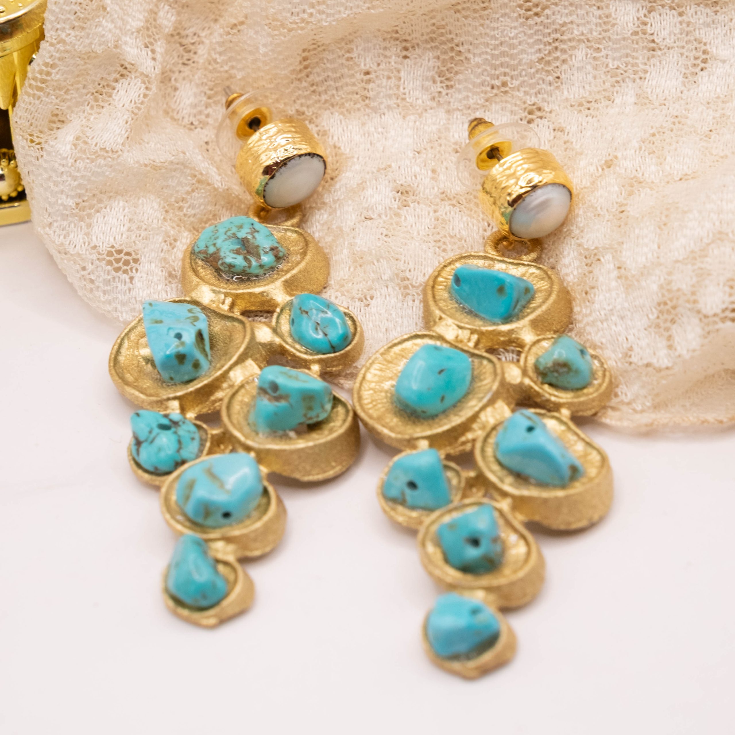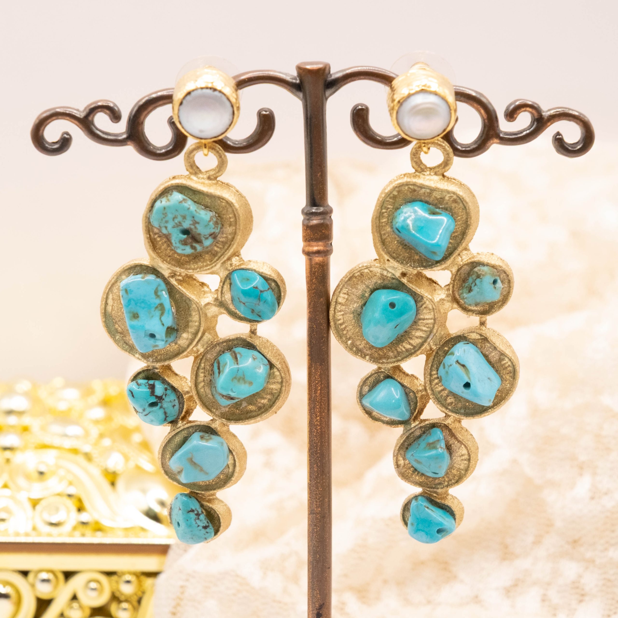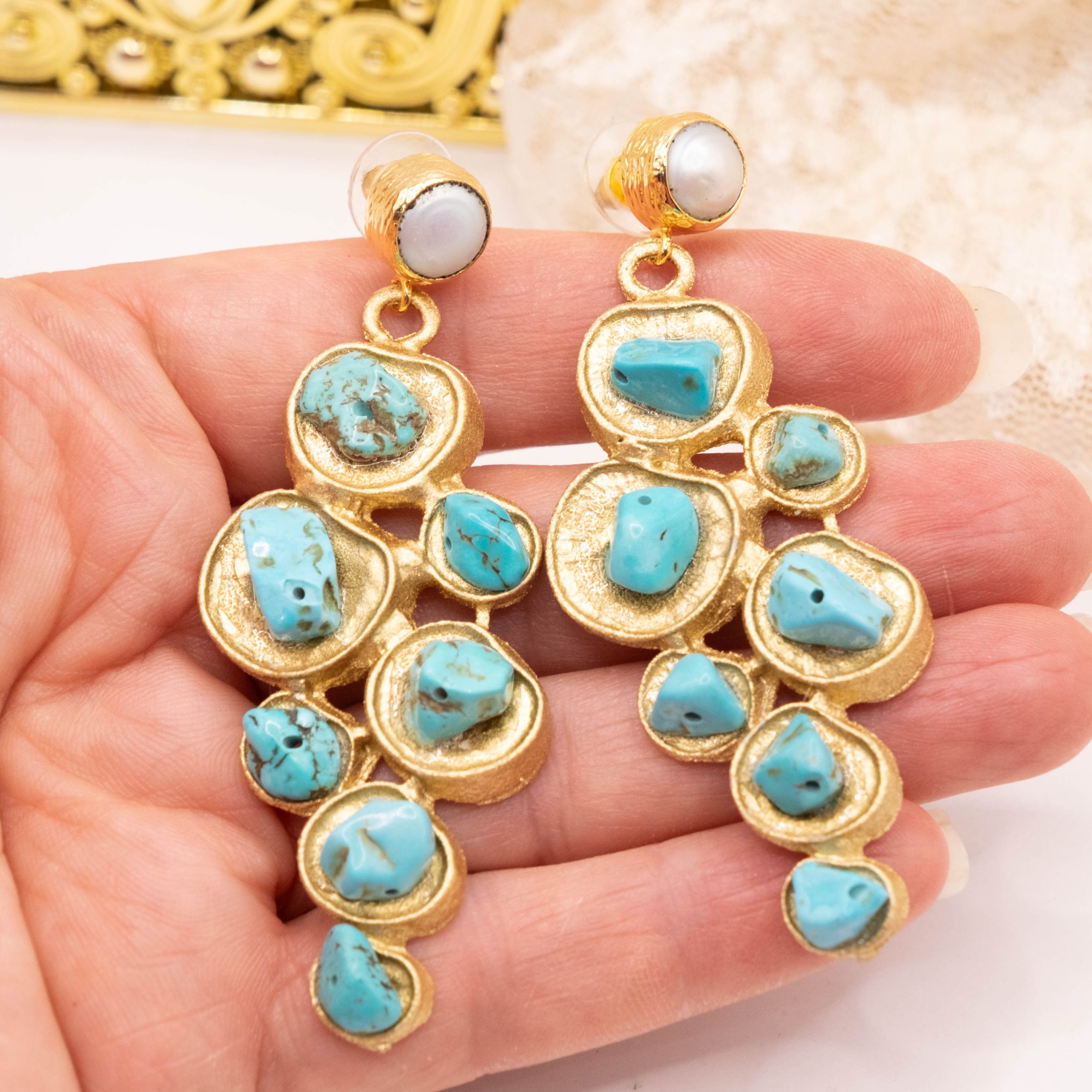 Bellissimi orecchini pendenti geometrici, in ottone laminato oro con turchese naturale